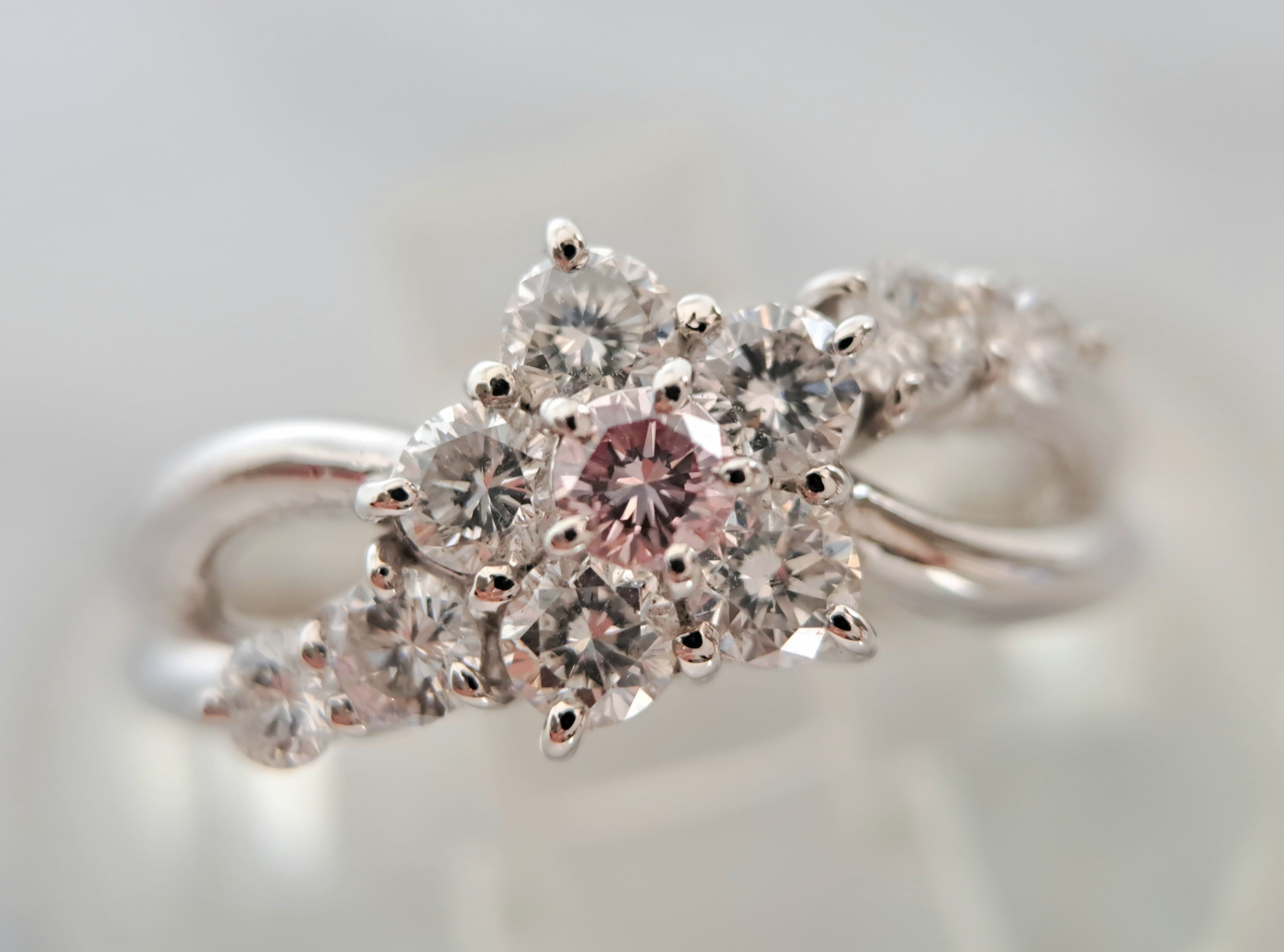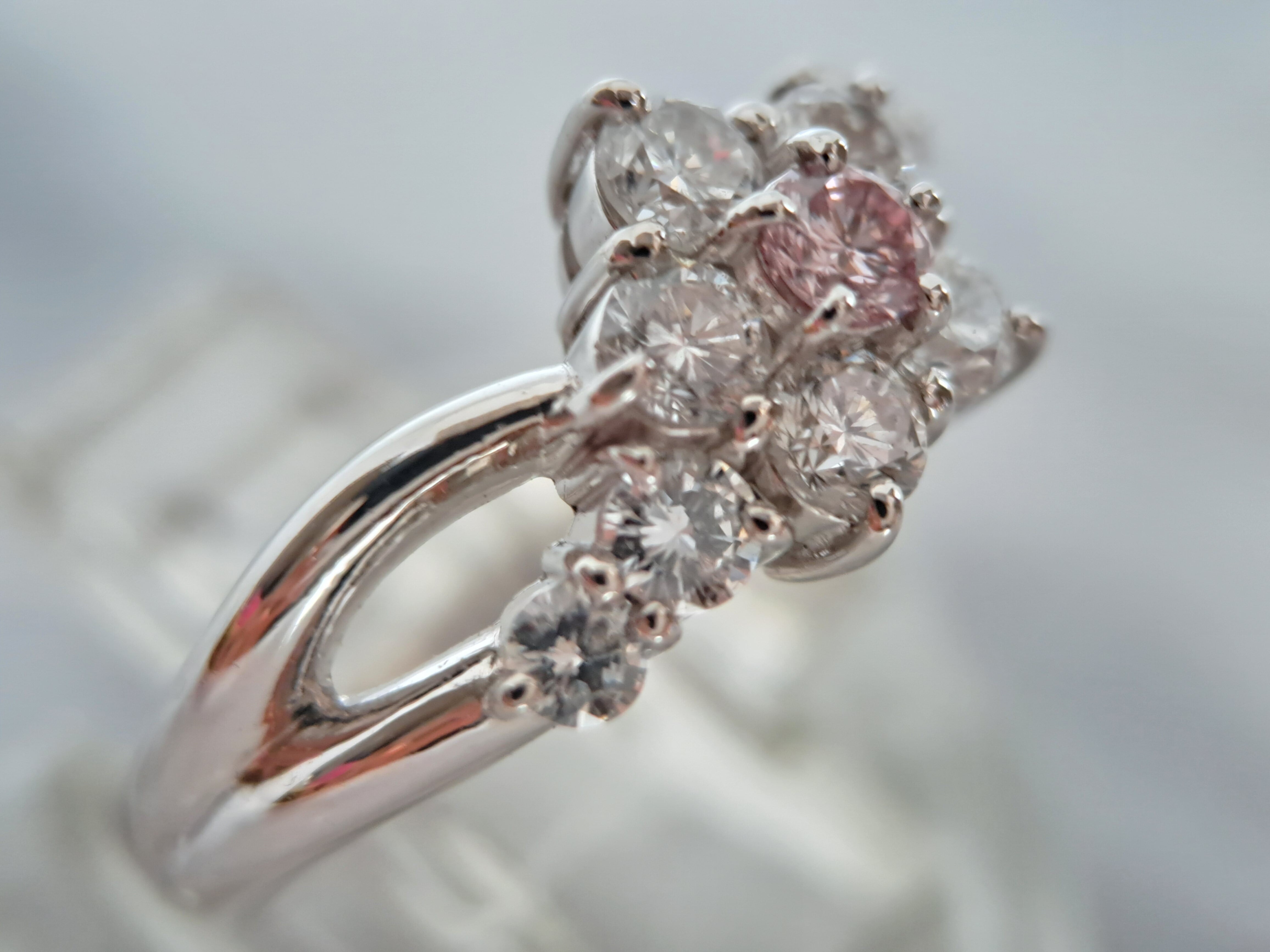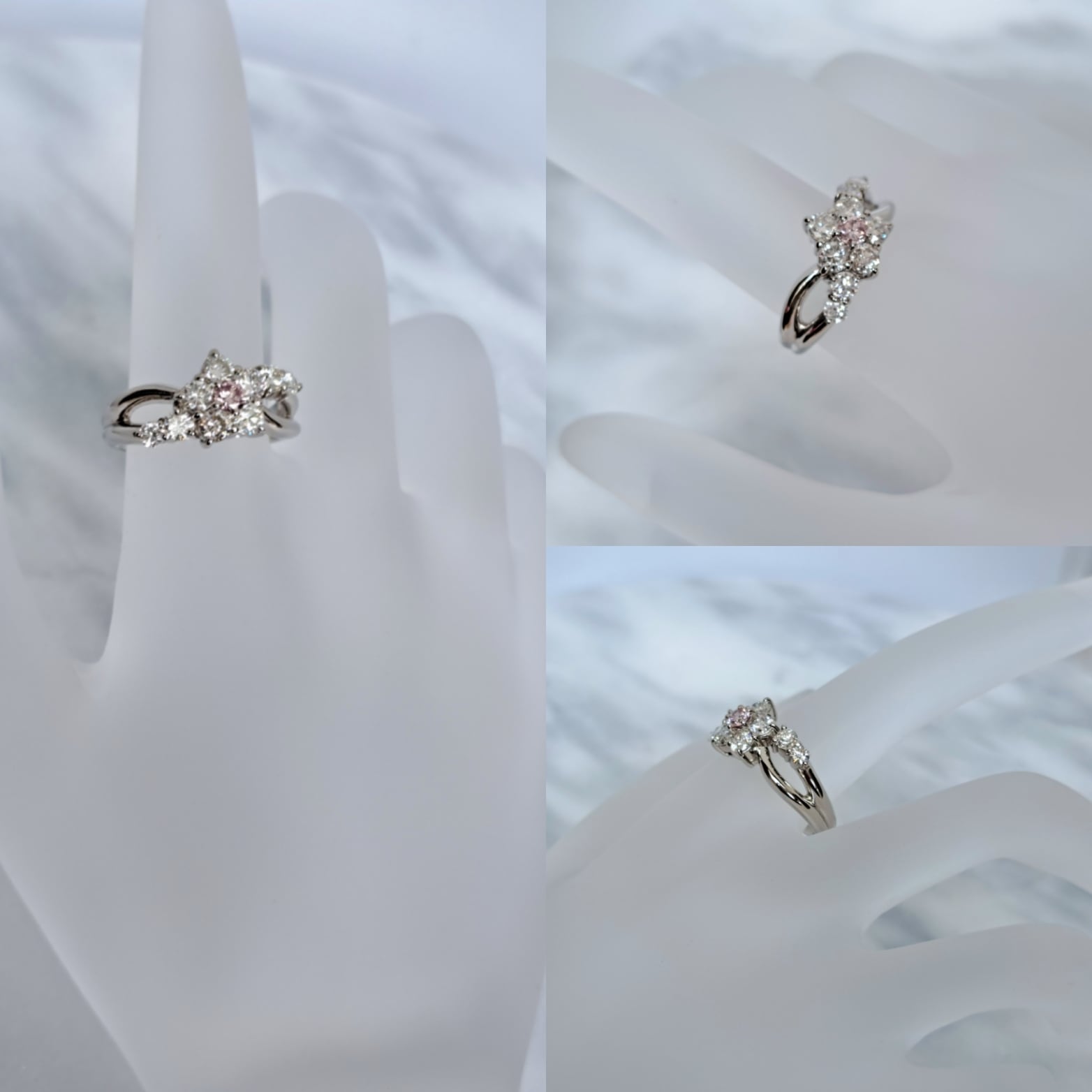 綺麗で上質なピンクダイヤモンドをメインに、取巻きラージメレや流れるデザインの腕にもひじょうに高品質な美しいダイヤモンドをあしらい、プラチナを贅沢に使用した素敵なフラワーリングをご紹介します。