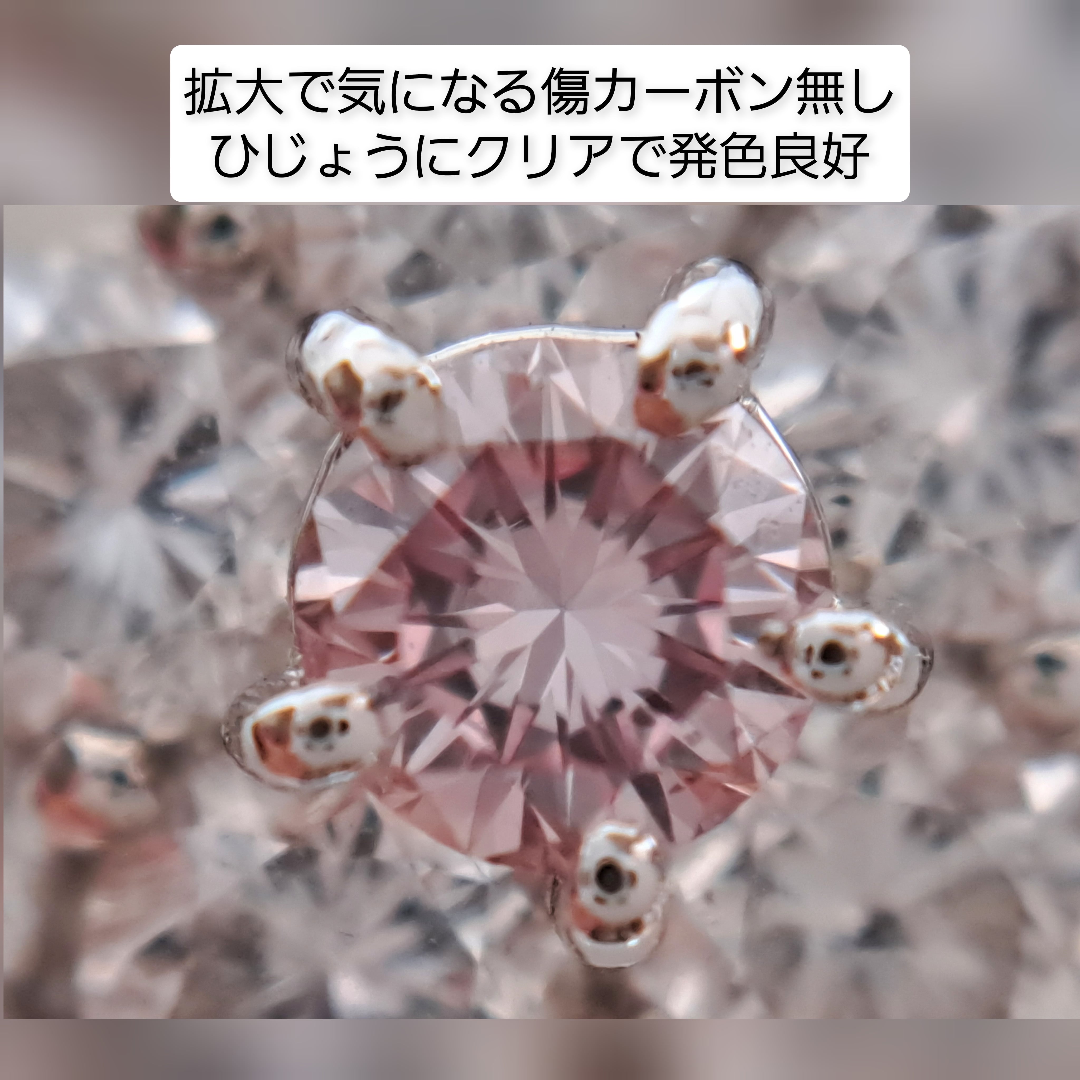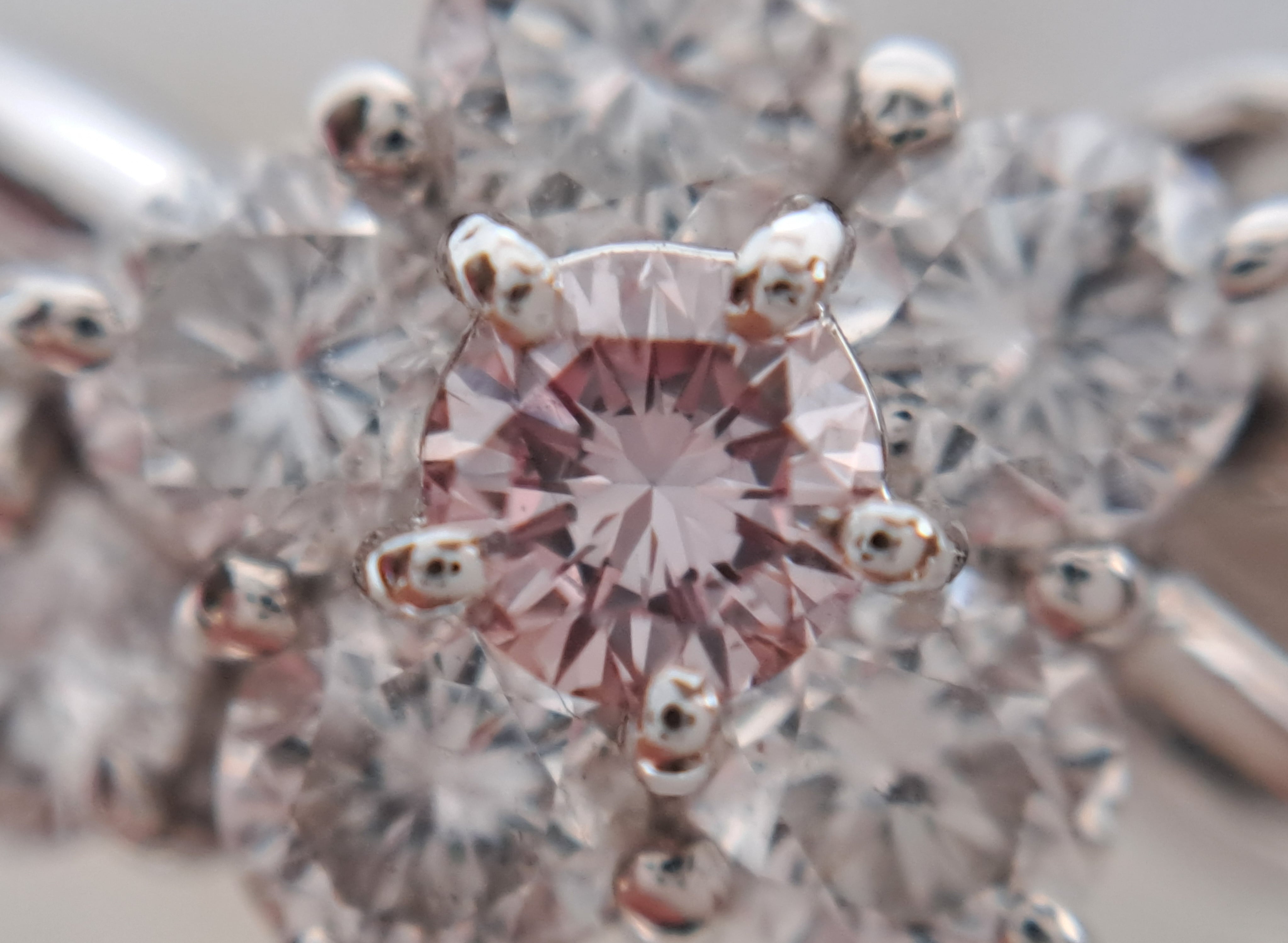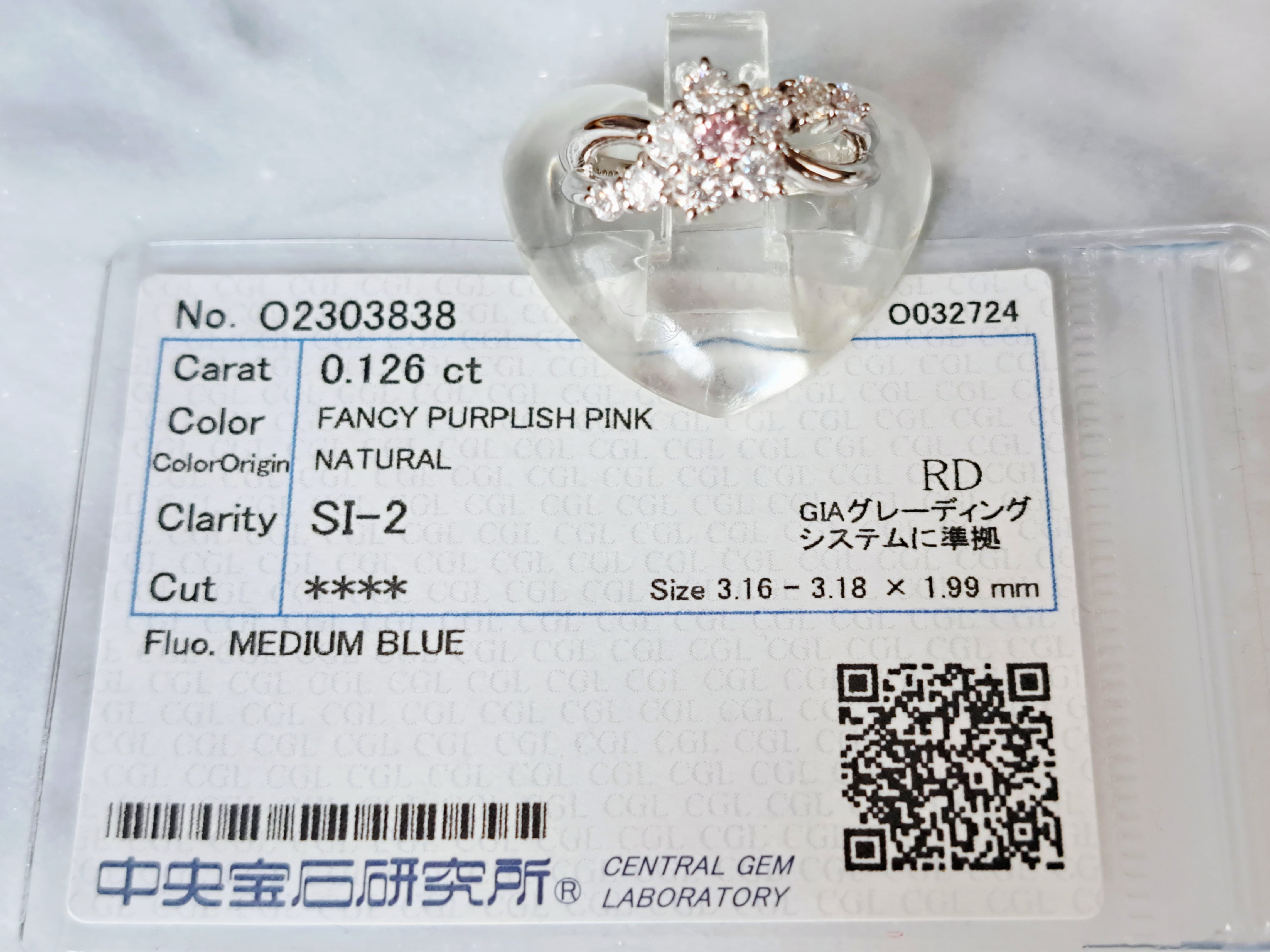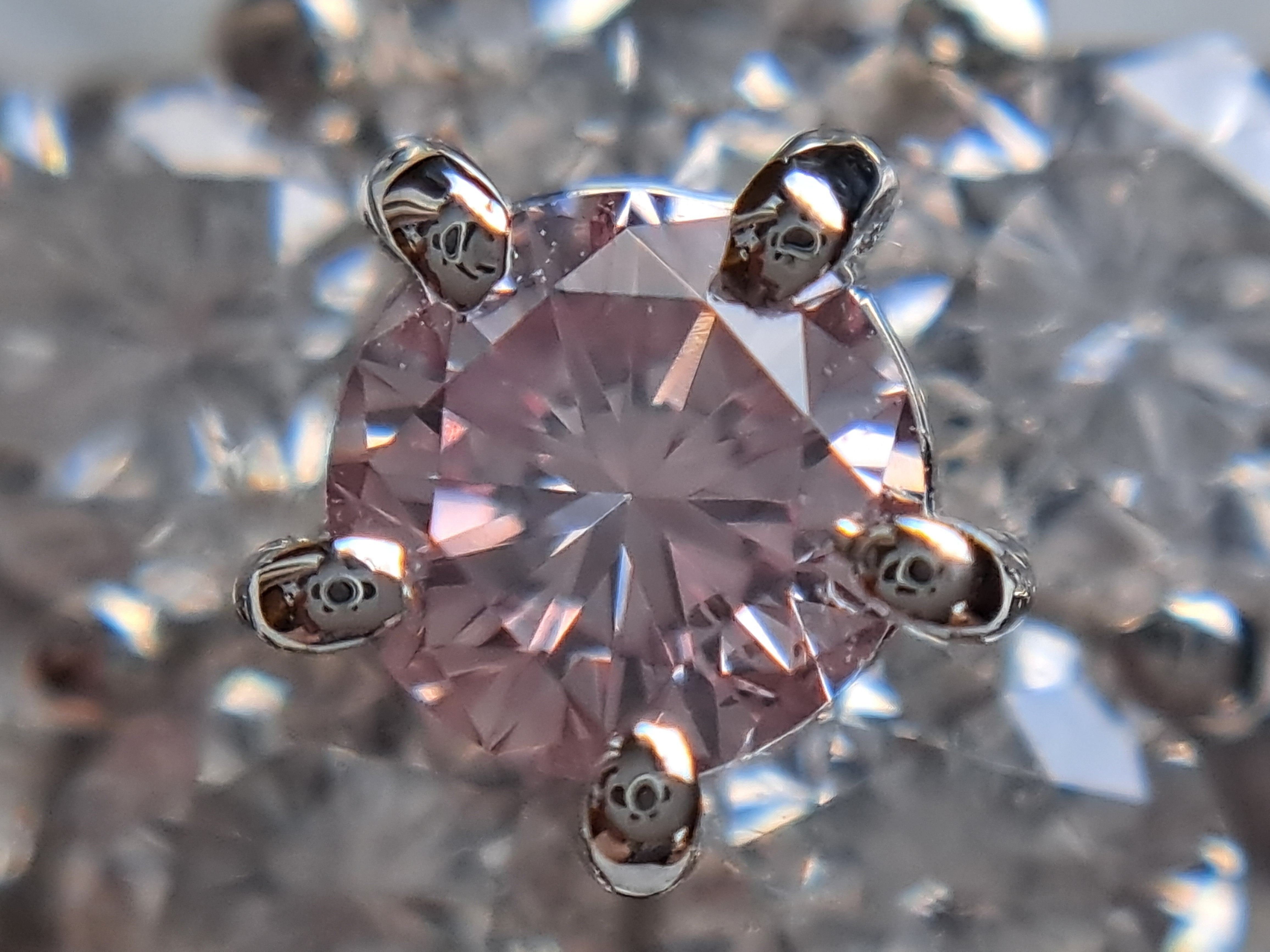 メインは0.126ct fancy purplish pink SI2、拡大で気になる傷、カーボン見当たらず、ひじょうにクリアで発色良好、美しい石です。色合いも一番人気の柔らかな紫を帯びたpurplish、すっきりと爽やかで愛らしい色調が美しい。