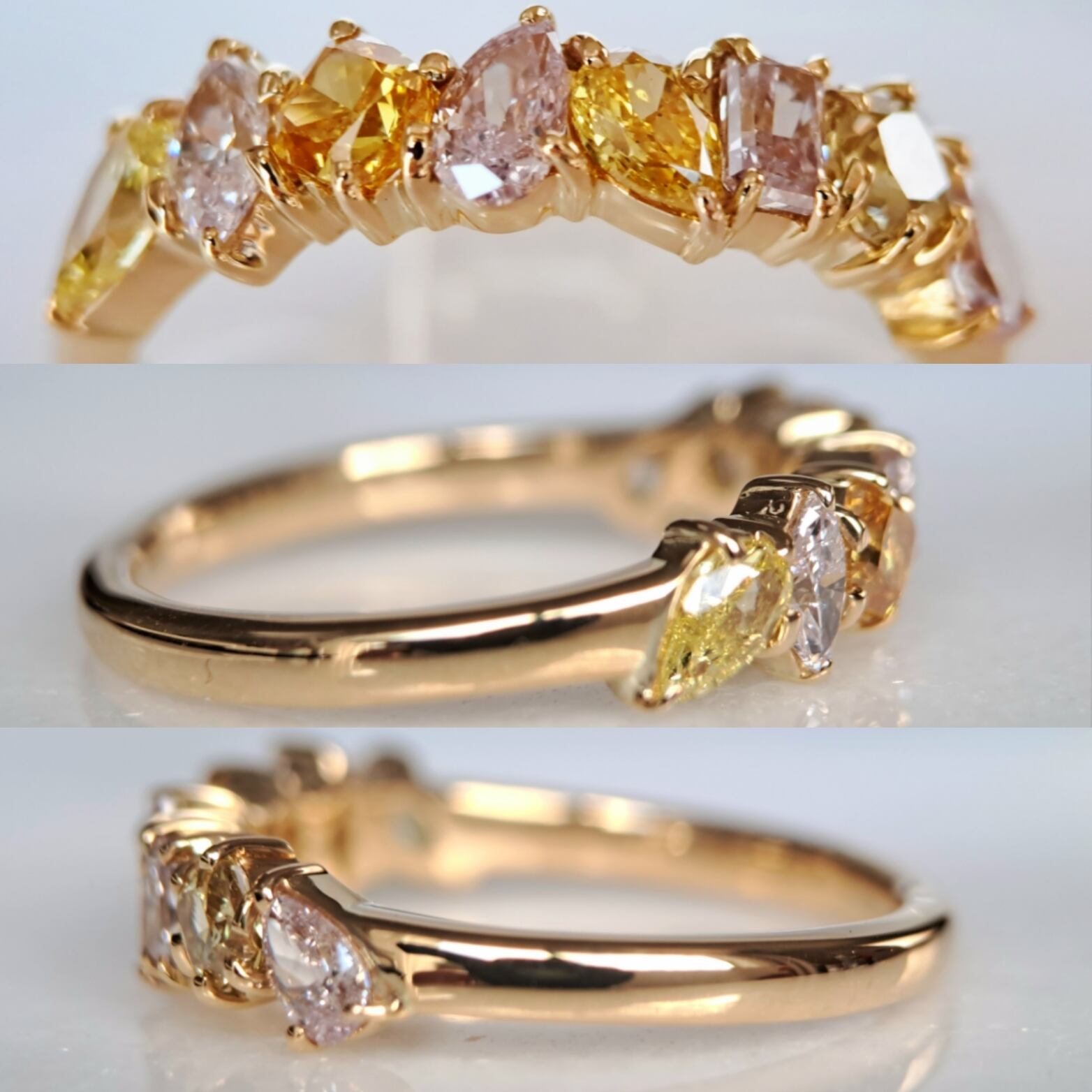 イエロー&ピンクの美しい極上のカラーダイヤモンドを総計1.331ctも贅沢にあしらったK18YGのリングは、身に着けるだけで気分が上がり、眺めればその美しさに心がときめく。「身に着ける人を幸せにする」そんな力があります。(8石というのも「末広がりの八」であり、アミュレットリングにも素敵に思います)