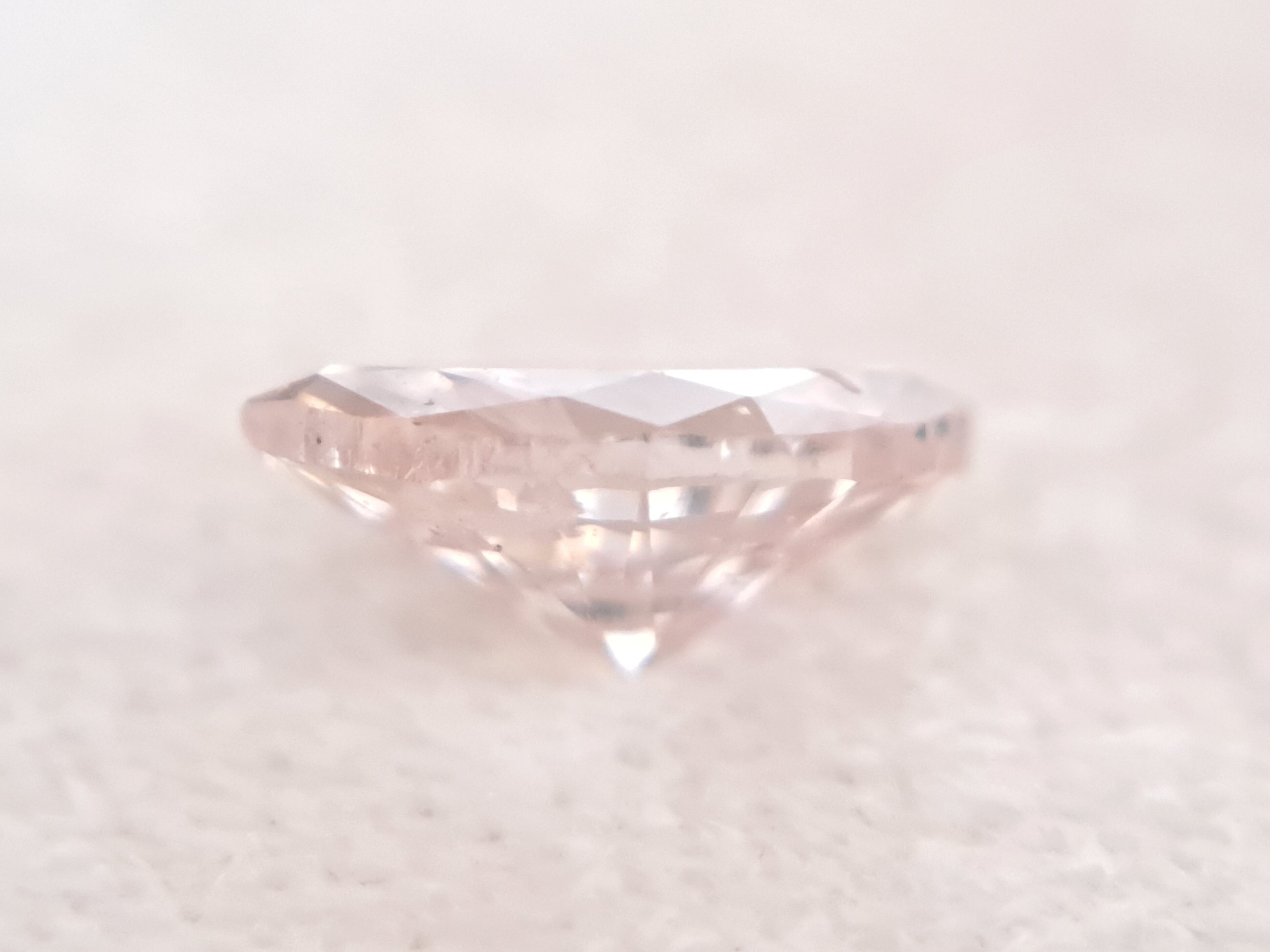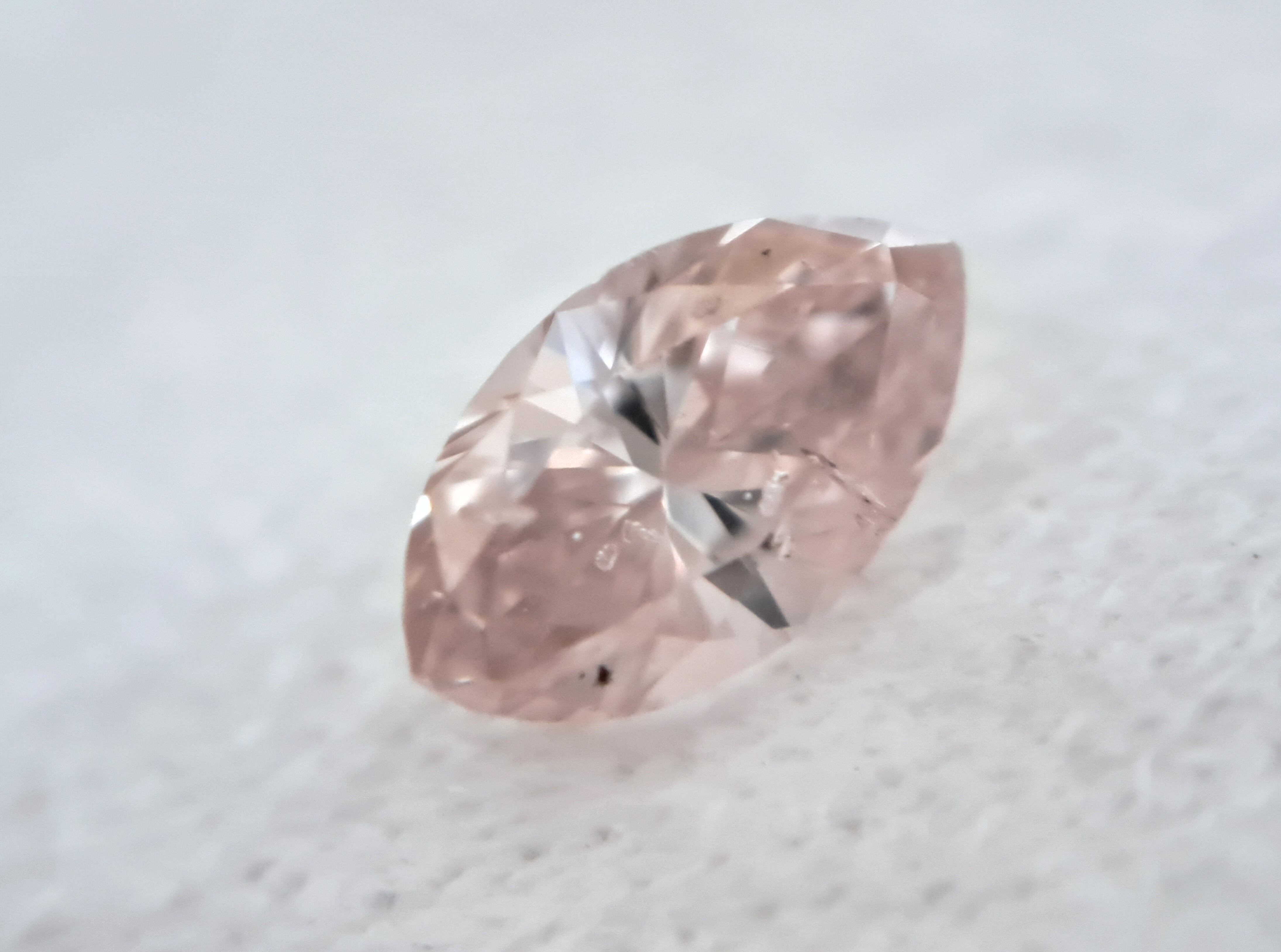 色はfancy light orangy pinkとオレンジみピンクですが、オレンジみの石の中には、ブラウンがかった褐色みを感じさせる石も多いのですが、こちらはそうした褐色みはなく、柔らかな桃のようなピーチピンク。fancy lightゆえ、無論fancyには及びませんが、fancy寄りと言って差し支えない印象のしっかりとしたピンクをお楽しみ頂けます。