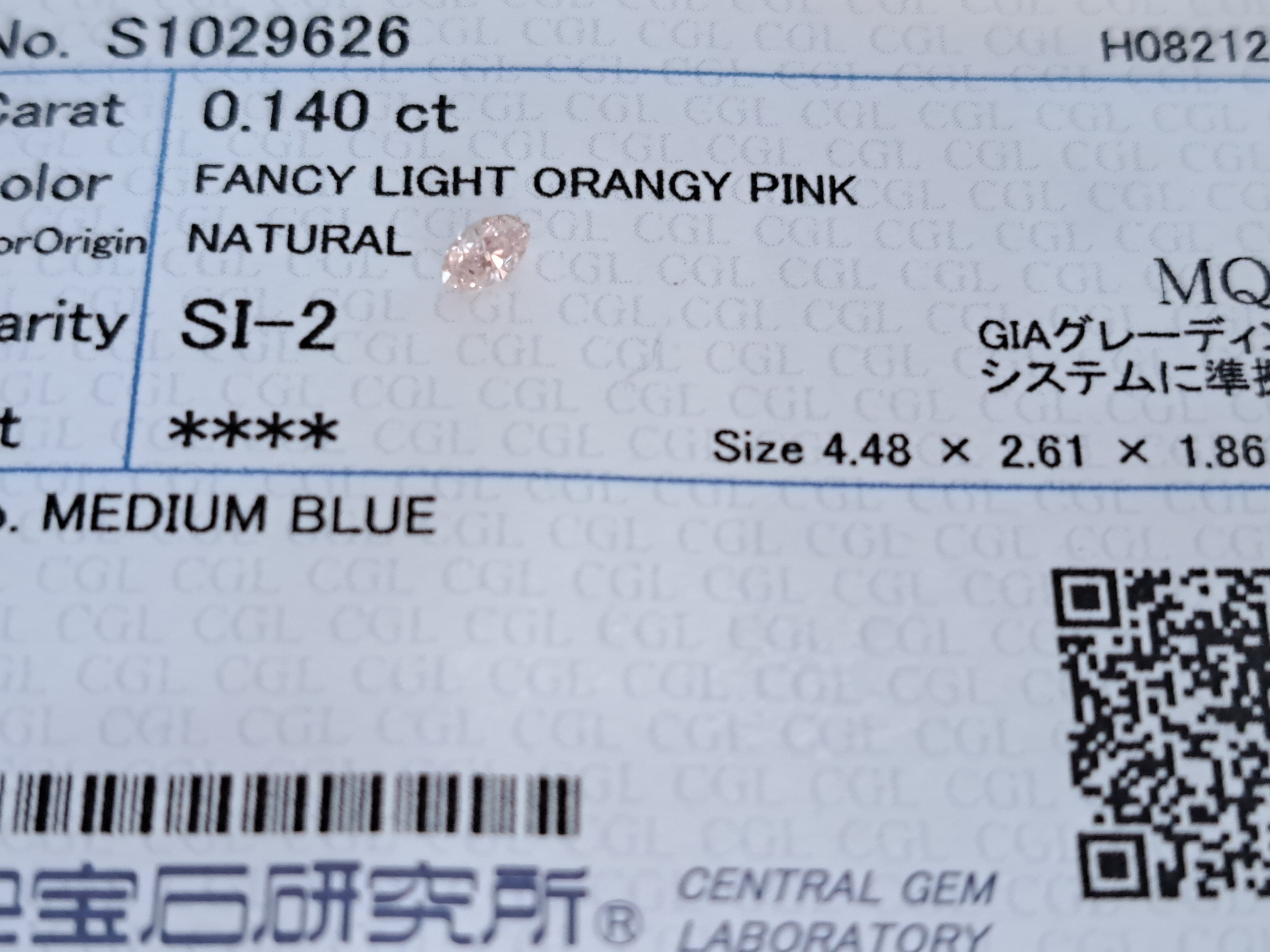 【商品名】(2)ピンクダイヤモンドルース 0.140ct fancy light orangy pink SI2(CGL)