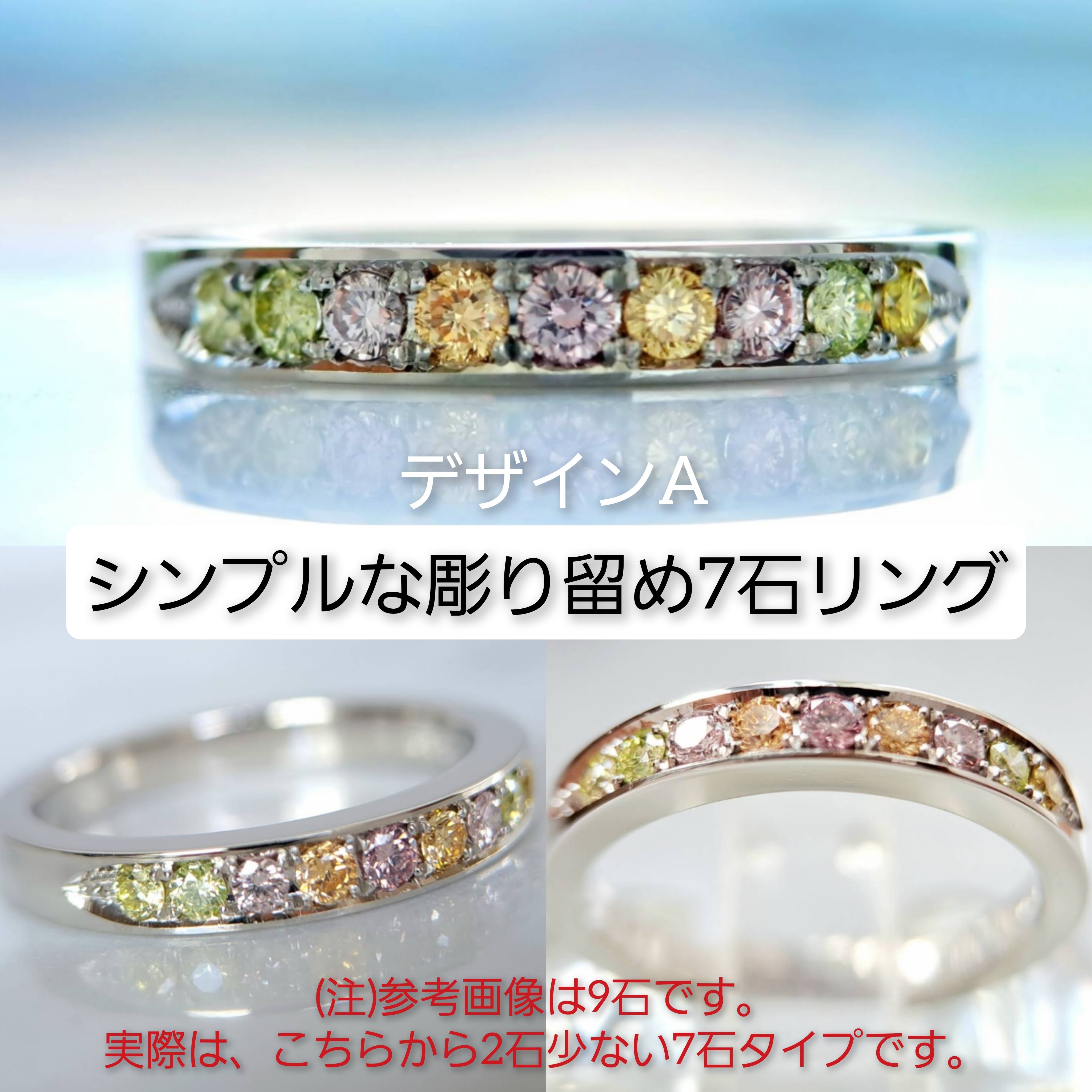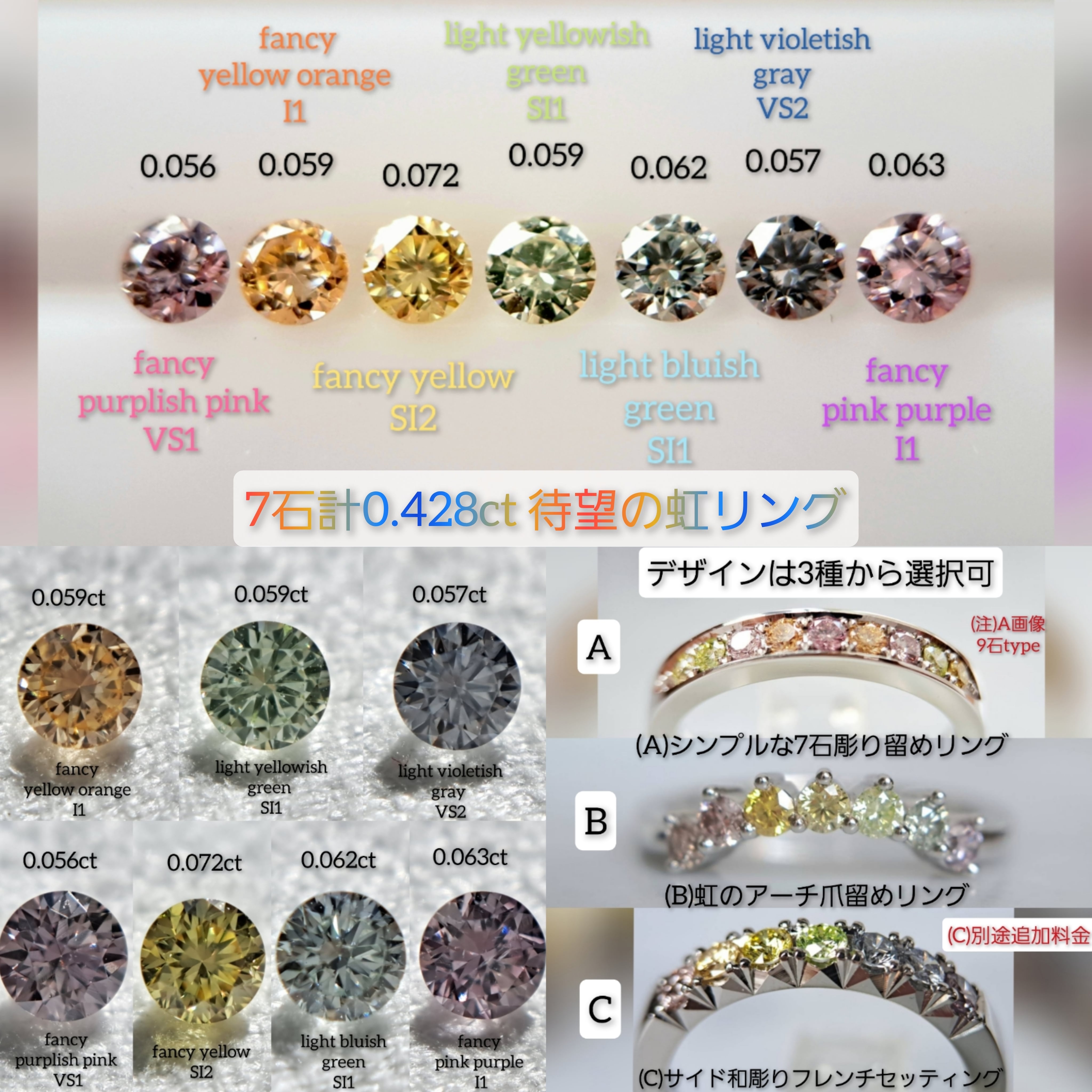 お待たせしました。当店が得意とする「虹のカラーダイヤモンド」リング待望の新作です。今回のリングは、以下3種のデザインからお好みのものをご選択頂けます。