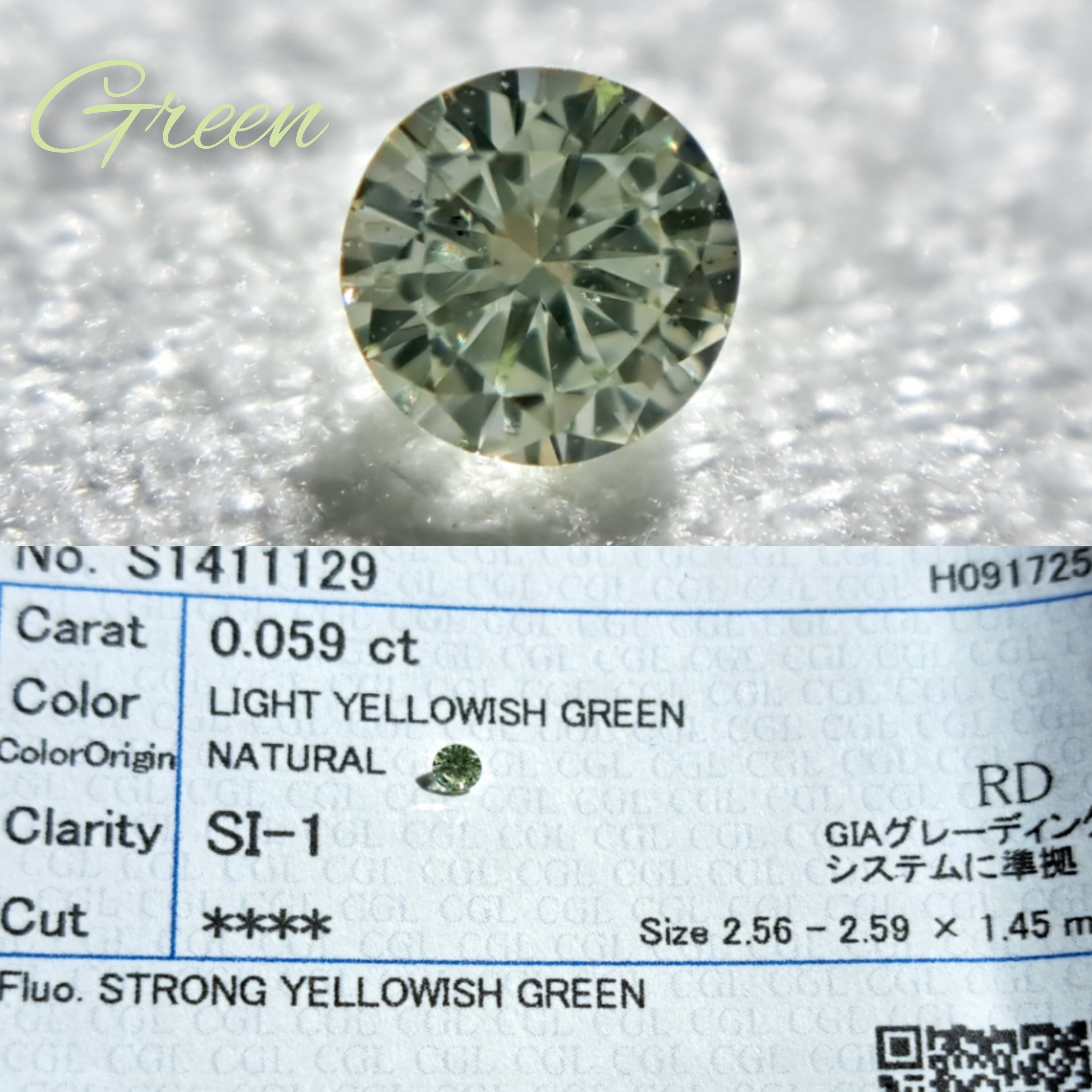 4) 0.059ct light yellowish green SI1 Fluo.strong yellowish green (2.56‐2.59×1.45mm)