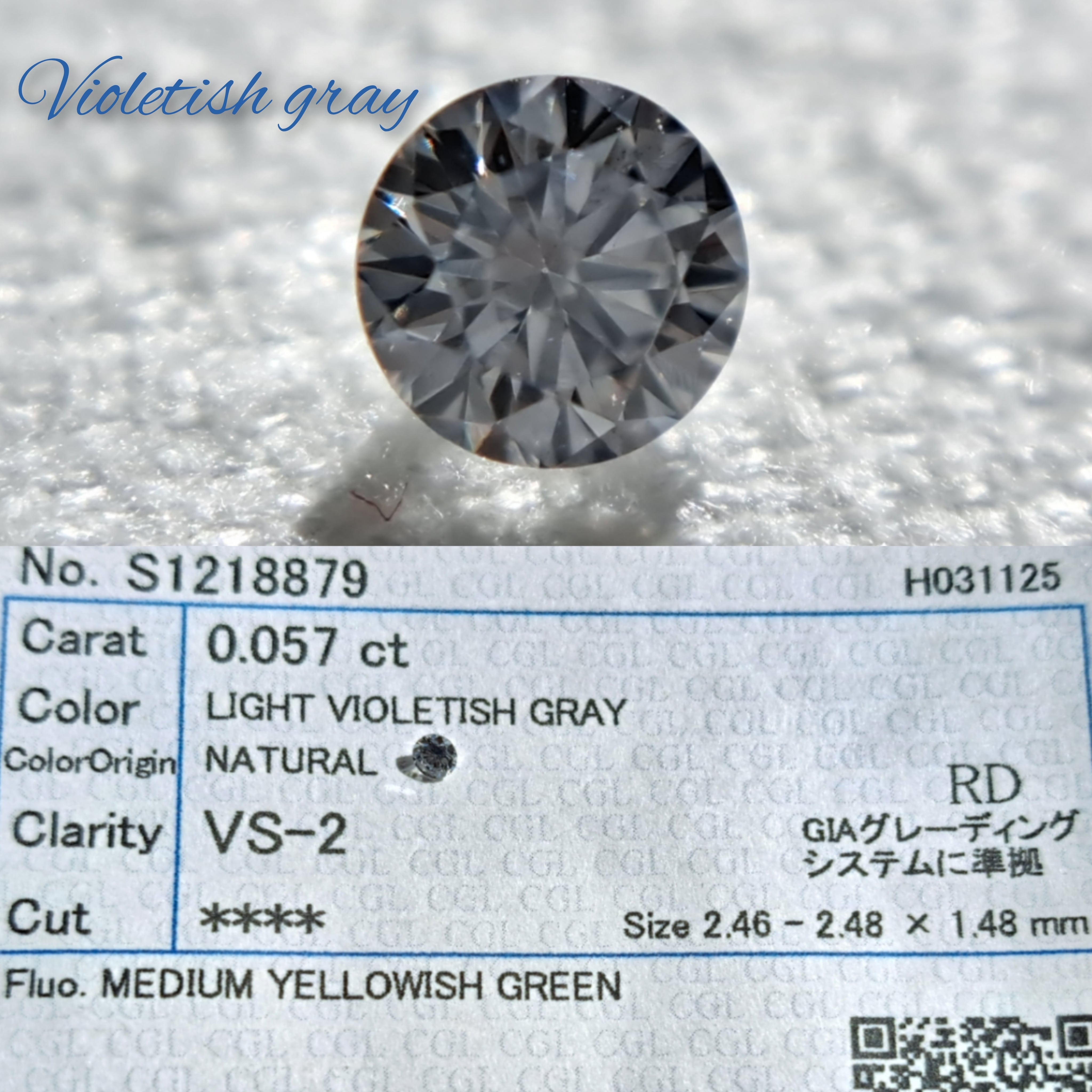 6) 0.057ct light violetish gray VS2 Fluo.medium yellowish green (2.46-2.48×1.48mm)