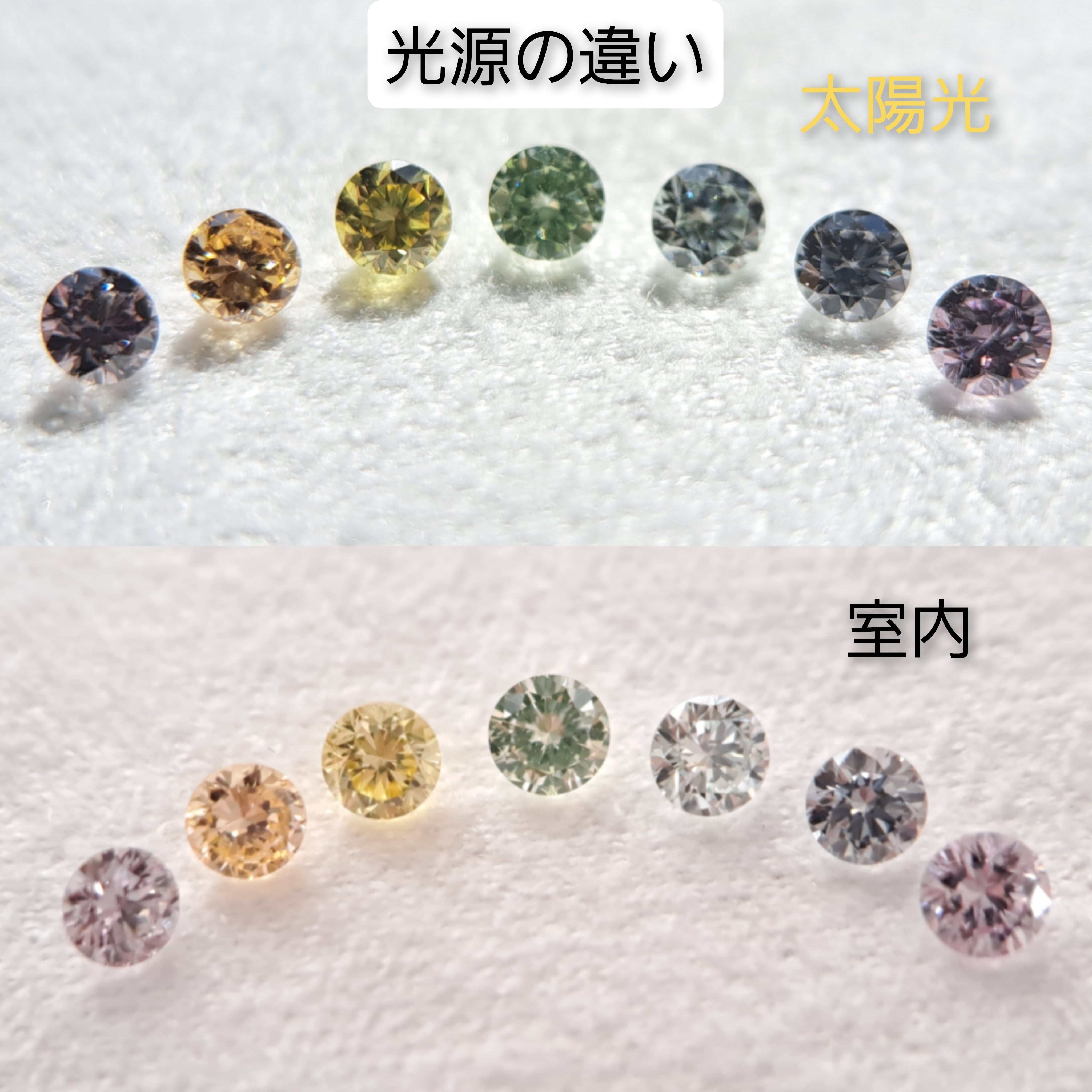 以上、7石の美しいカラーダイヤモンドをあしらった、サイズ揃いの虹、7石のレインボーダイヤモンドたち。