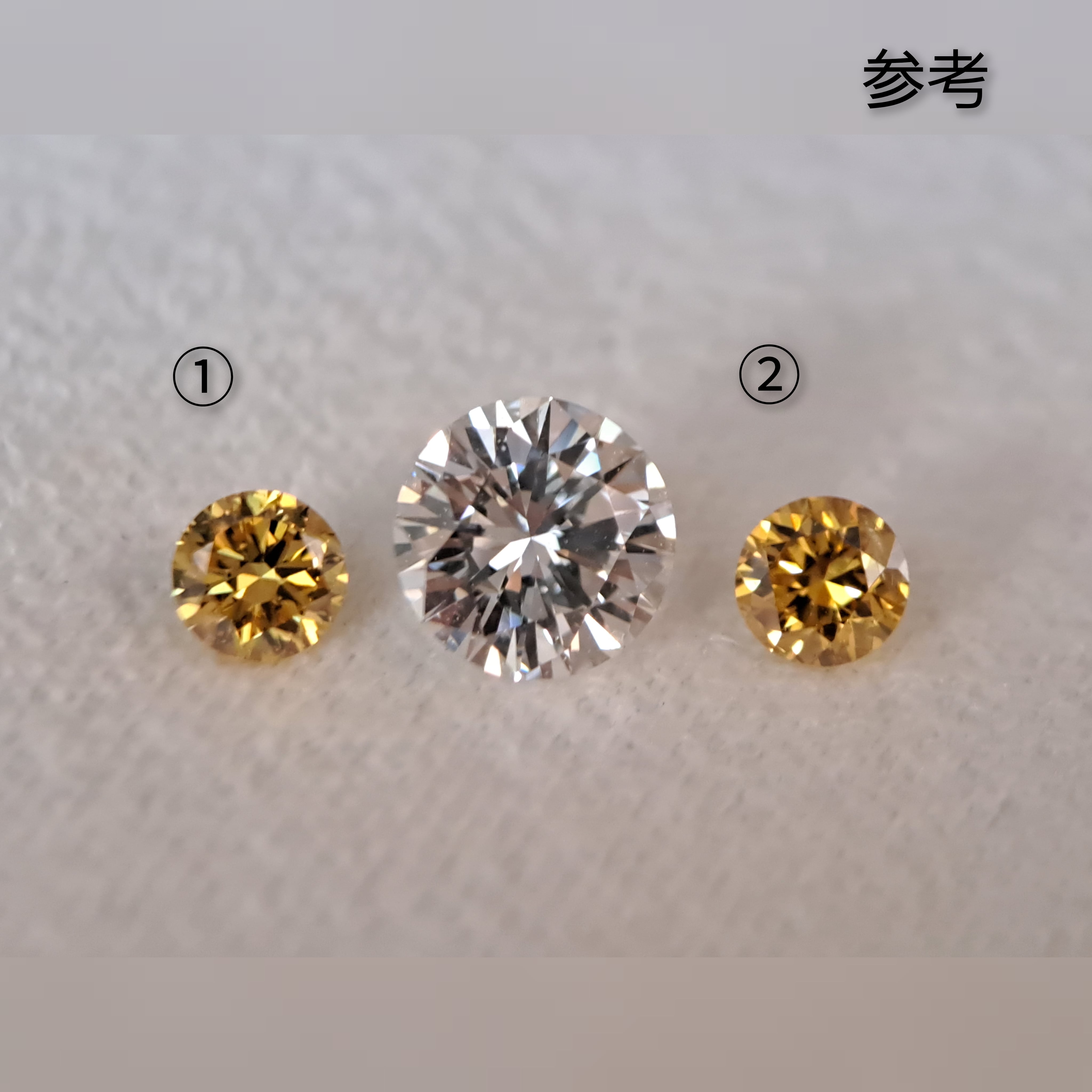 そして、実際に石を前にした私の目には、①はストレートでなく、明らかにオレンジ系イエローに映ります。