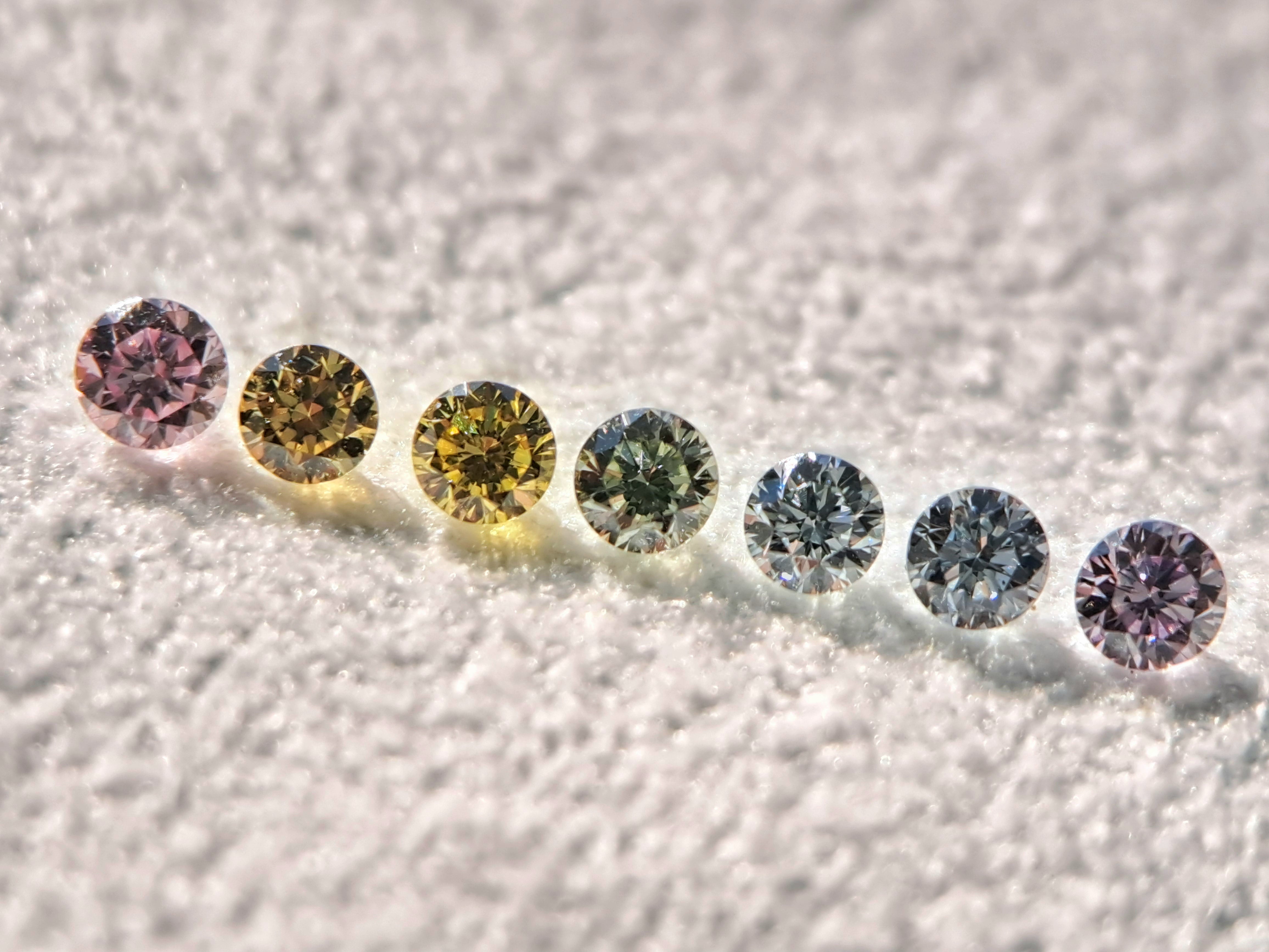 当店が得意とする虹のカラーダイヤモンド、こちらは径2mm弱(1.9mm弱メイン~2mm)と小さな虹色ダイヤモンド7石を、今回アウトレットとして特別にセット販売いたします。