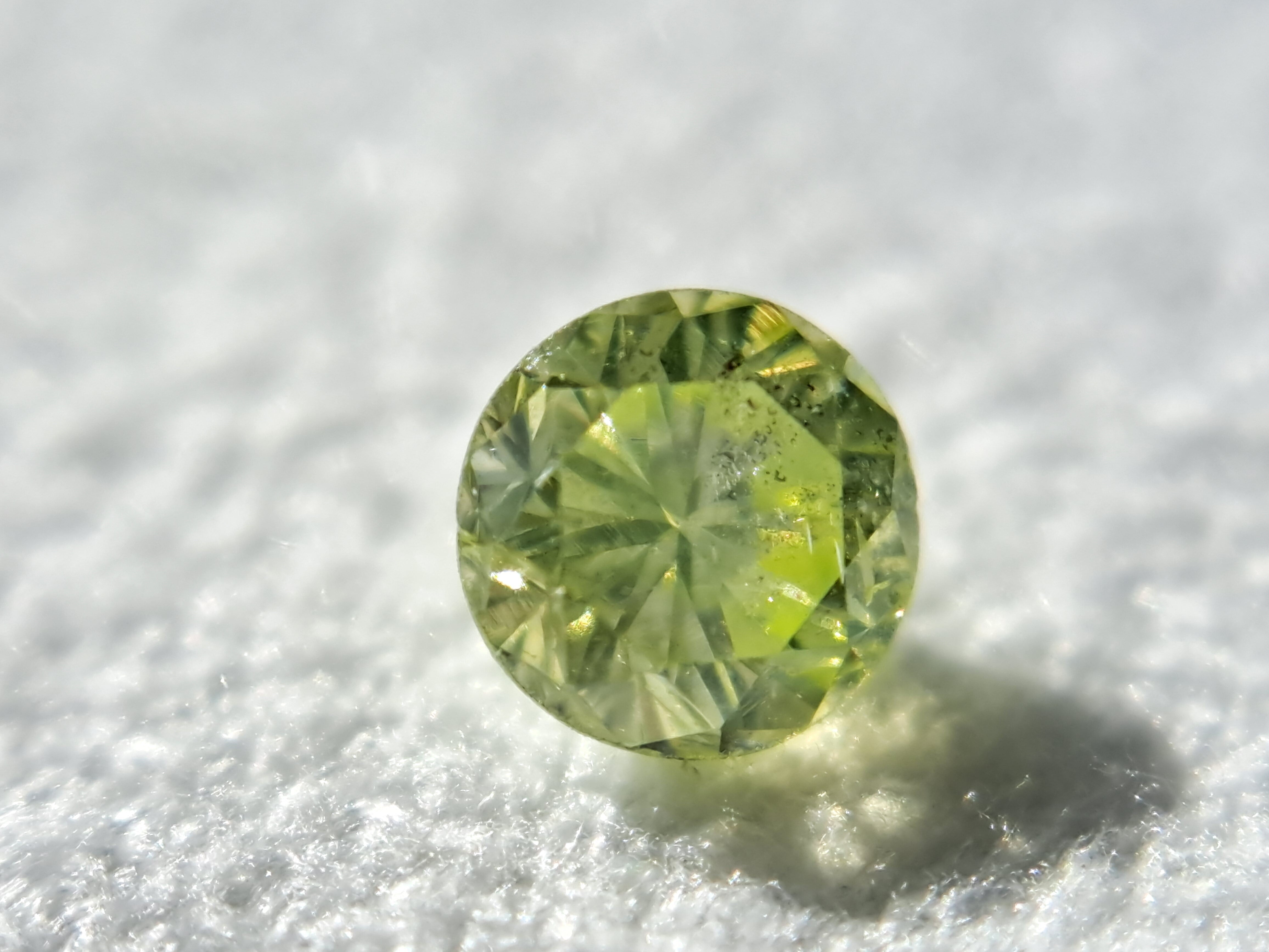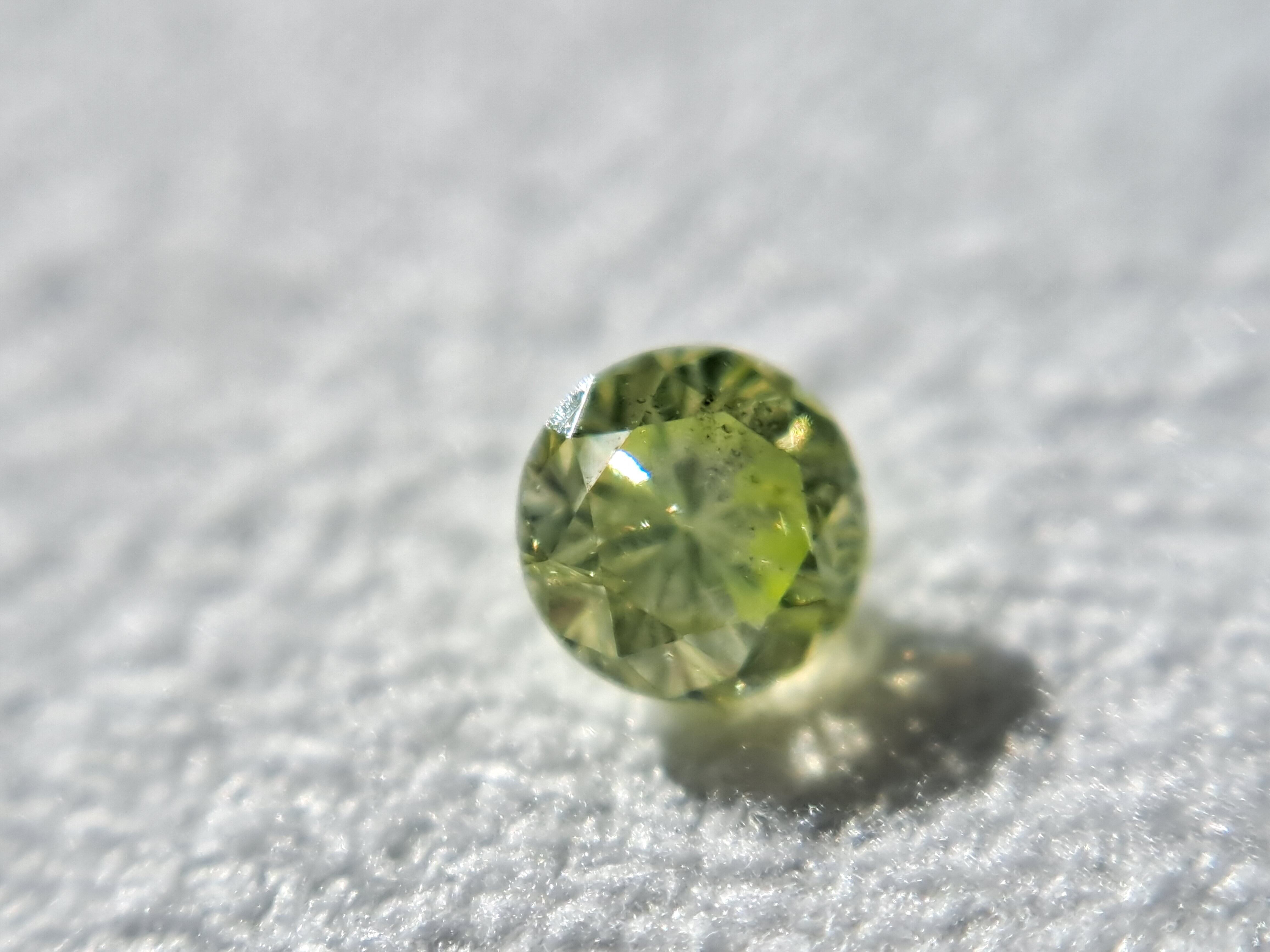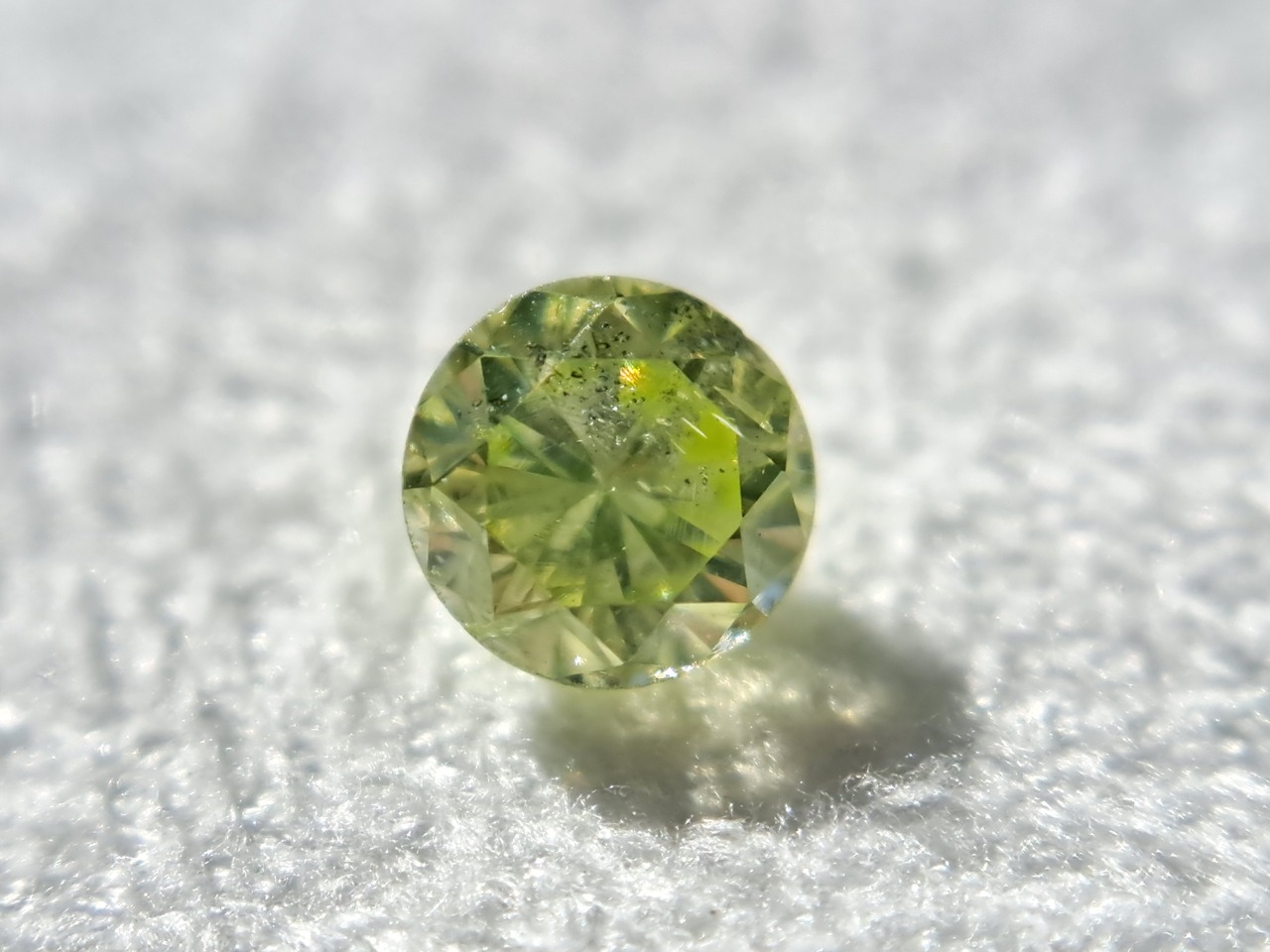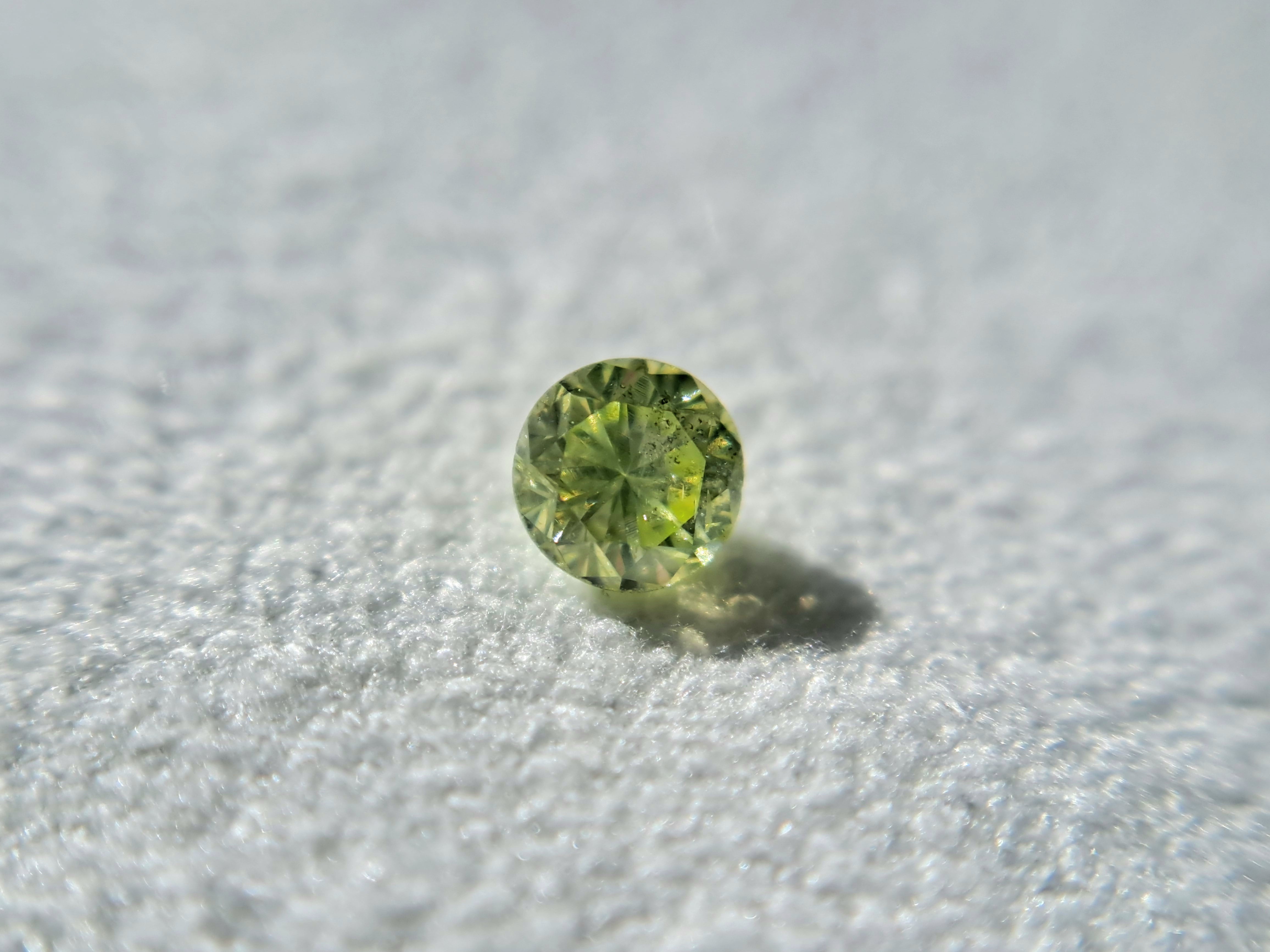 fancy yellow green 0.095ctは約2.8mm弱径、僅かに0.1ct 3mmに届かぬものの、じゅうぶんなボリュームと存在感あるボディから放たれる美しいグリーンがとても魅力的。