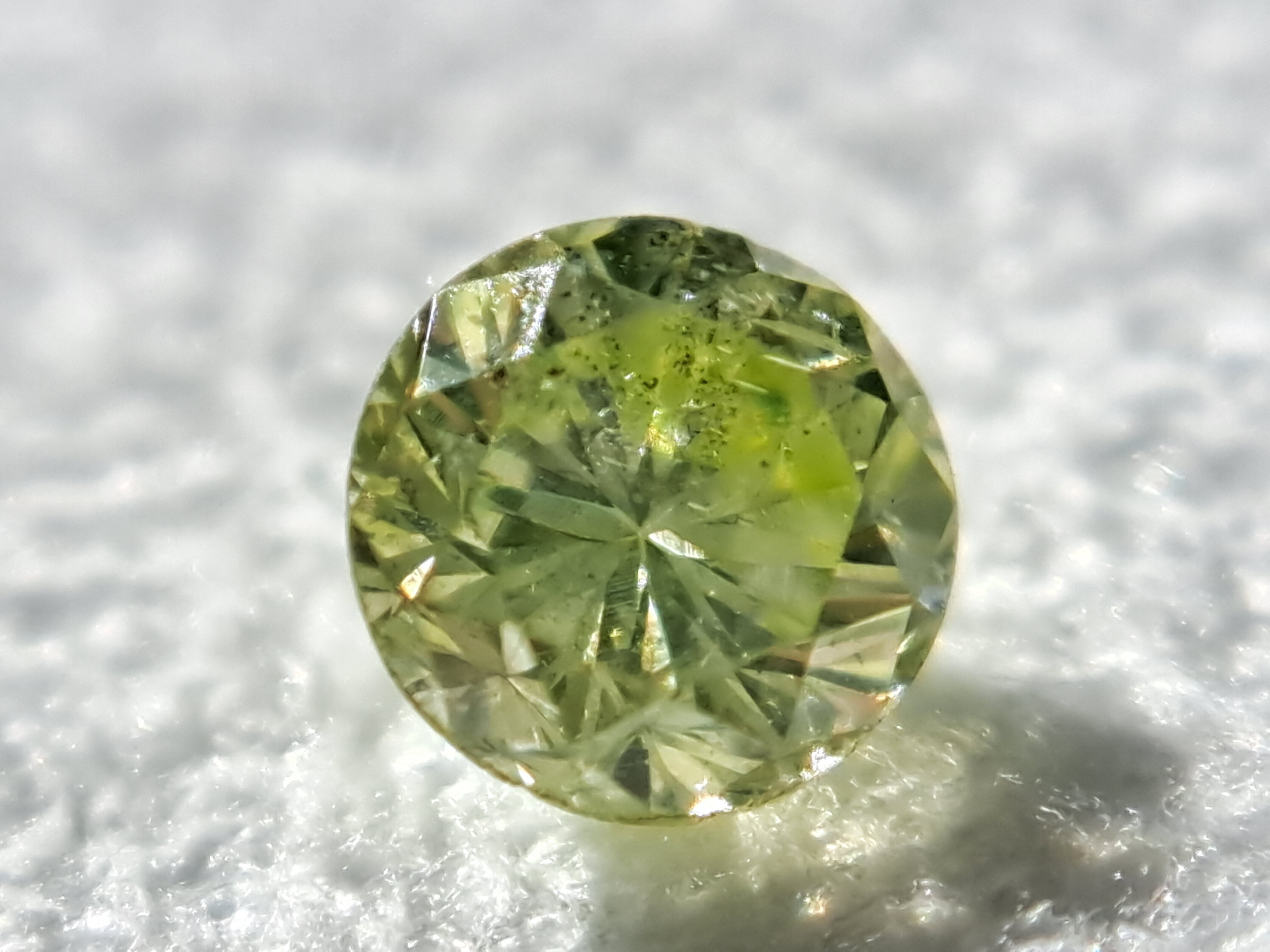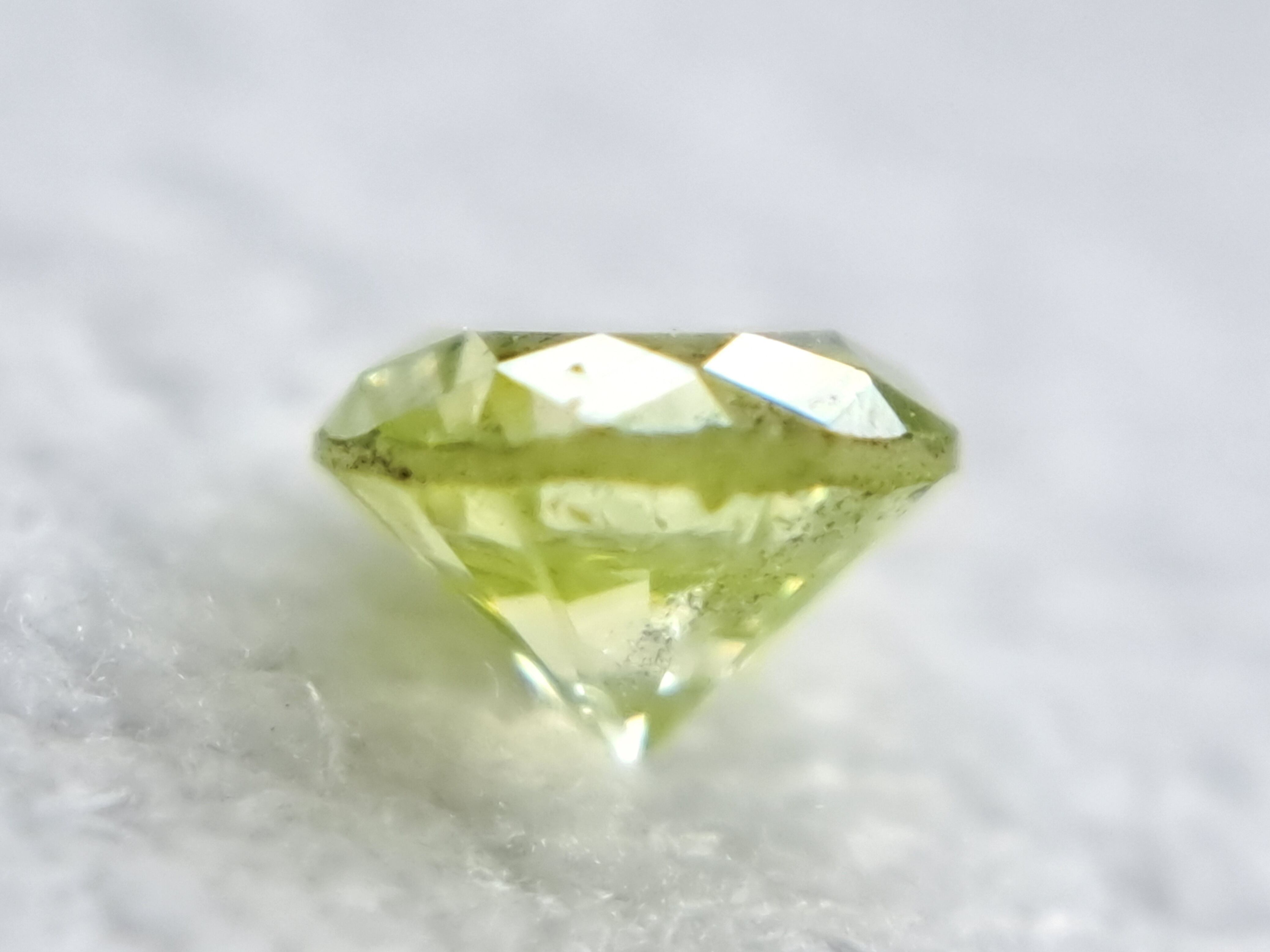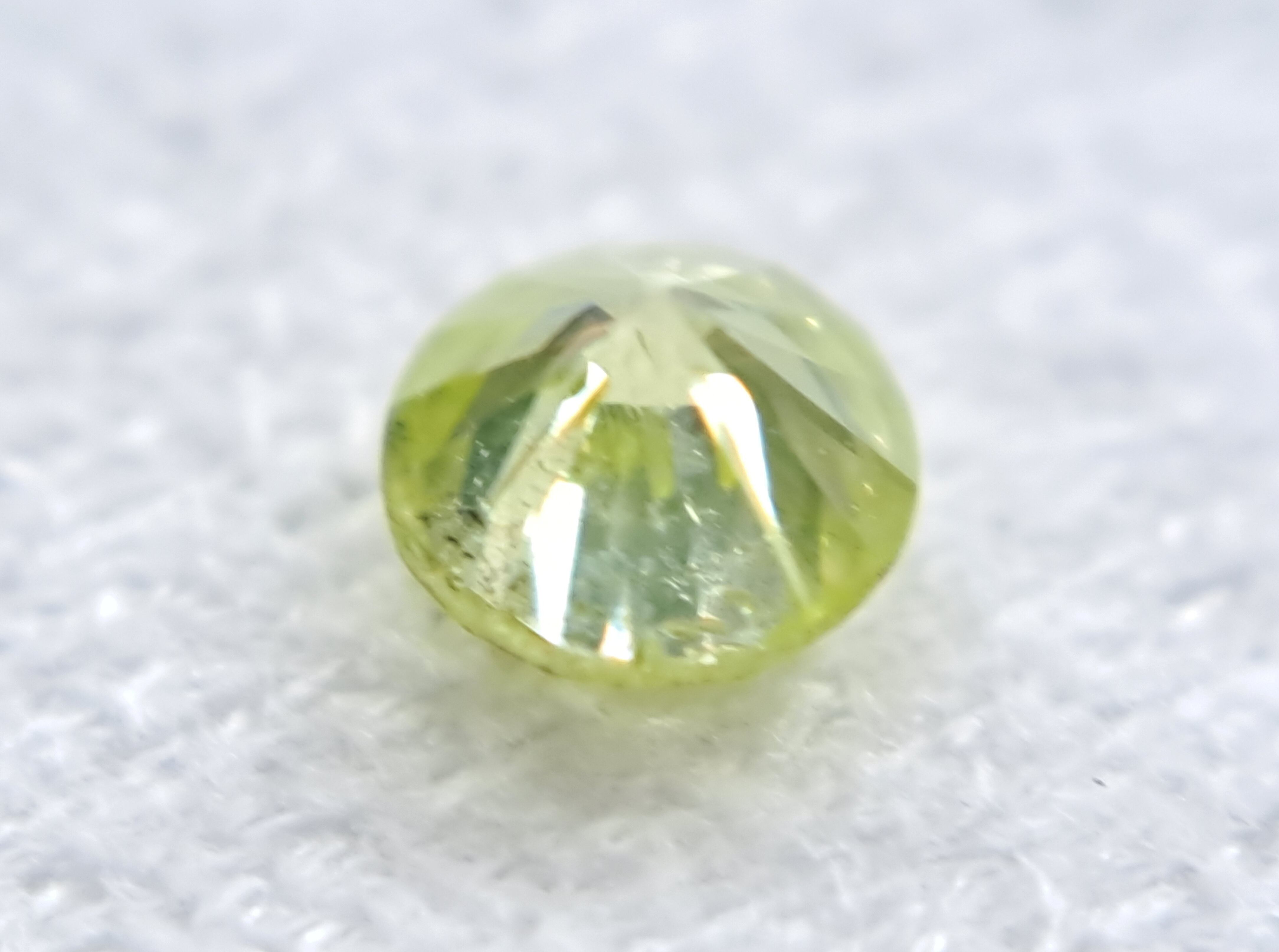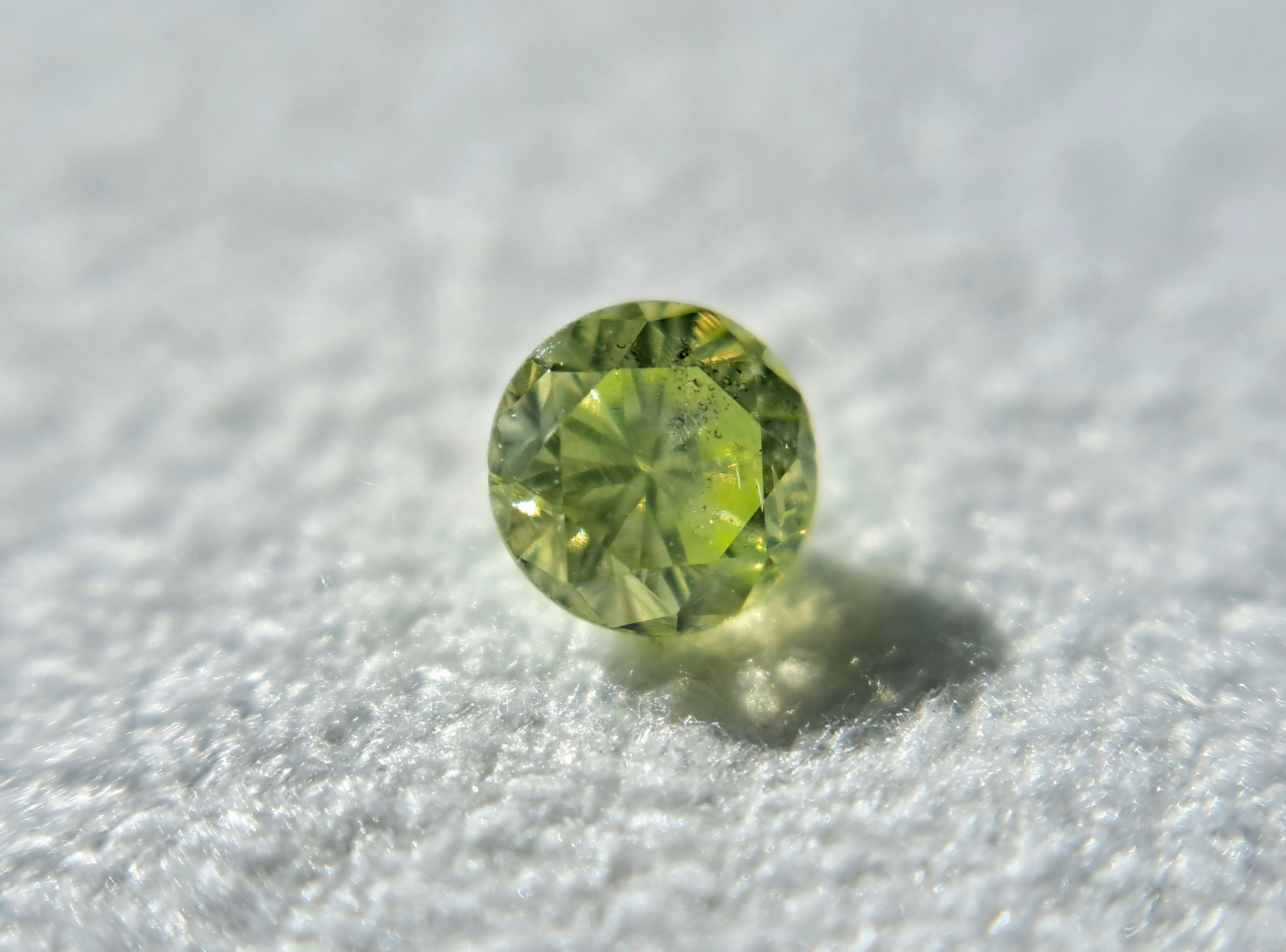 fancy yellow green 0.095ctは約2.8mm弱径、僅かに0.1ct 3mmに届かぬものの、じゅうぶんなボリュームと存在感あるボディから放たれる美しいグリーンがとても魅力的。
