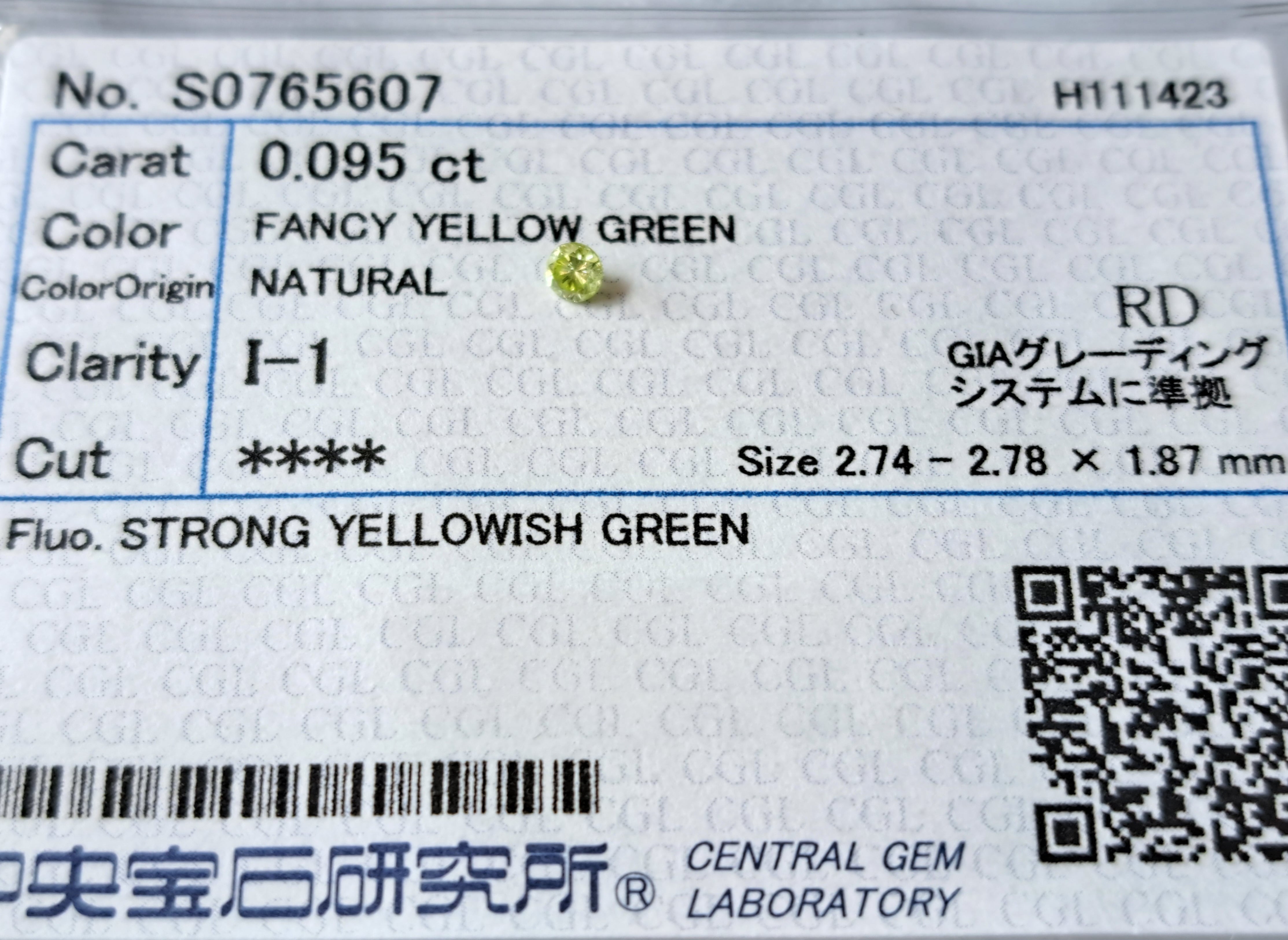 グリーンダイヤモンドルース 0.095ct fancy yellow green I1(CGL)