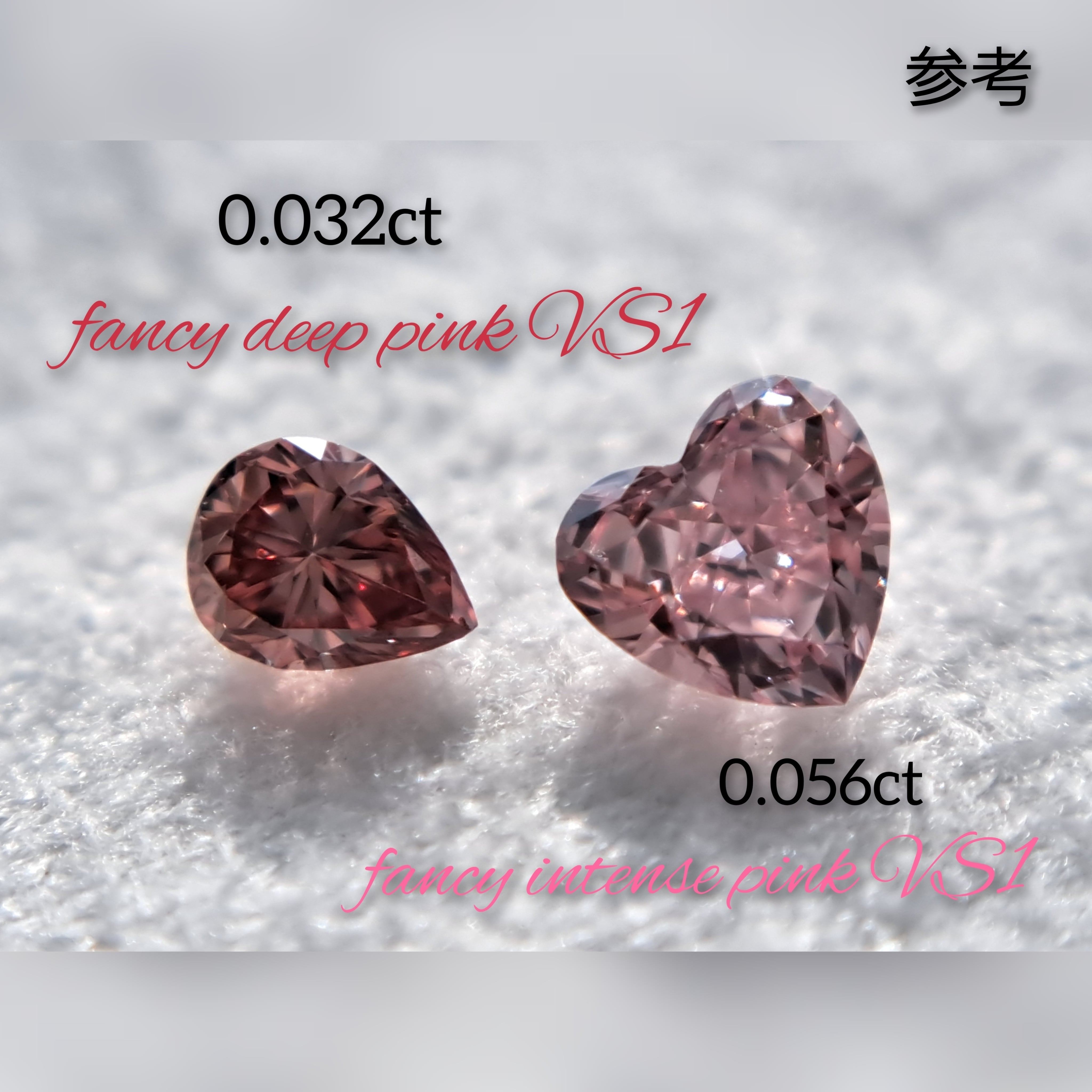 画像18~20枚目にあるよう同じfancy deep pink 0.154ctもこちらと同様赤みがたいへん強く、よく似た双子のような色合いです。同じロットではありませんが、こちらも0.154ct同様に旧品、蔵出し品になります。