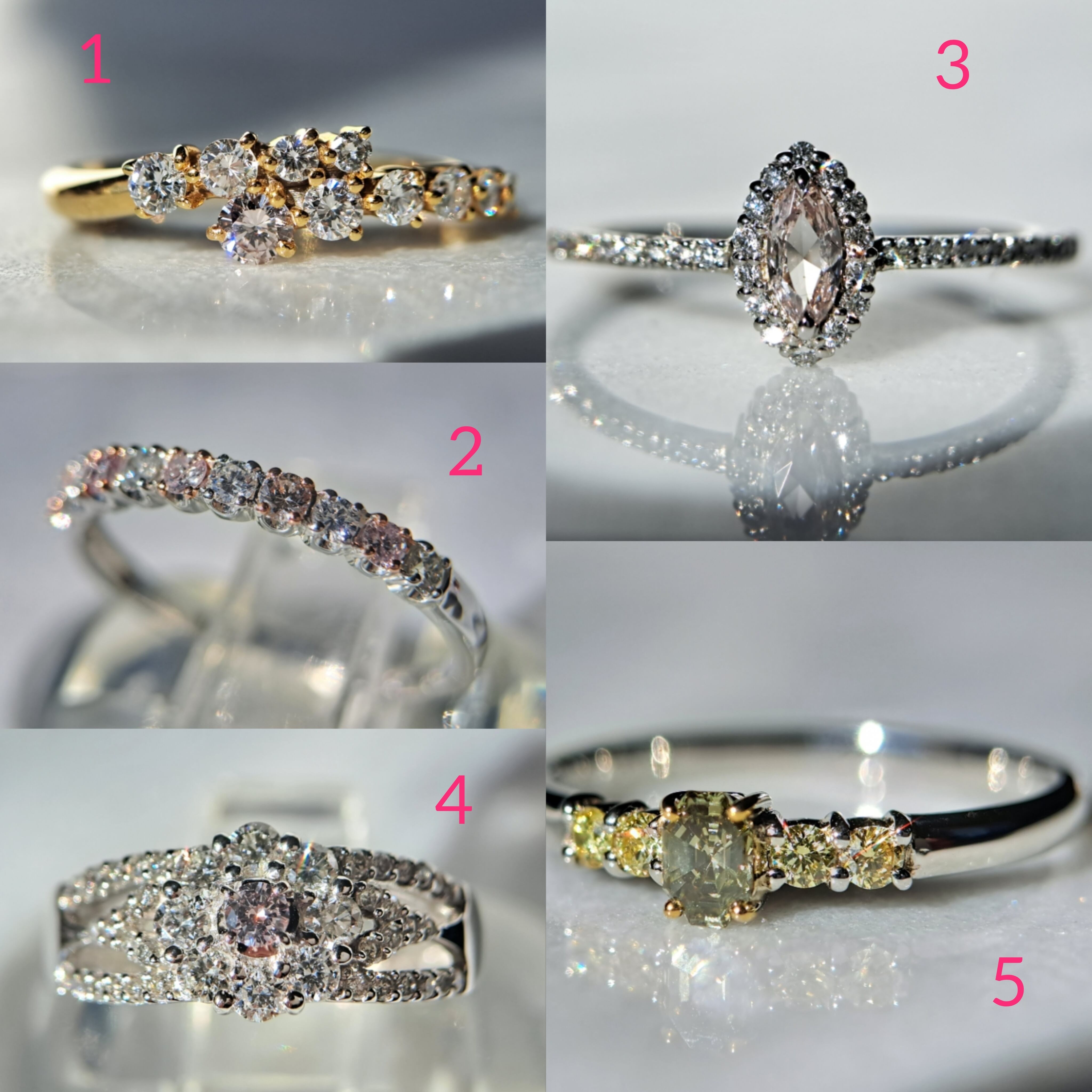 0.096ct(3mm径ラウンド)のふんわりと優しいピンクダイヤモンドを筆頭に、