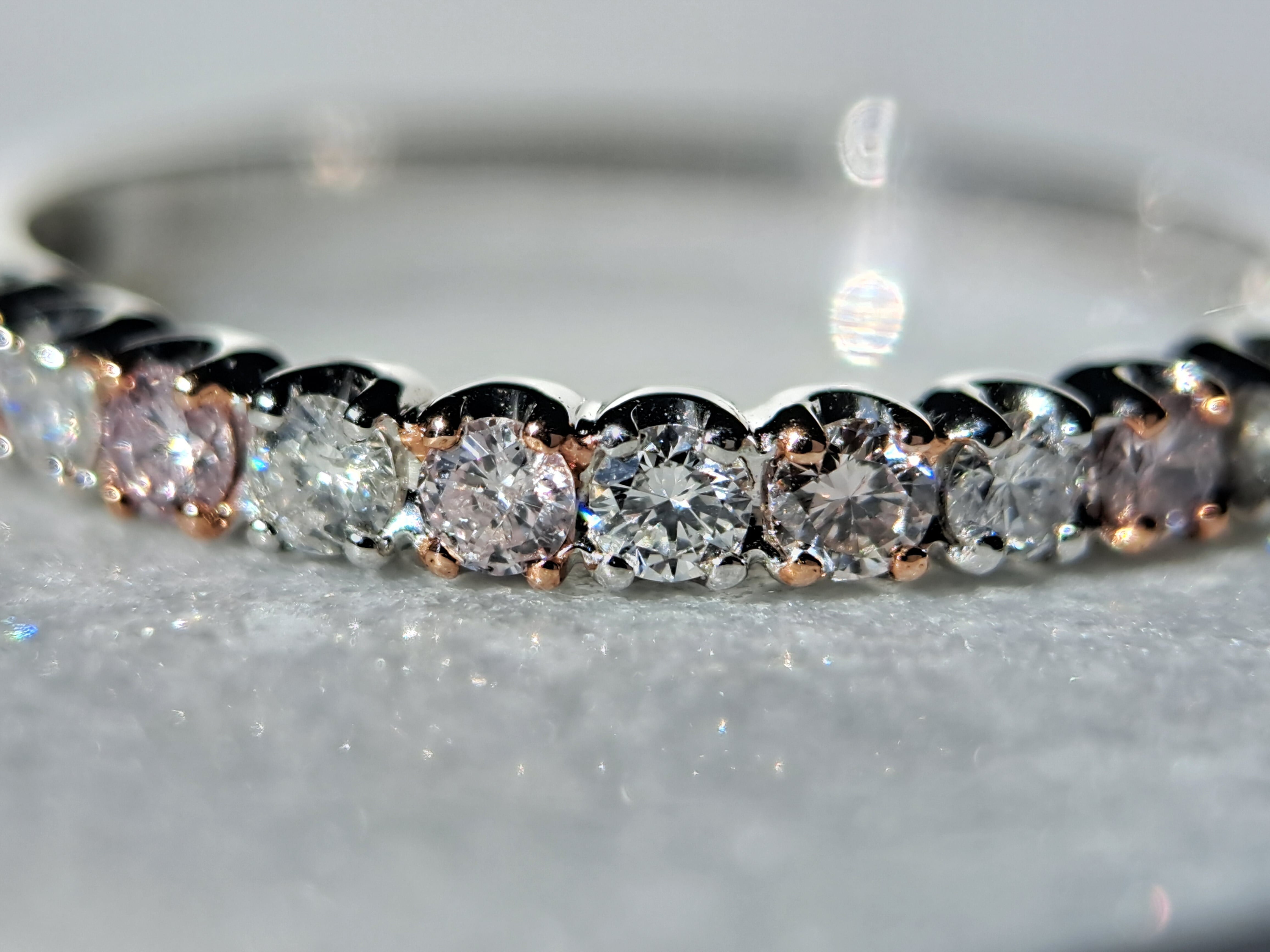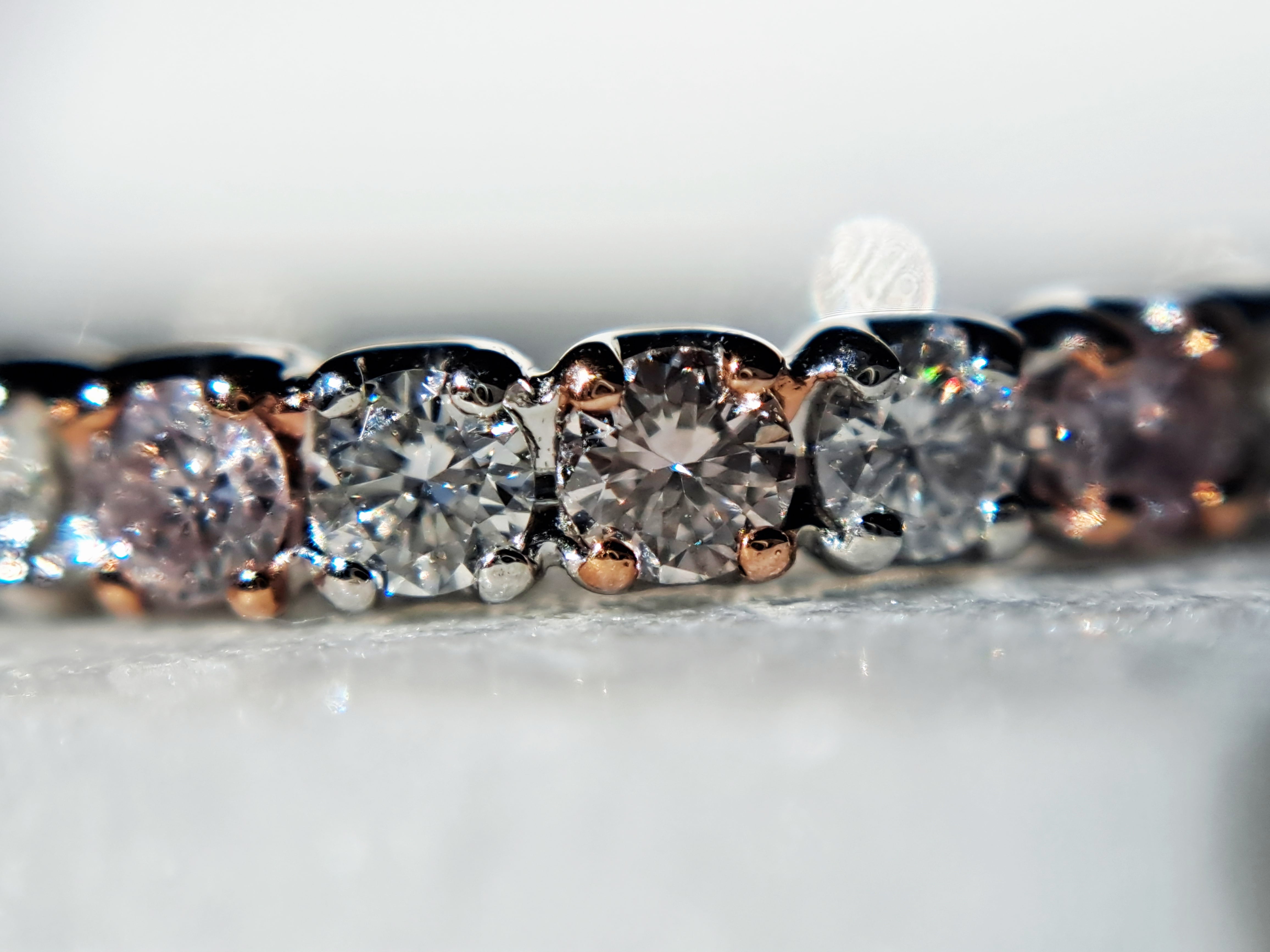 ピンクダイヤが5石、カラーレスが5石の合計10石、共に傷やカーボンの無いクリアな石たちがあしらわれています。