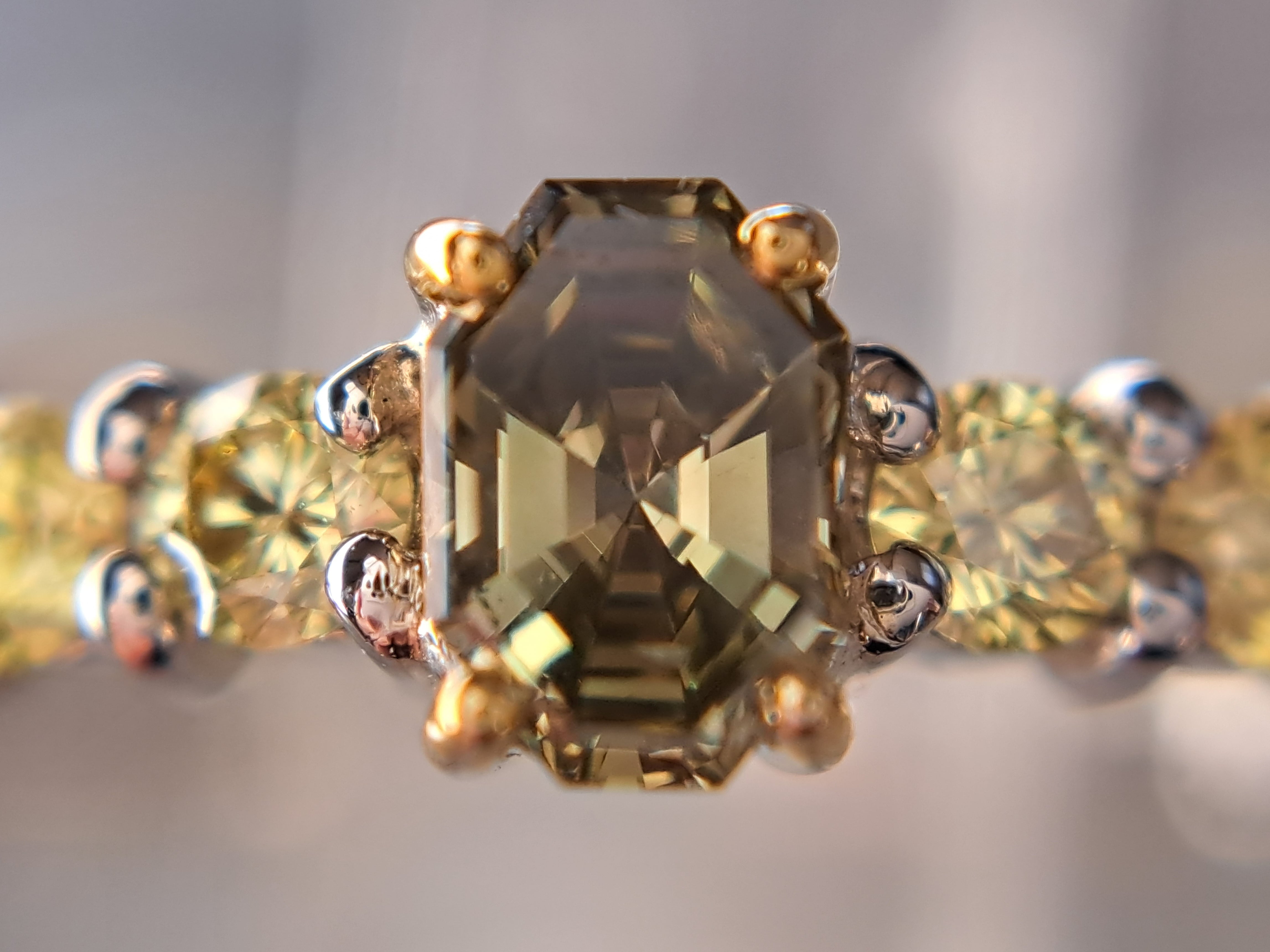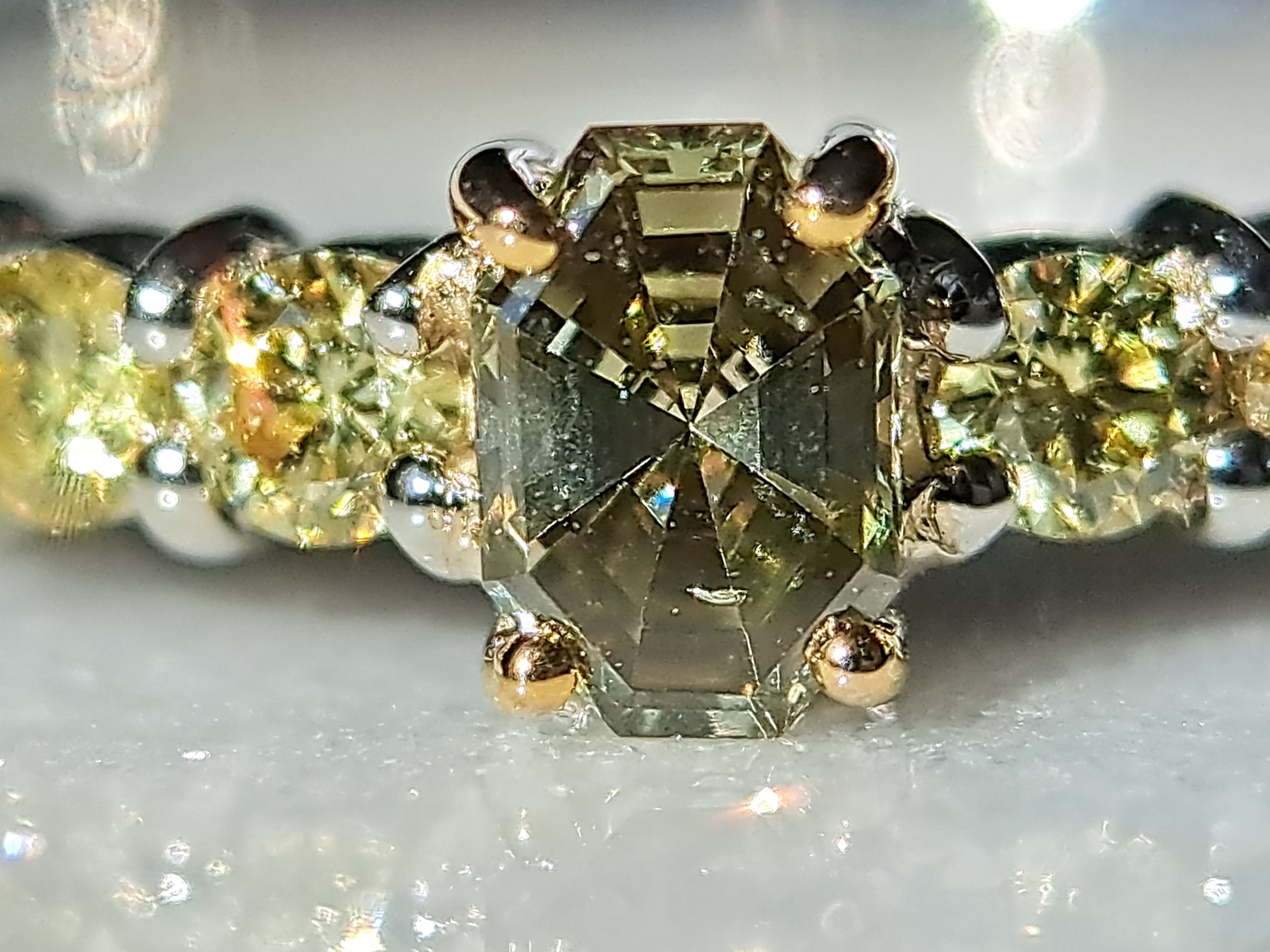 カラーもfancy dark gray yellowish green、直訳すると「暗めのグレーとイエローがかったグリーンが同等だが、黄色系グリーンが優勢」と何だかよくワケがわかりませんが、実質「深く落ち着いたシックなモスグリーン」印象です。