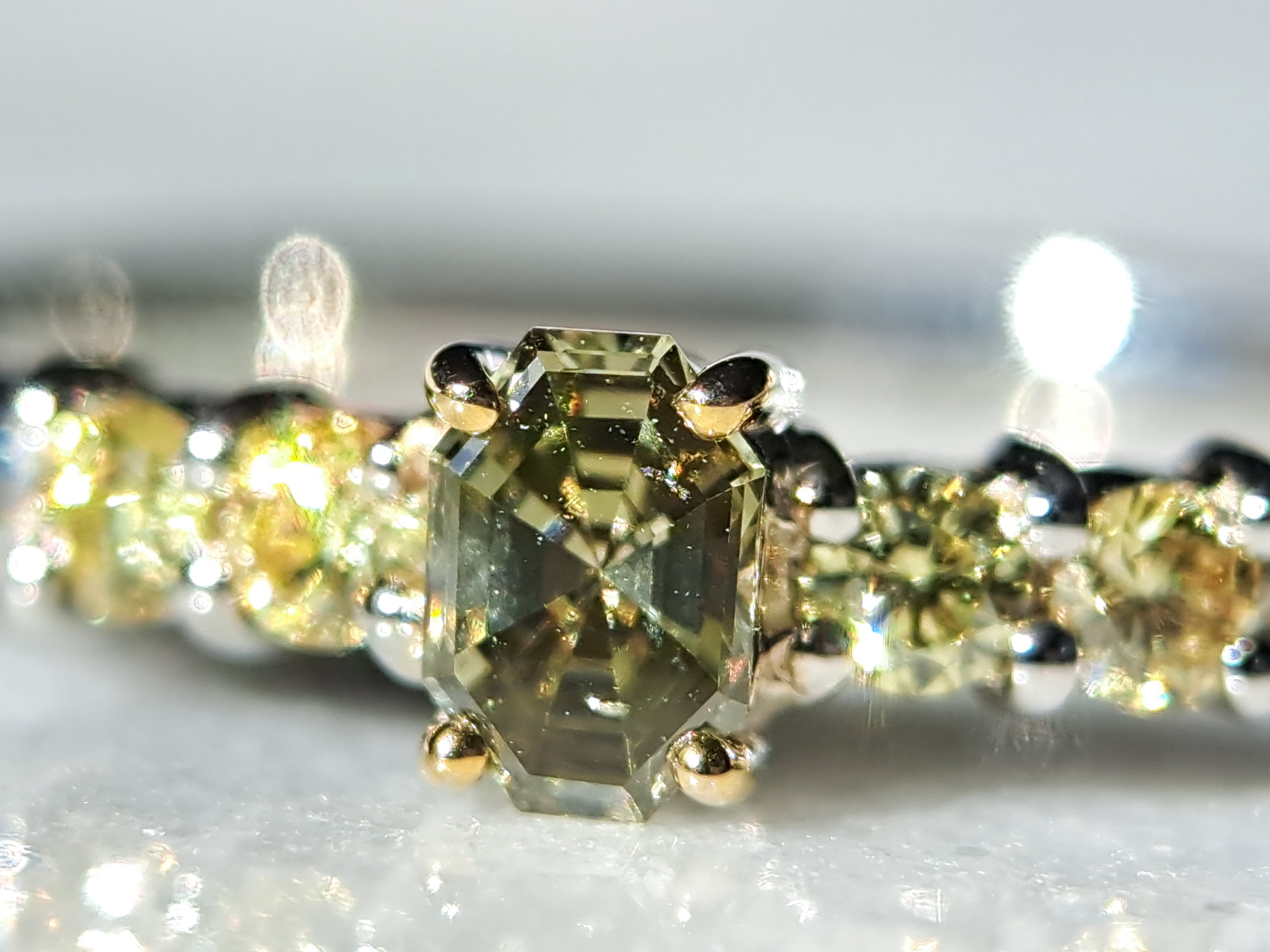 SI1で拡大で気になる傷カーボンなく、ひじょうに透明感に優れいますが、色合いがシックで末尾グリーンですが、時にブラウンみも感じられます。