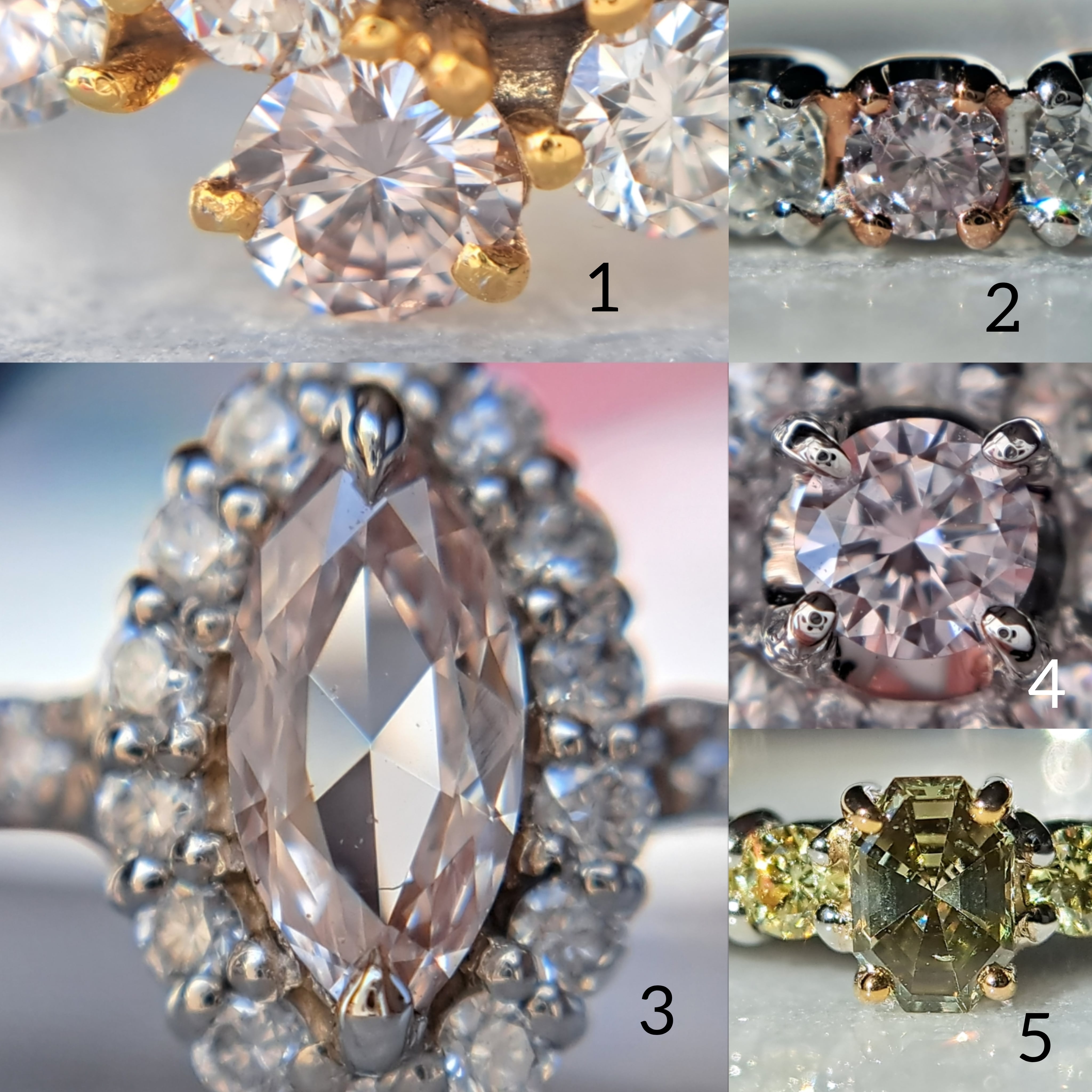 両サイドにイエローダイヤ(fancy light~fancy yellow程度)があしらわれた、なかなか普段は見掛けないレアなカメレオンダイヤリング。