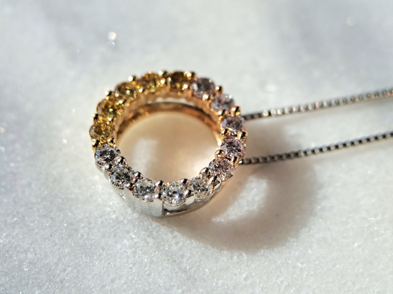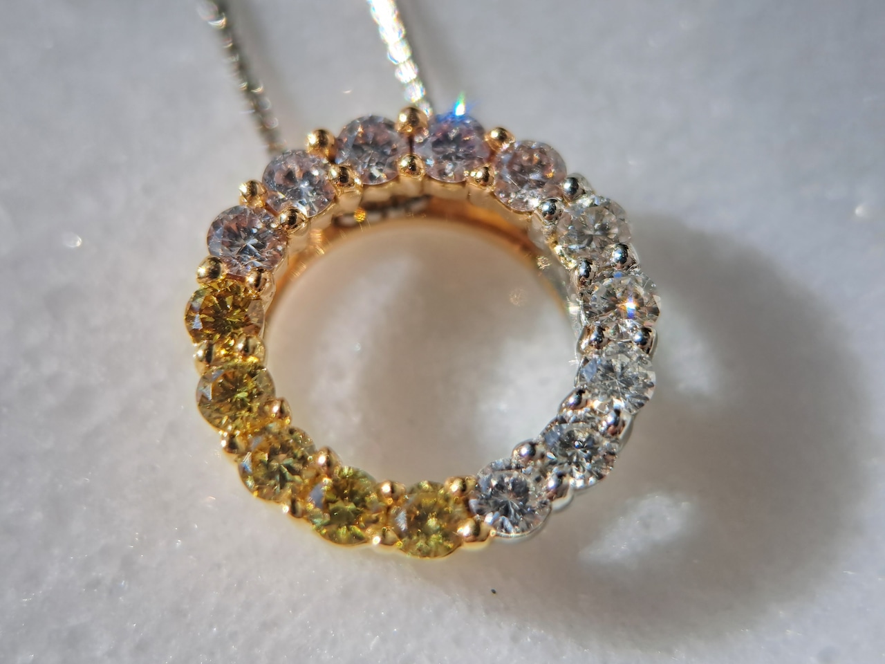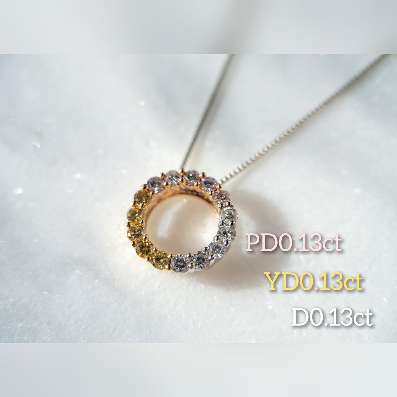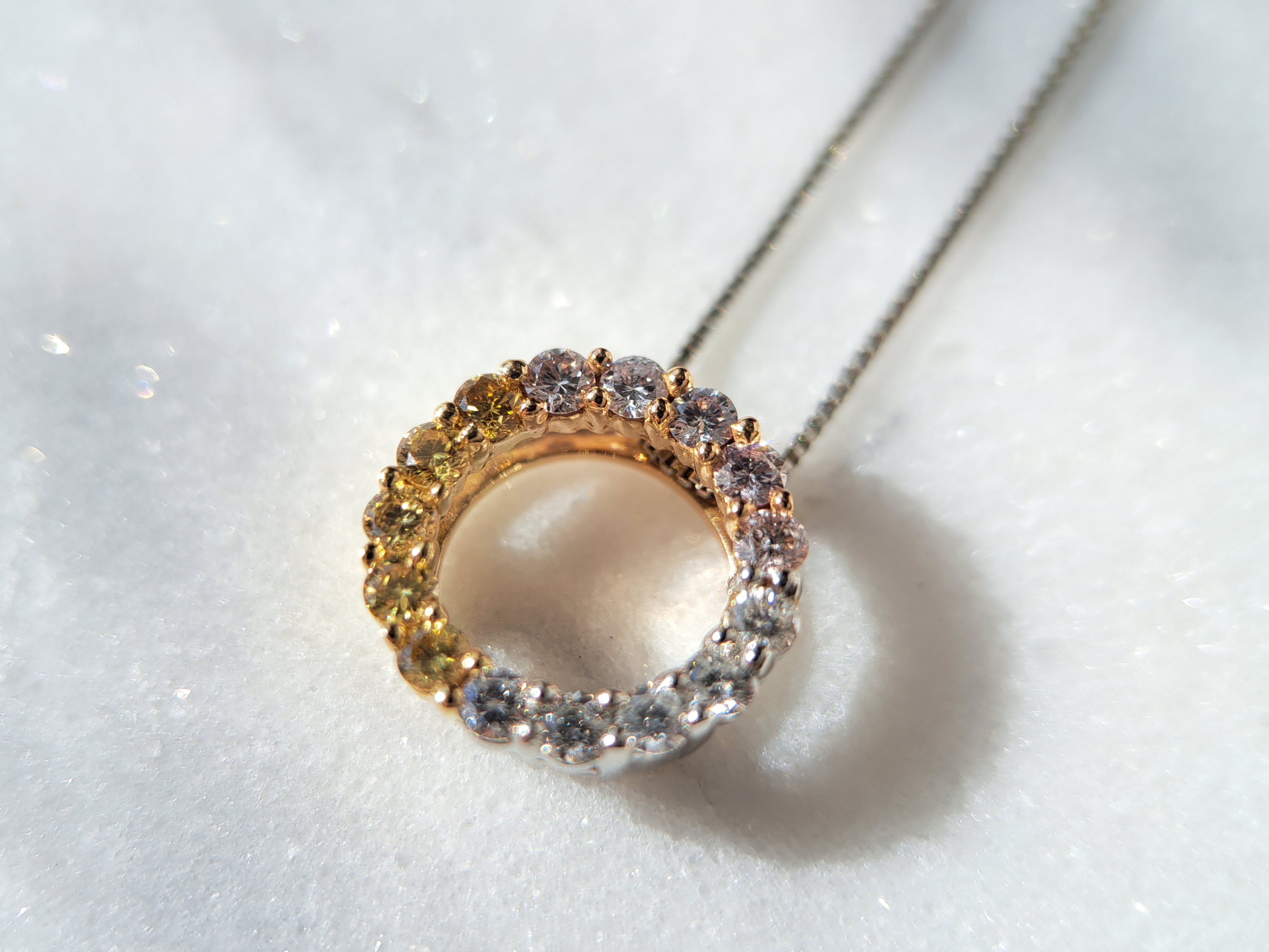 サークル状にピンクダイヤ5石、イエローダイヤ5石、カラーレス5石の計15石の3色のダイヤモンドたちが仲良く並ぶペンダントネックレス。