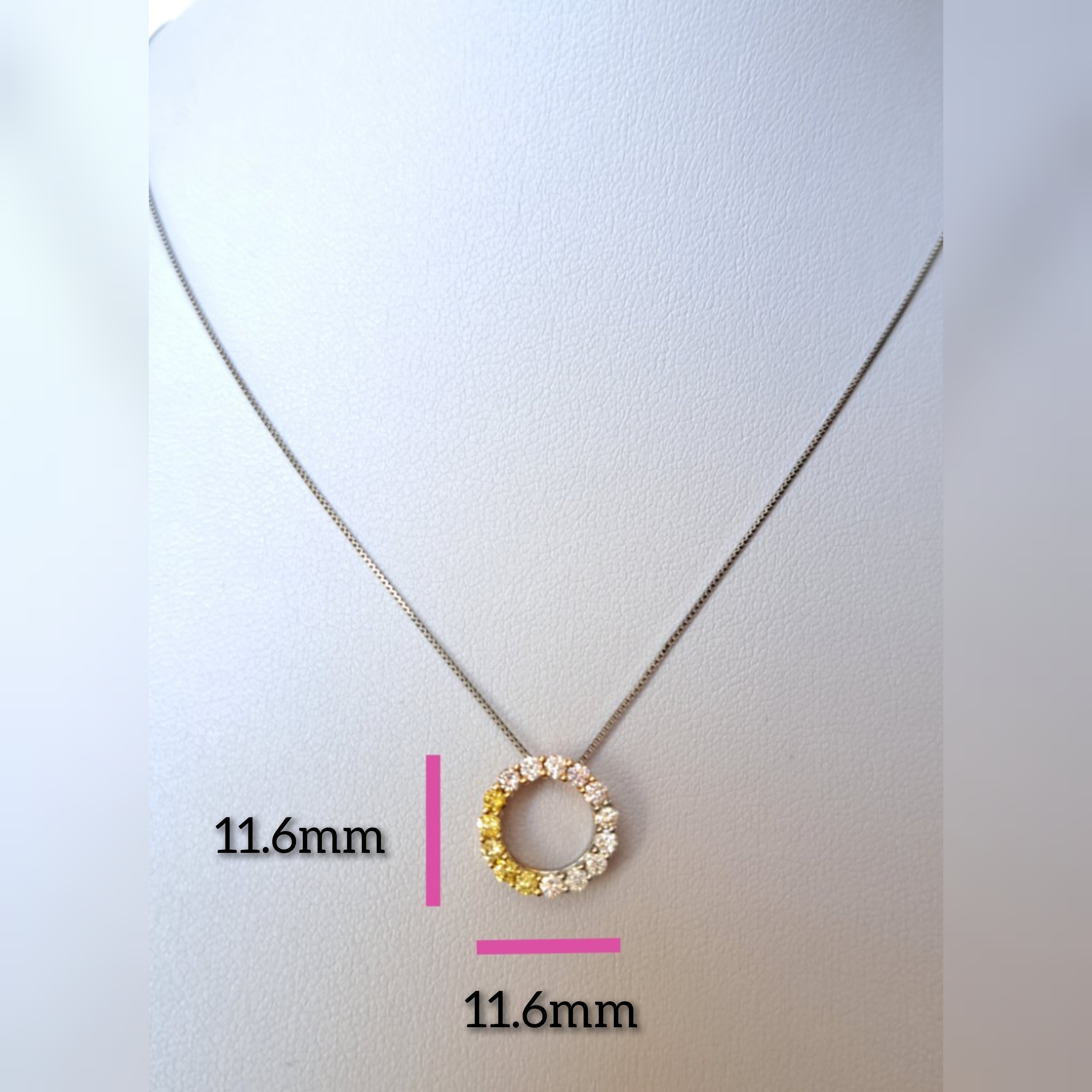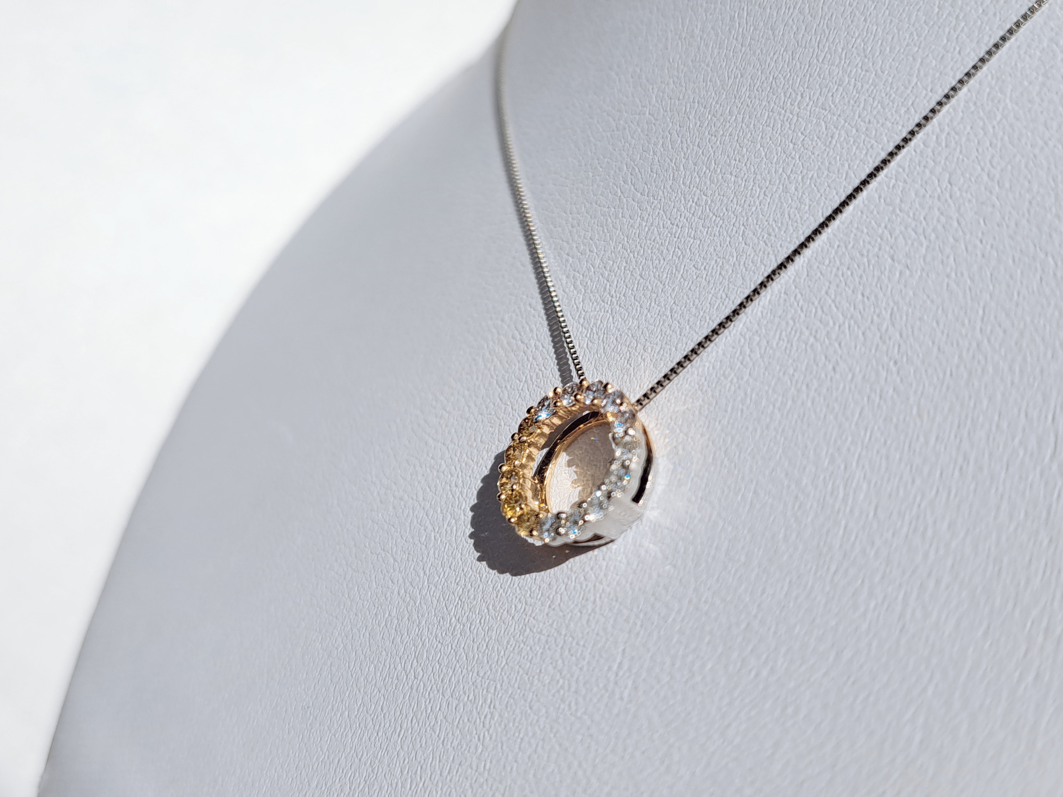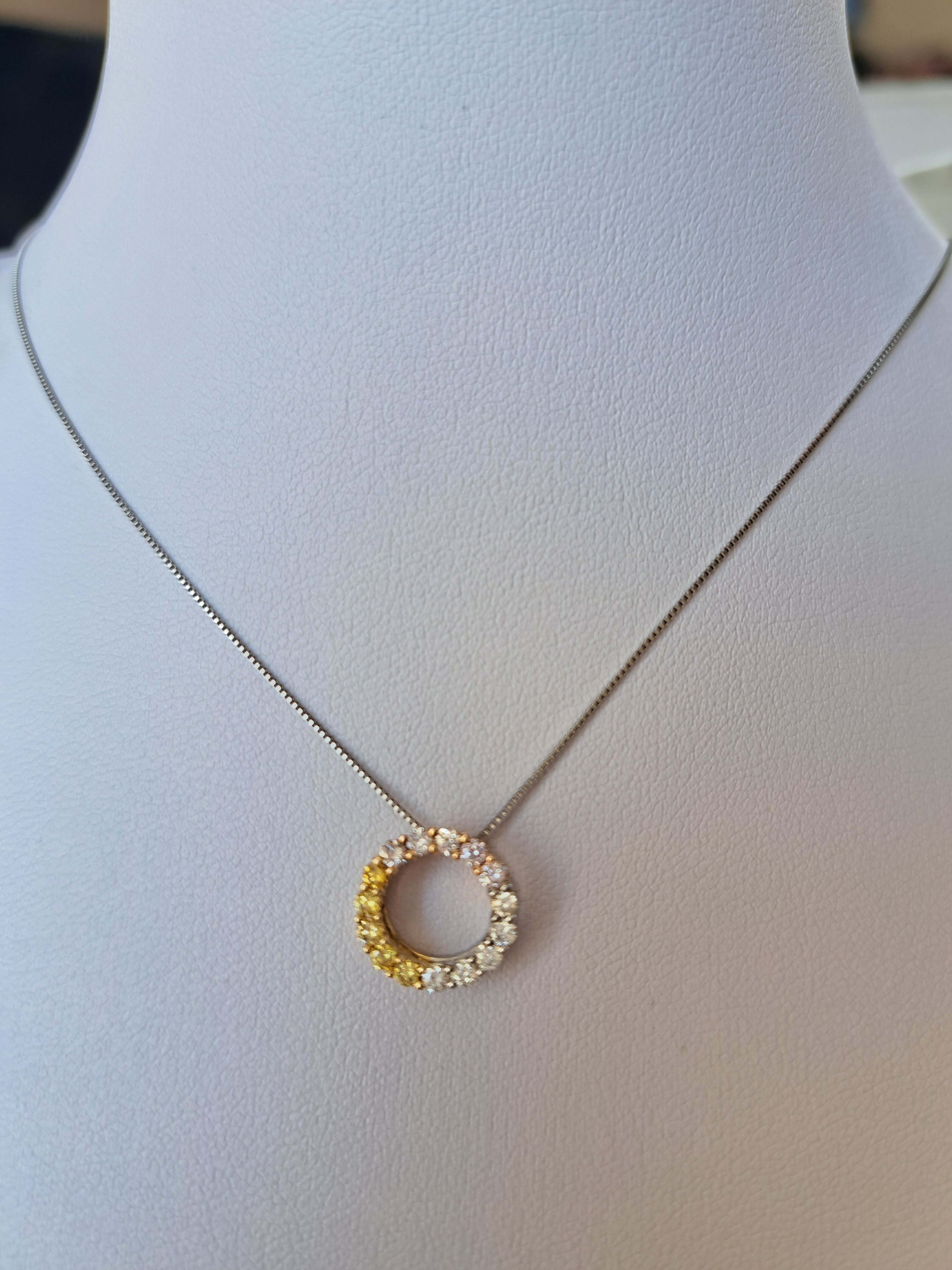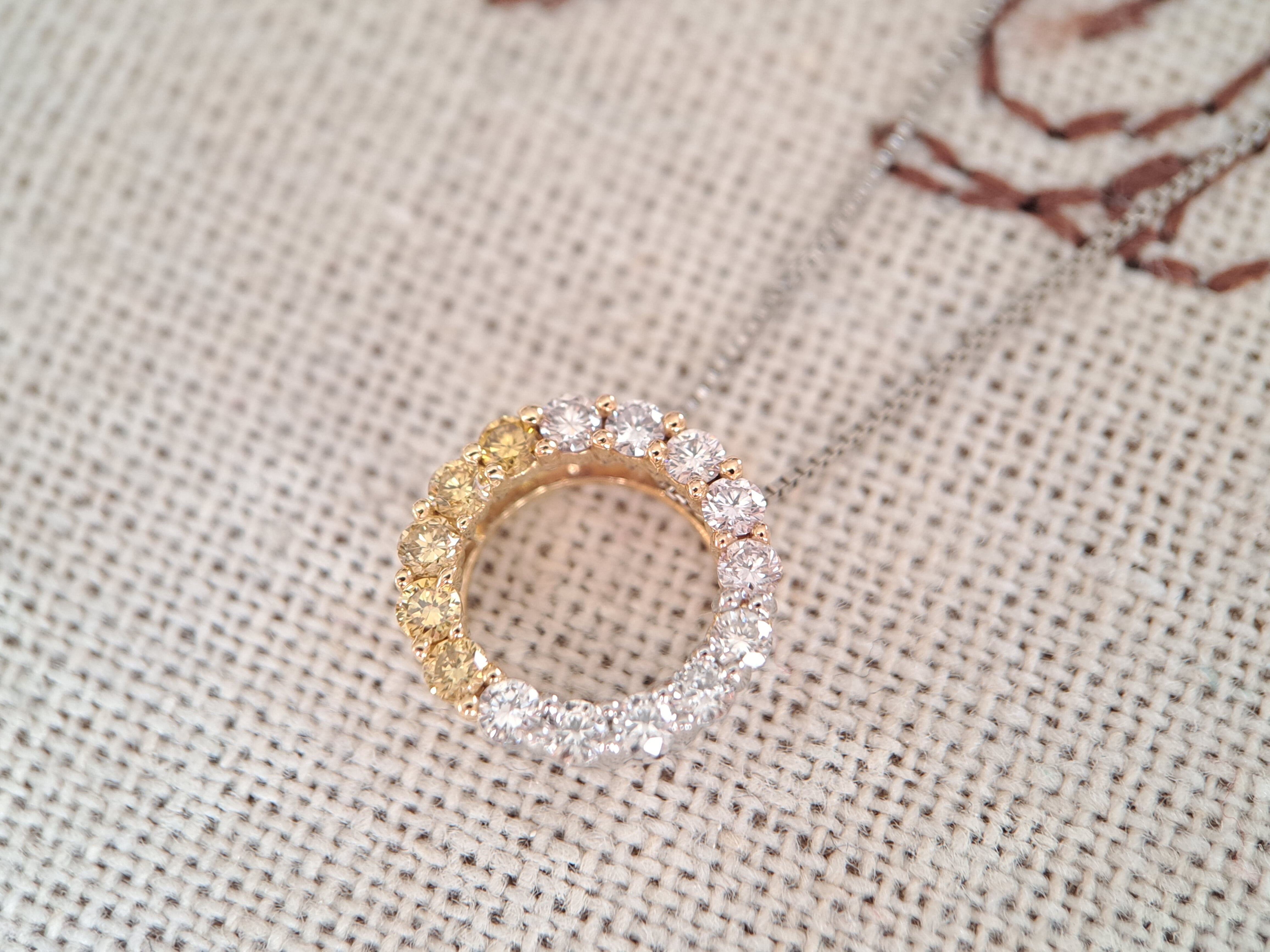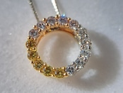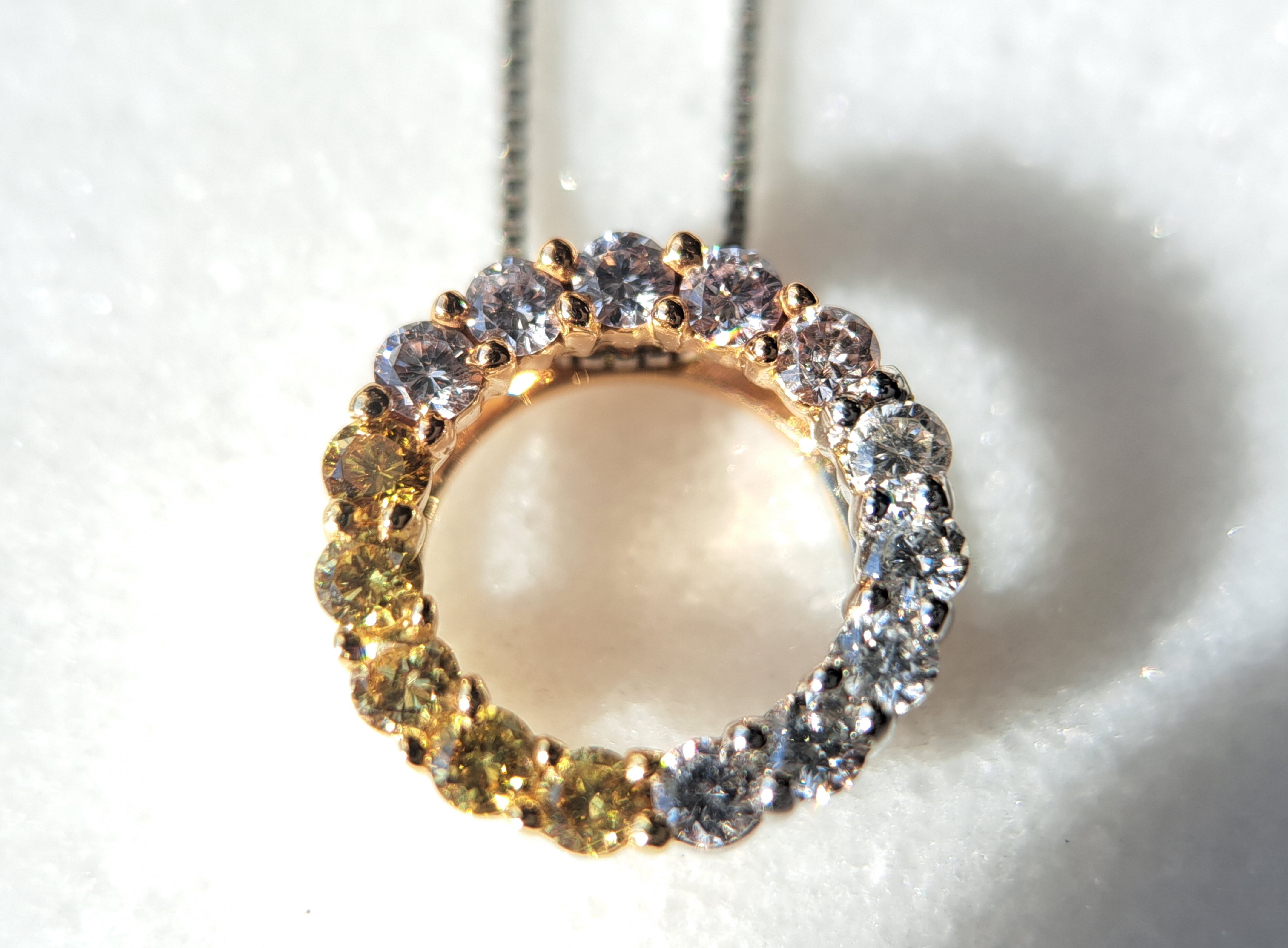 サークル状にピンクダイヤ5石、イエローダイヤ5石、カラーレス5石の計15石の3色のダイヤモンドたちが仲良く並ぶペンダントネックレス。