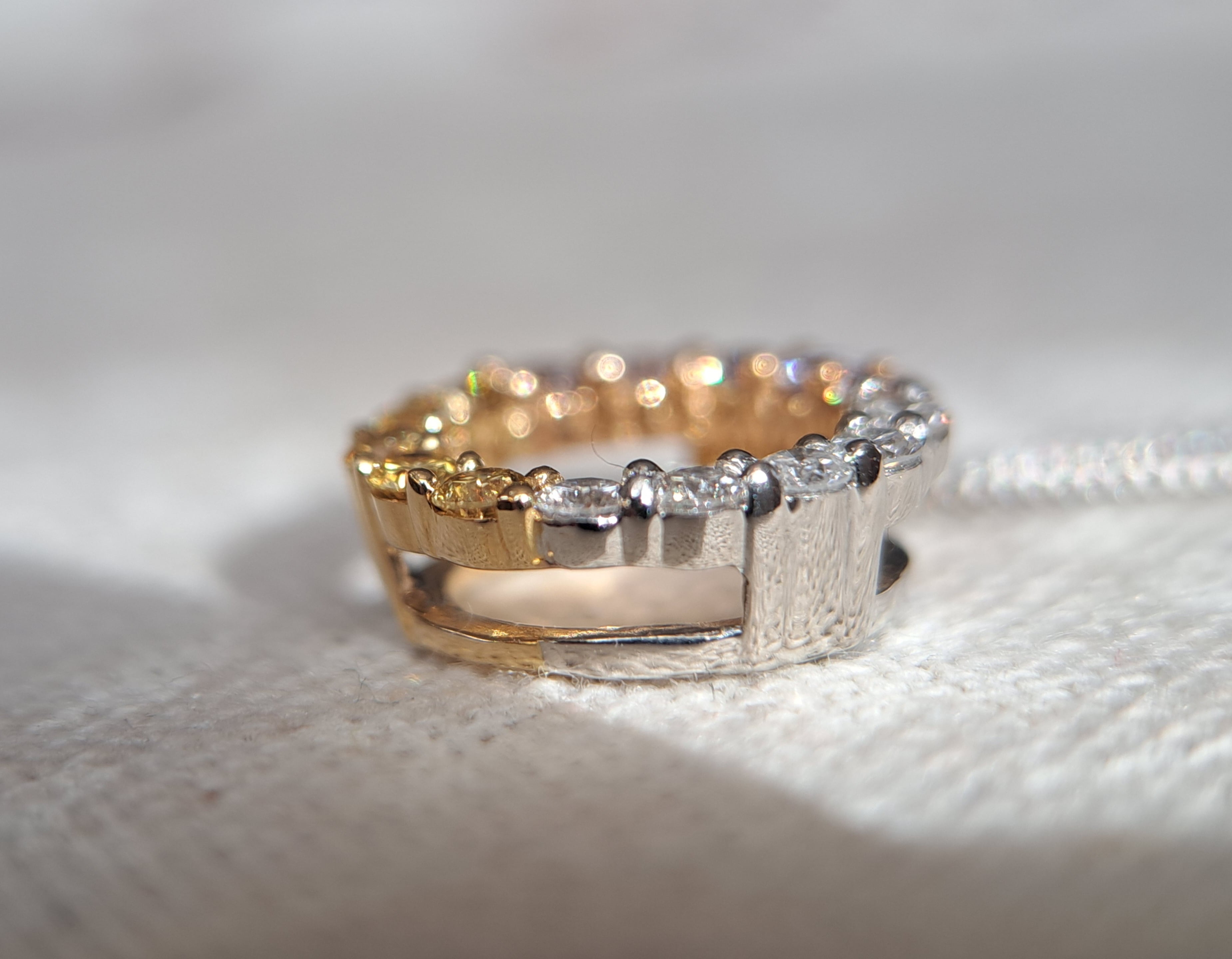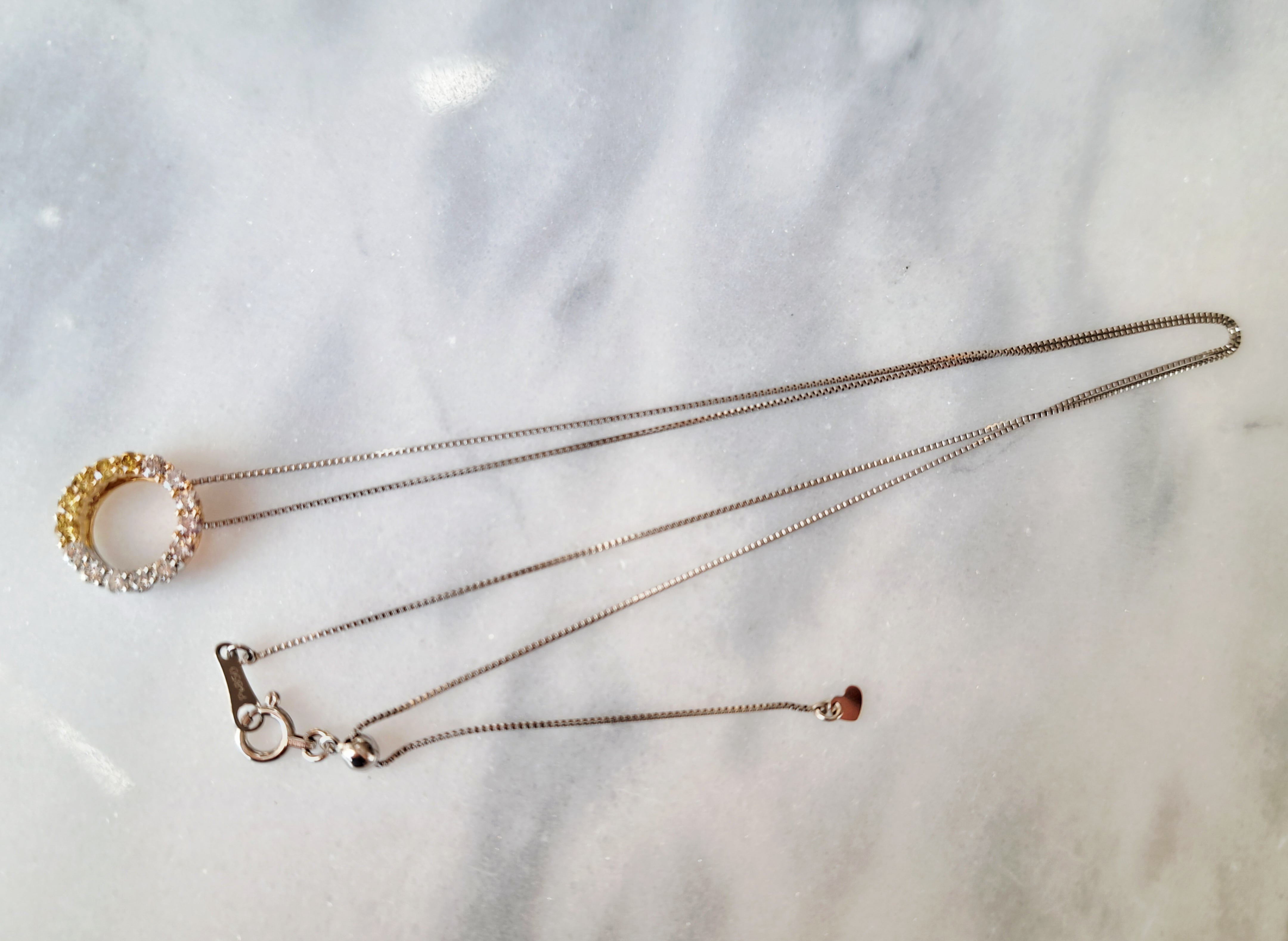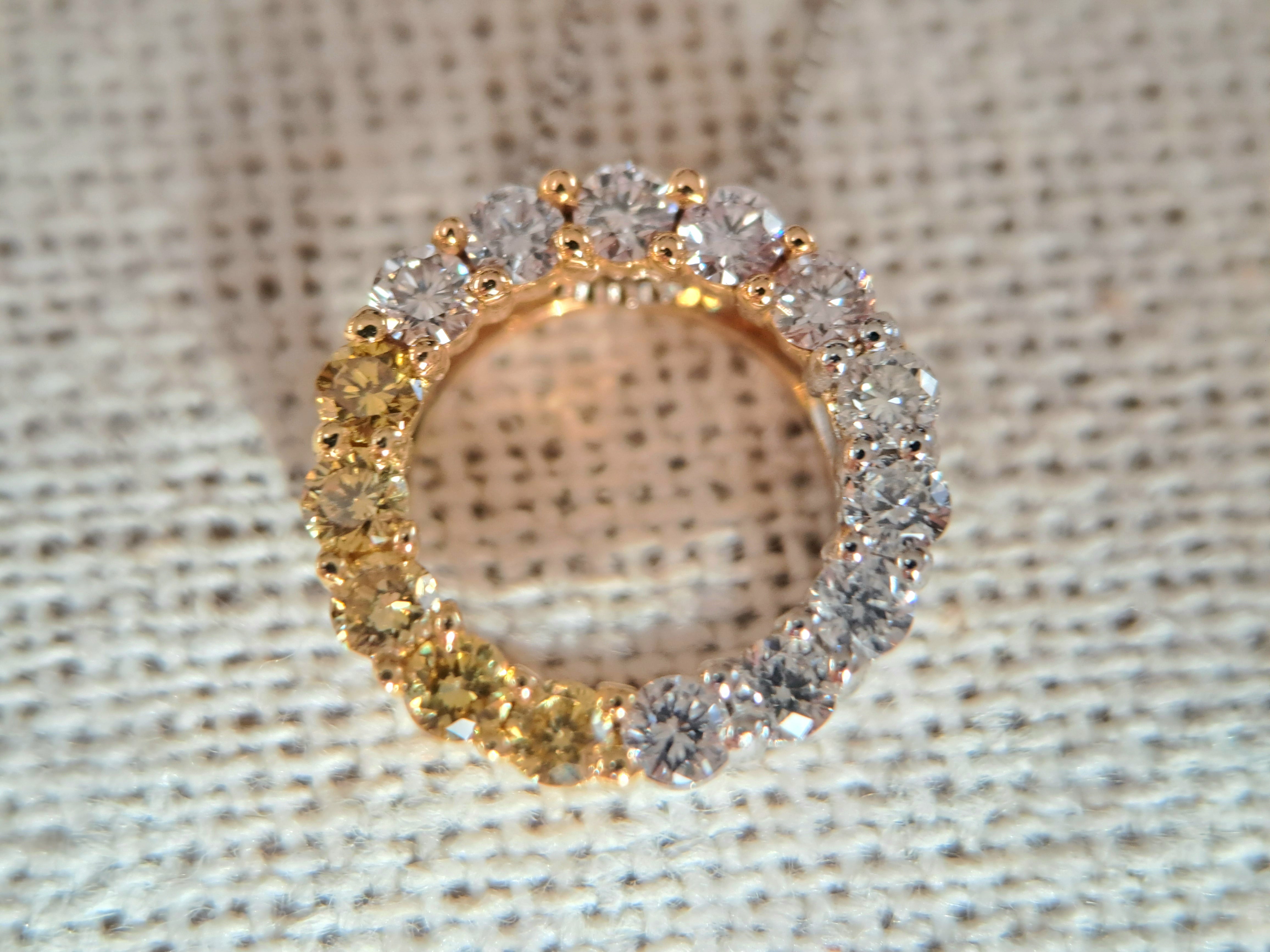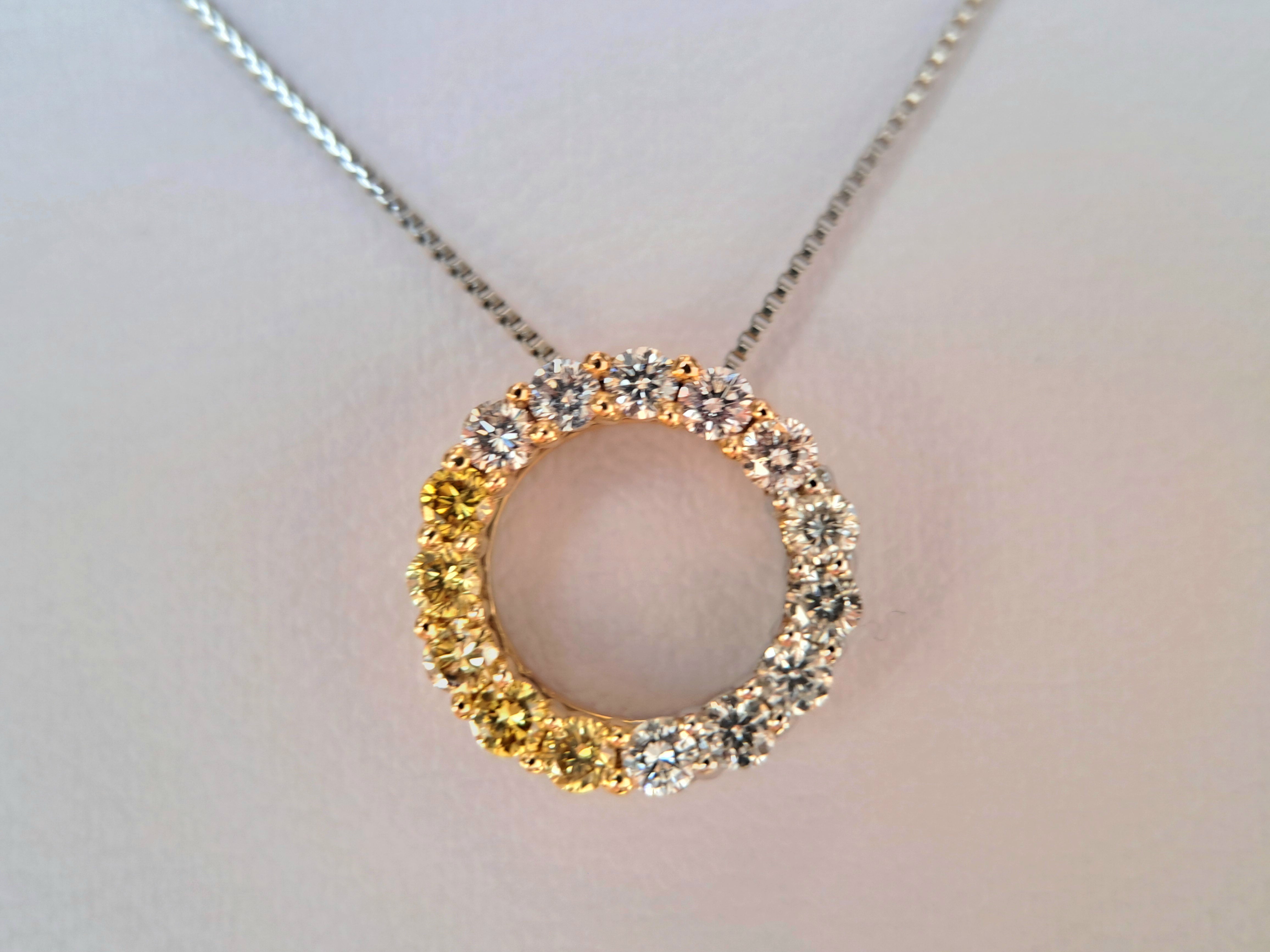 サークル状にピンクダイヤ5石、イエローダイヤ5石、カラーレス5石の計15石の3色のダイヤモンドたちが仲良く並ぶペンダントネックレス。