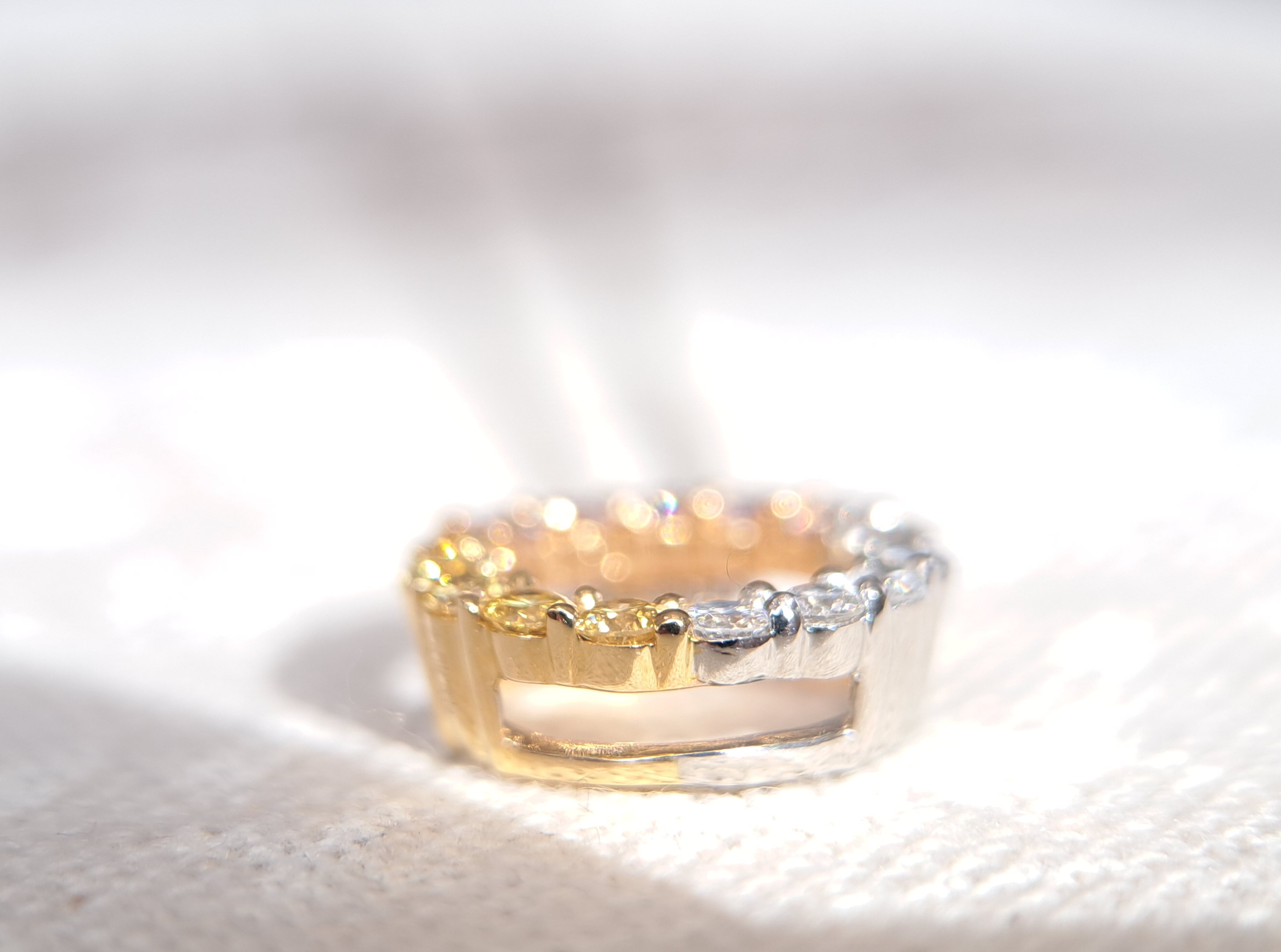 私見、ピンクダイヤはほんのりと淡いlight pink程度、イエローは明確な発色が美しいfancy yellow程度。そして、白い輝きのカラーレスがそれらピンクやエローを引き立てます。