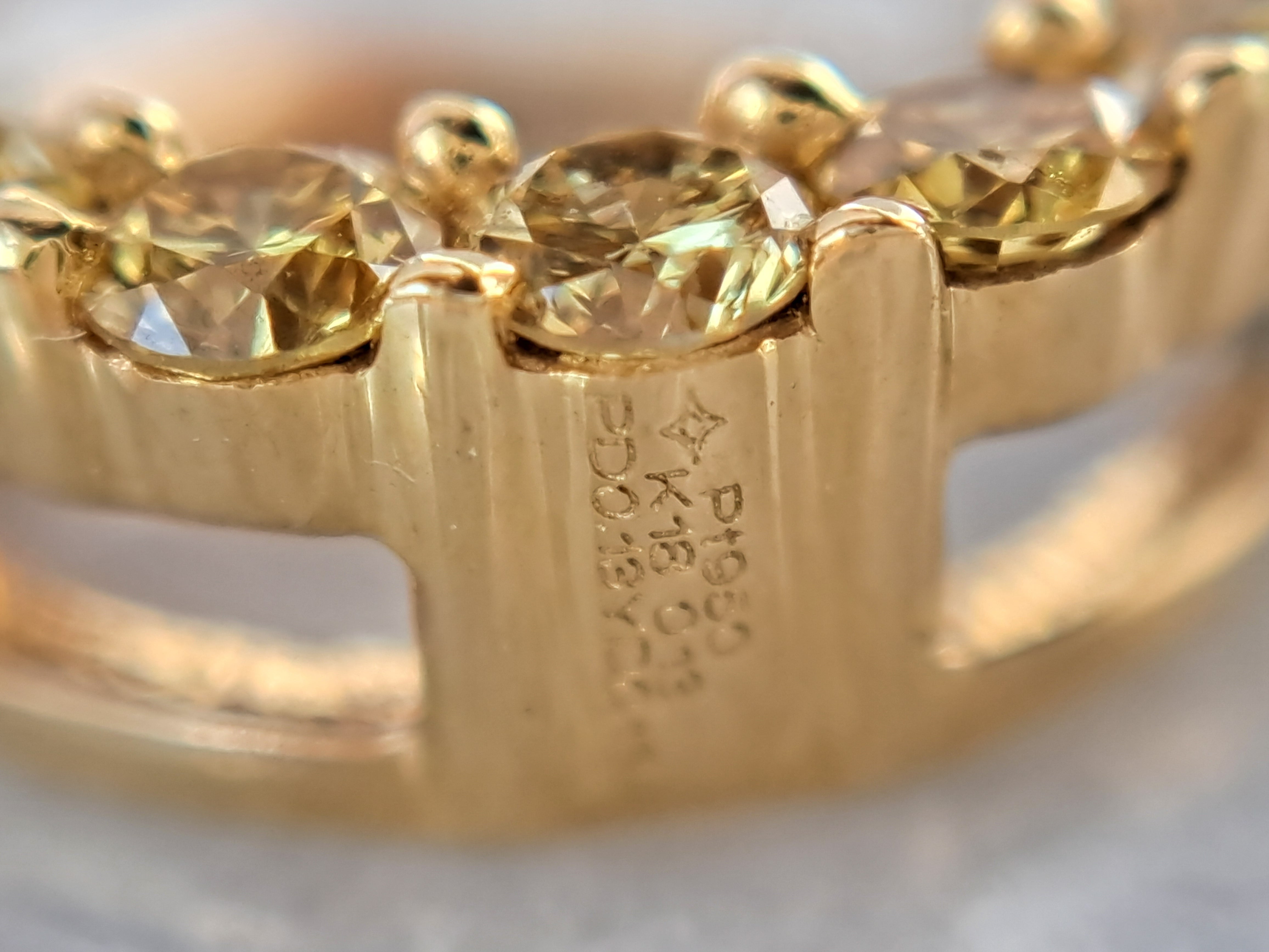 枠もピンクダイヤはK18PG、イエローダイヤはK18YG、カラーレスはPt950と3カラー地金の色を変え、凝っています。
