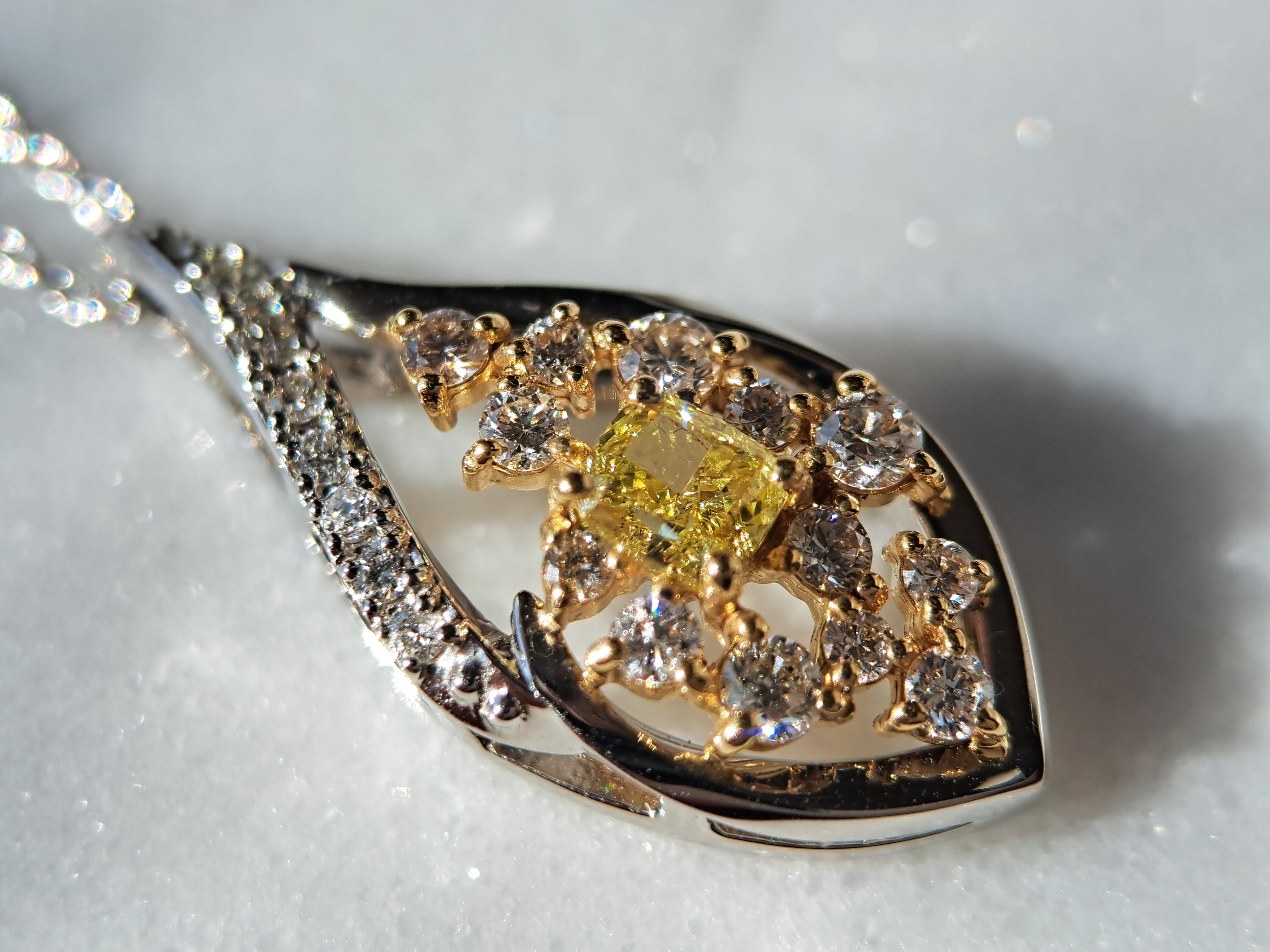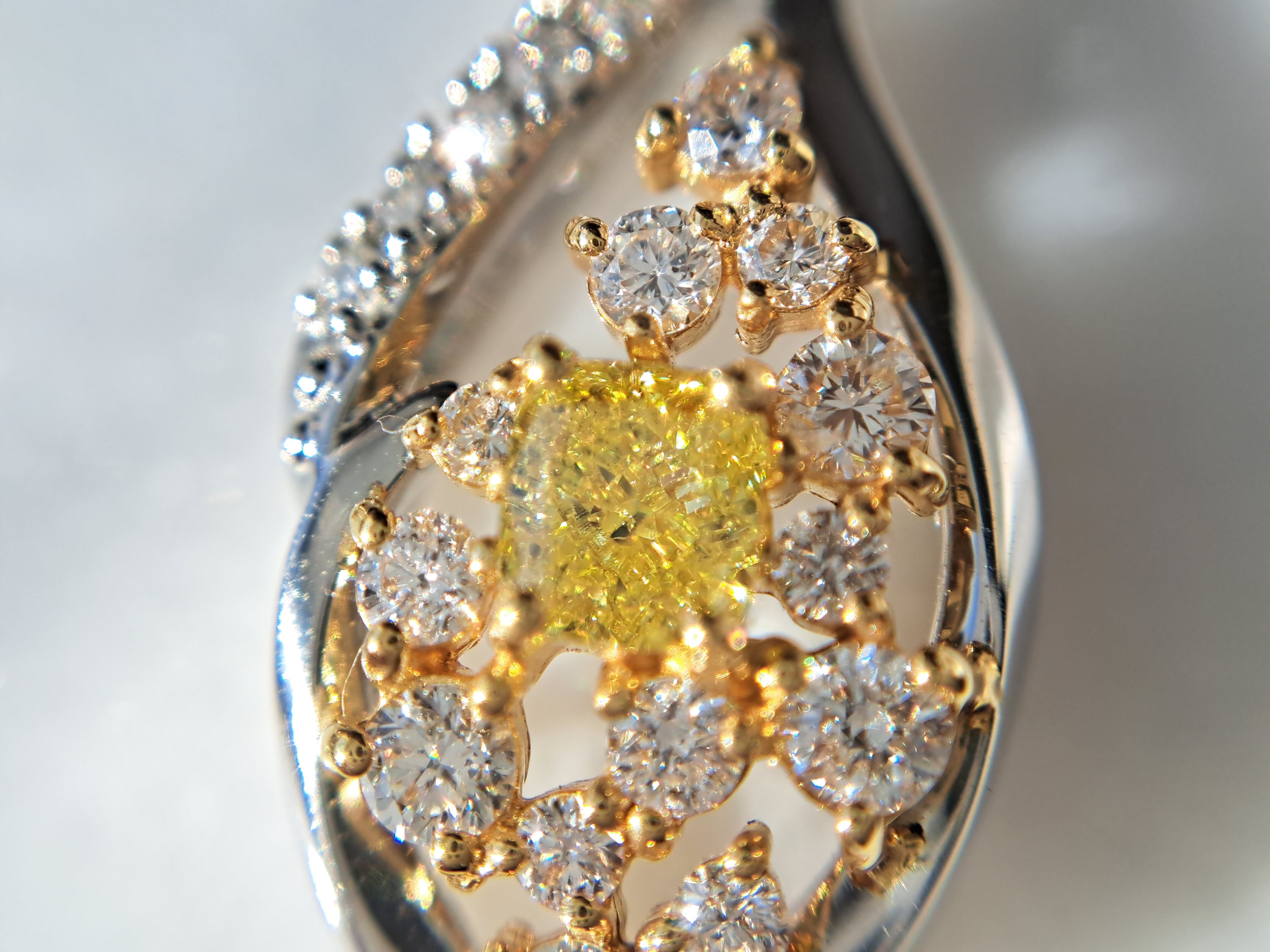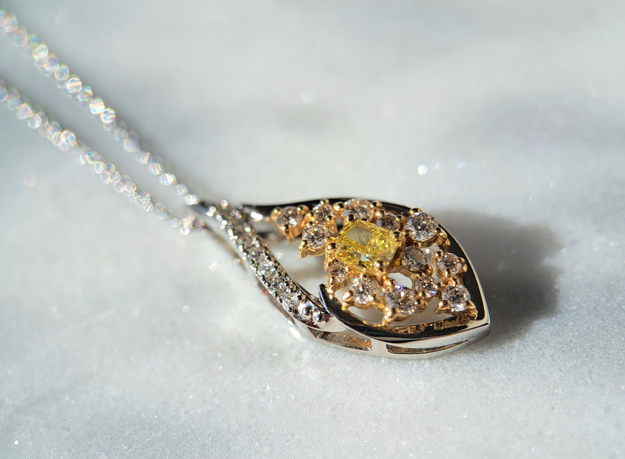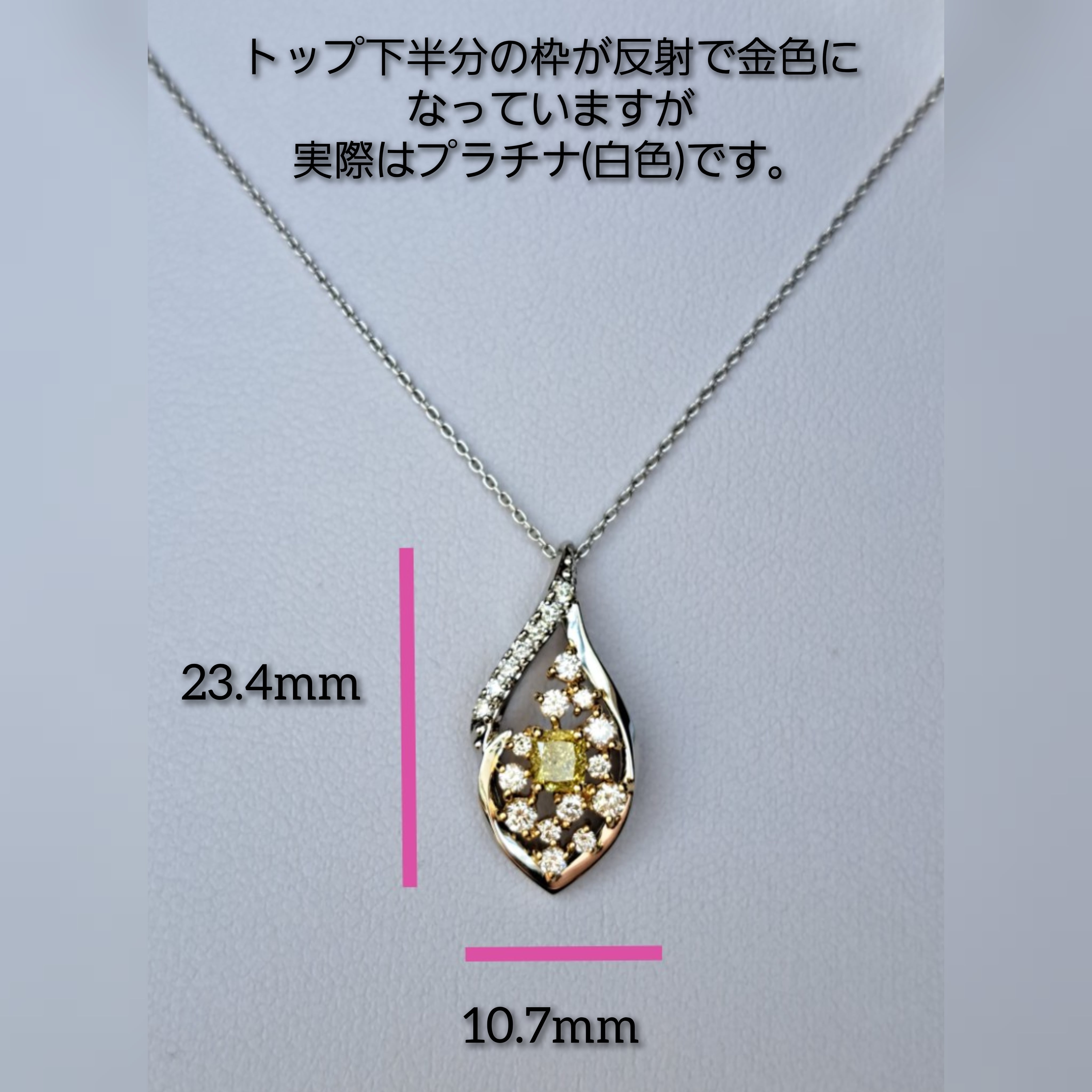 ペンダントトップの枠はPt950の白い地金ベースですが、メインのイエローダイヤモンドと
