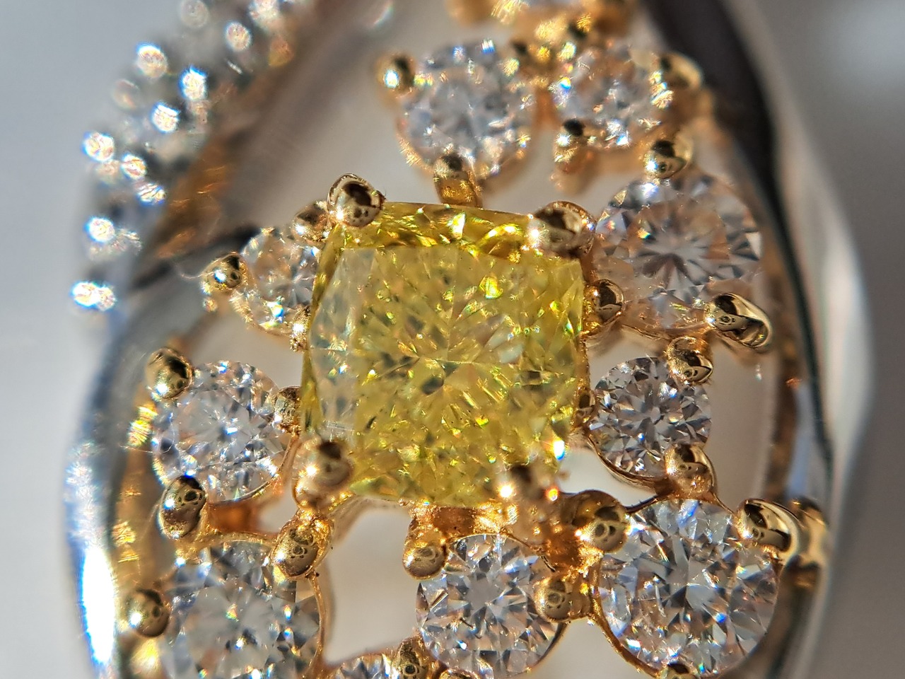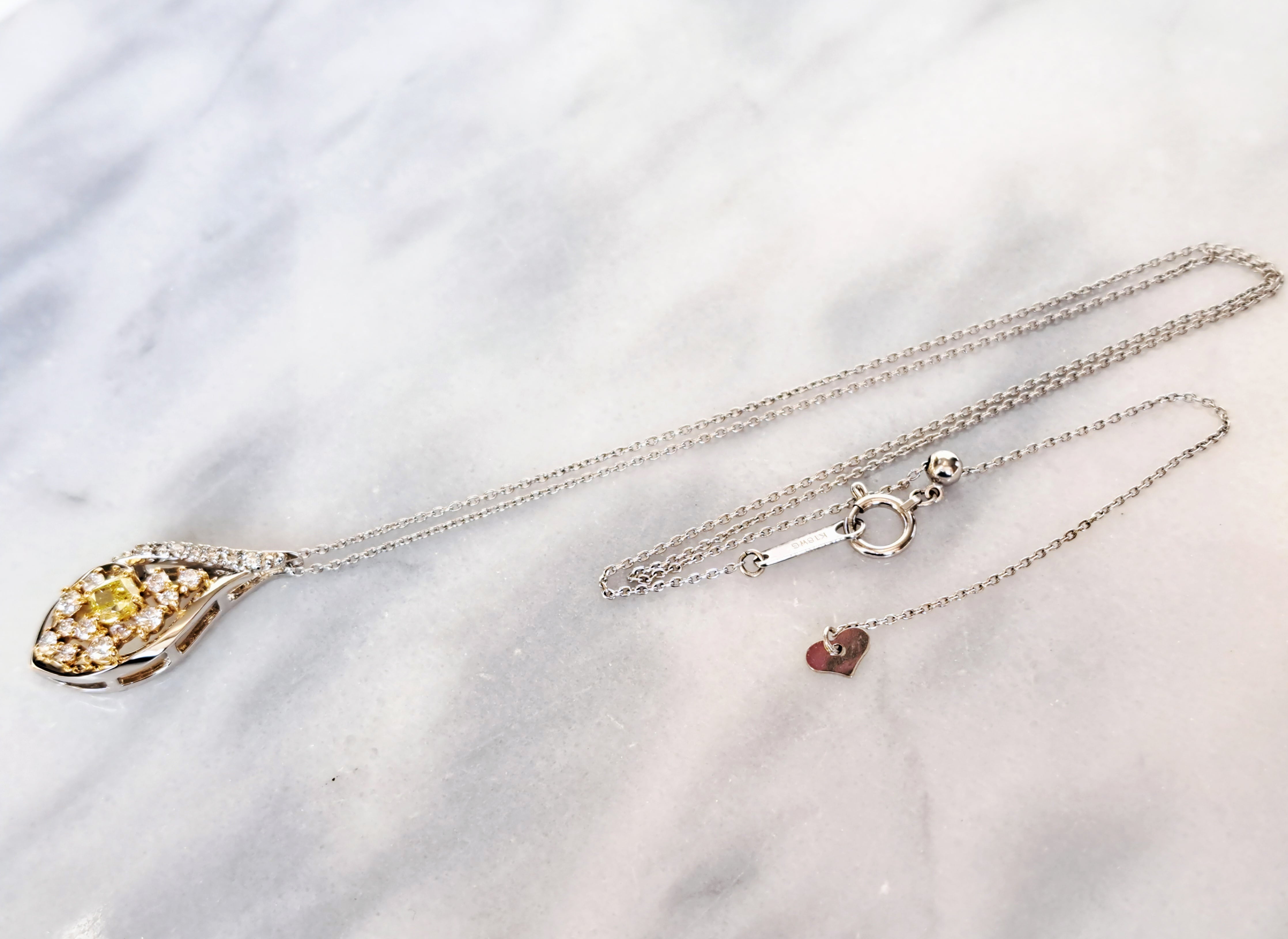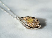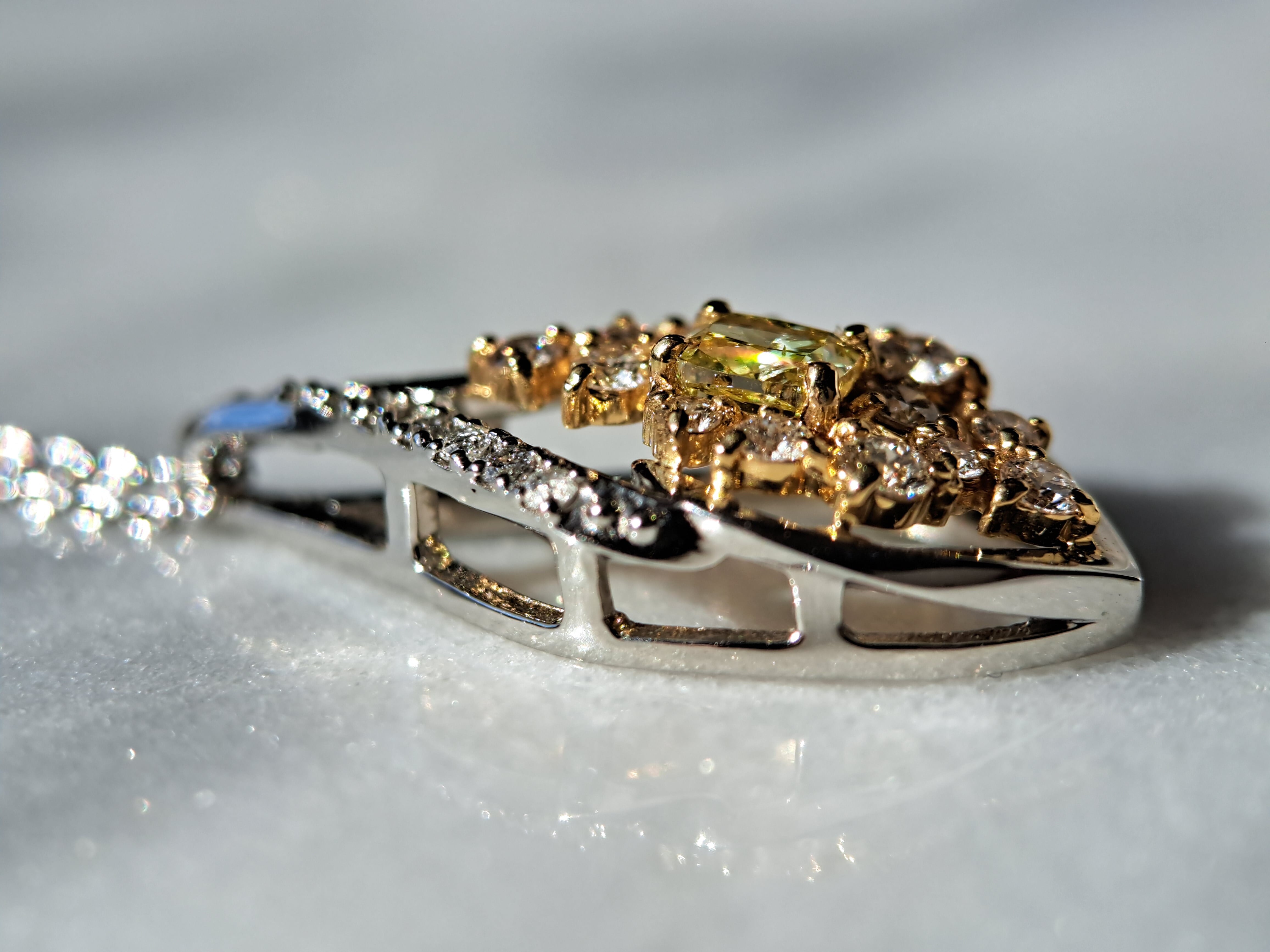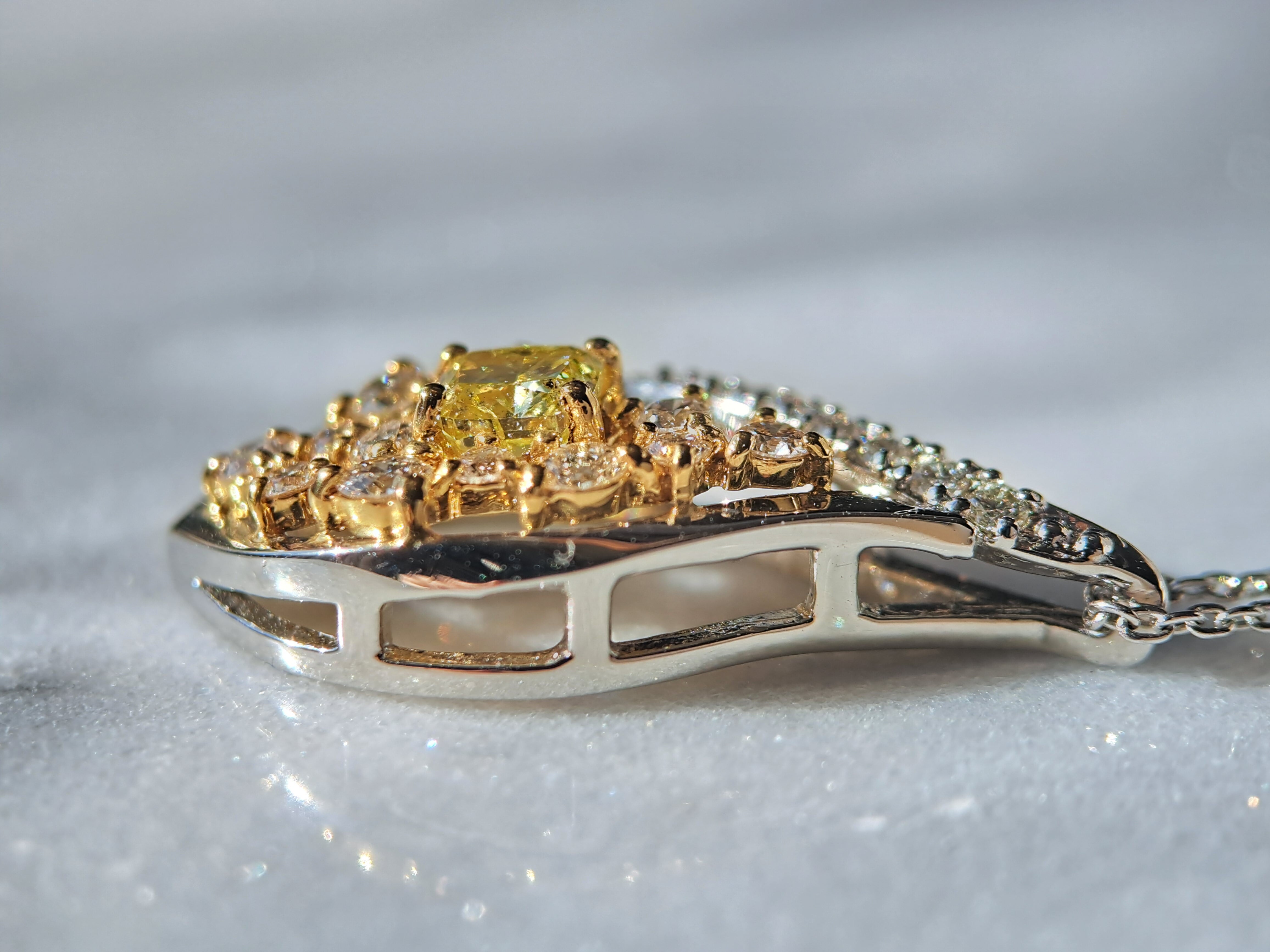 ペンダントトップの枠はPt950の白い地金ベースですが、メインのイエローダイヤモンドと