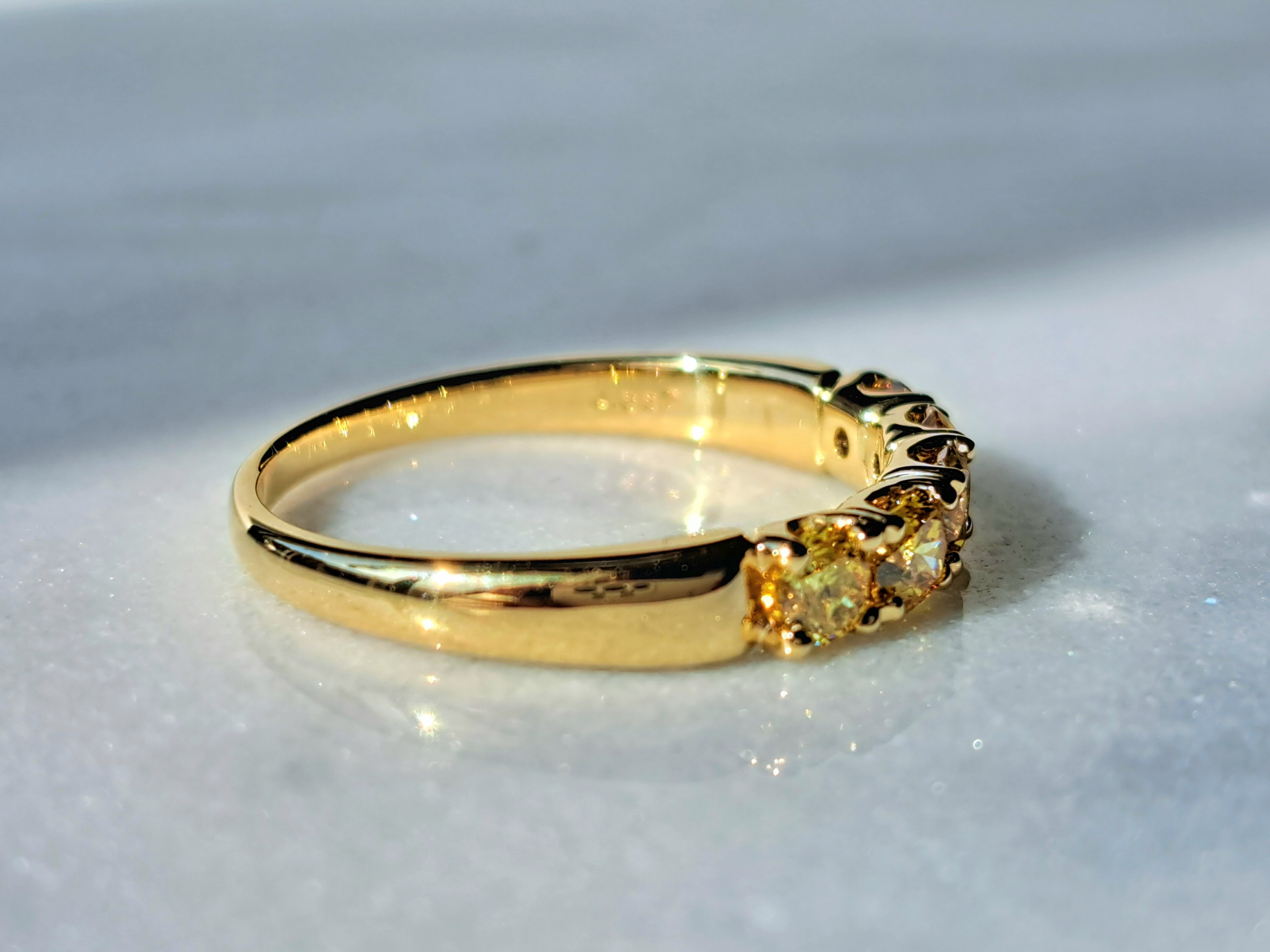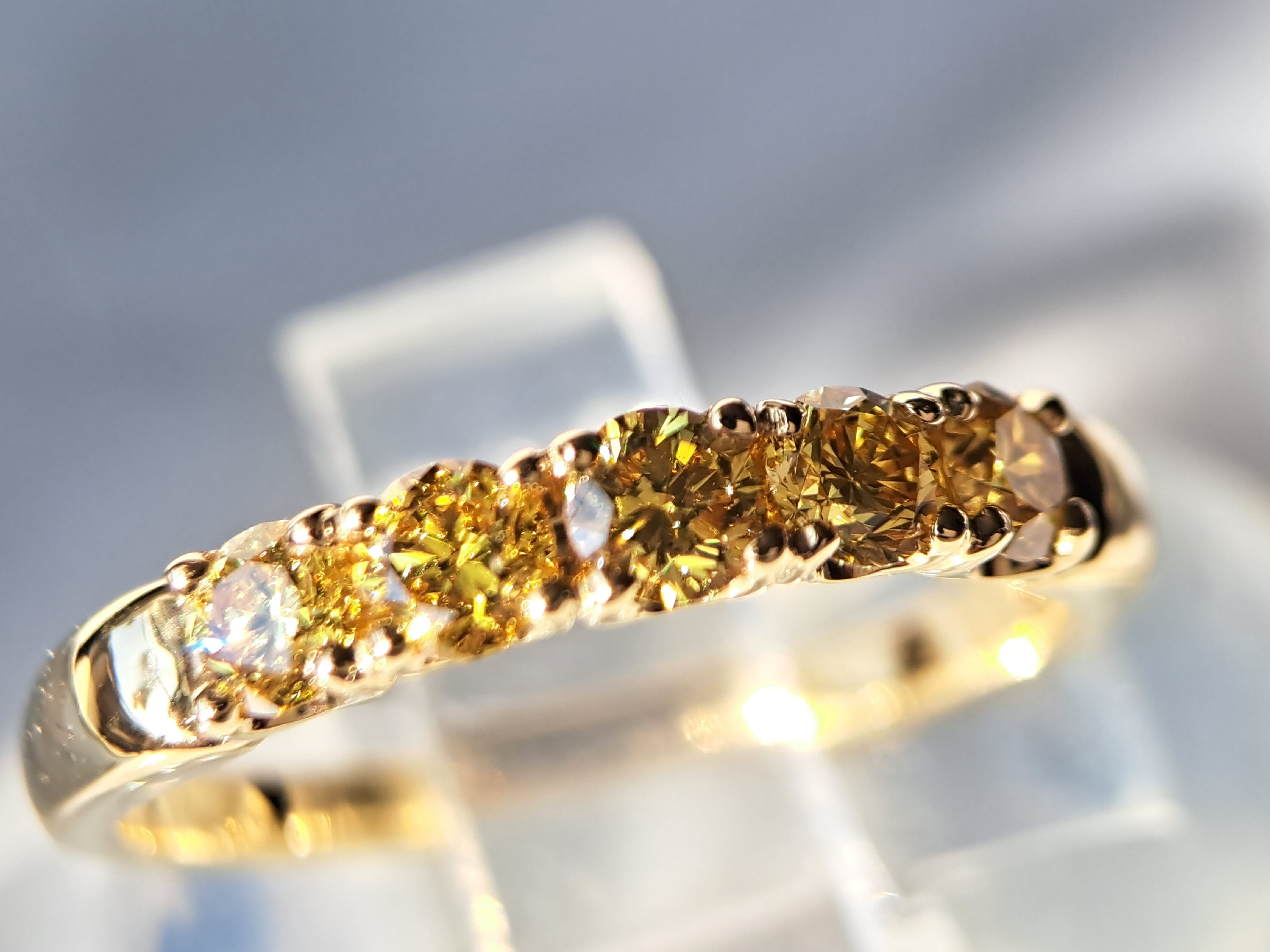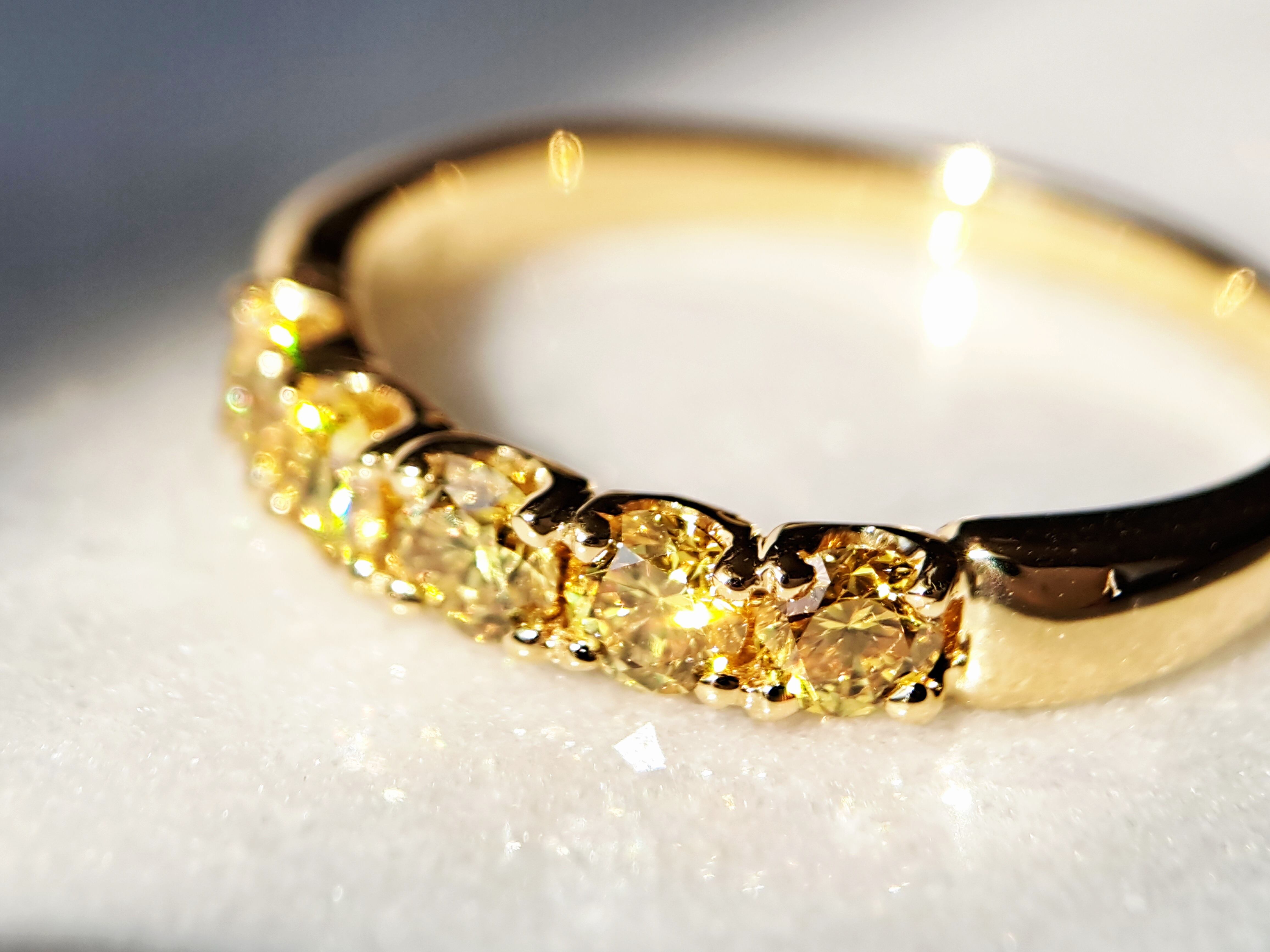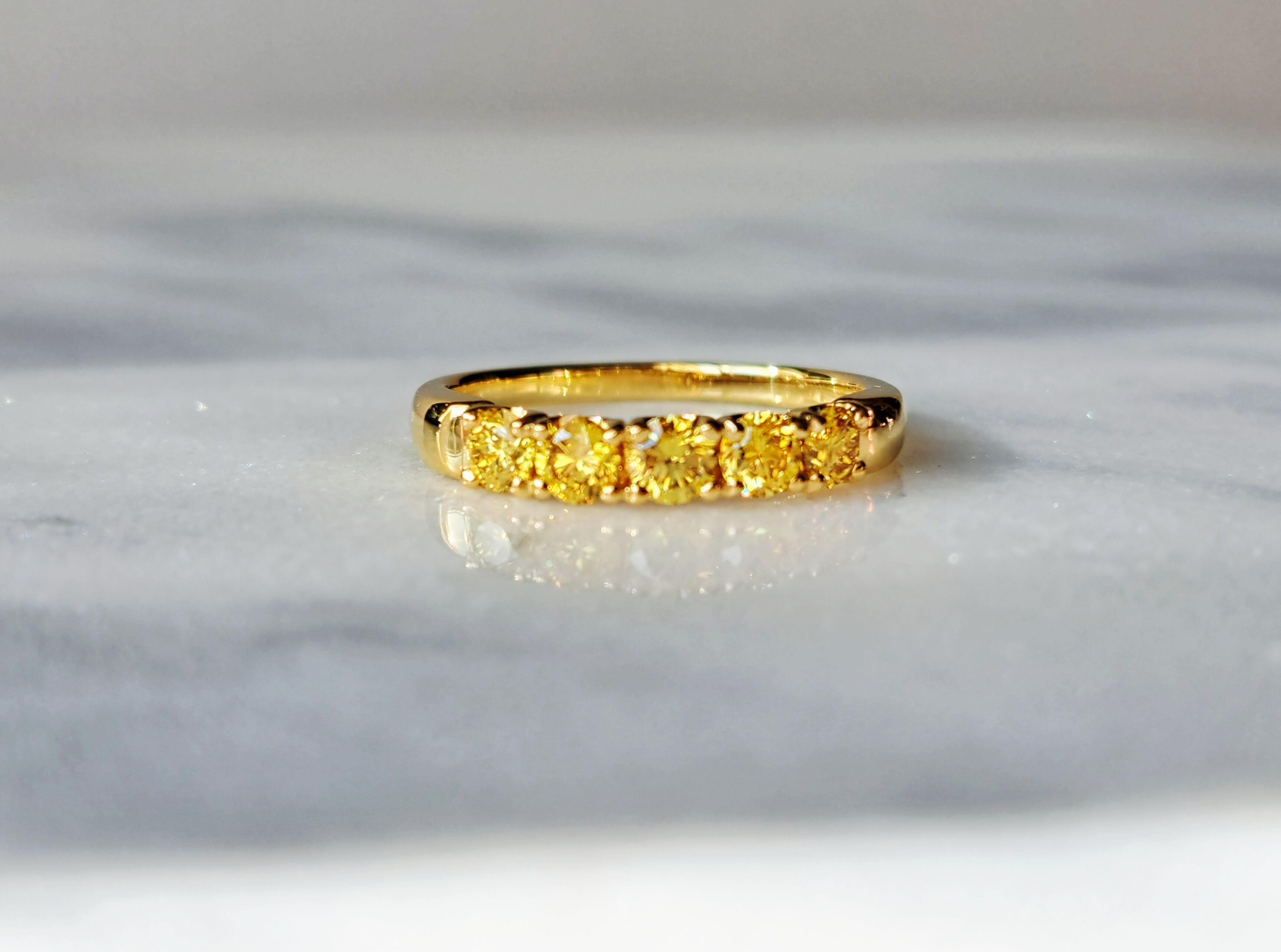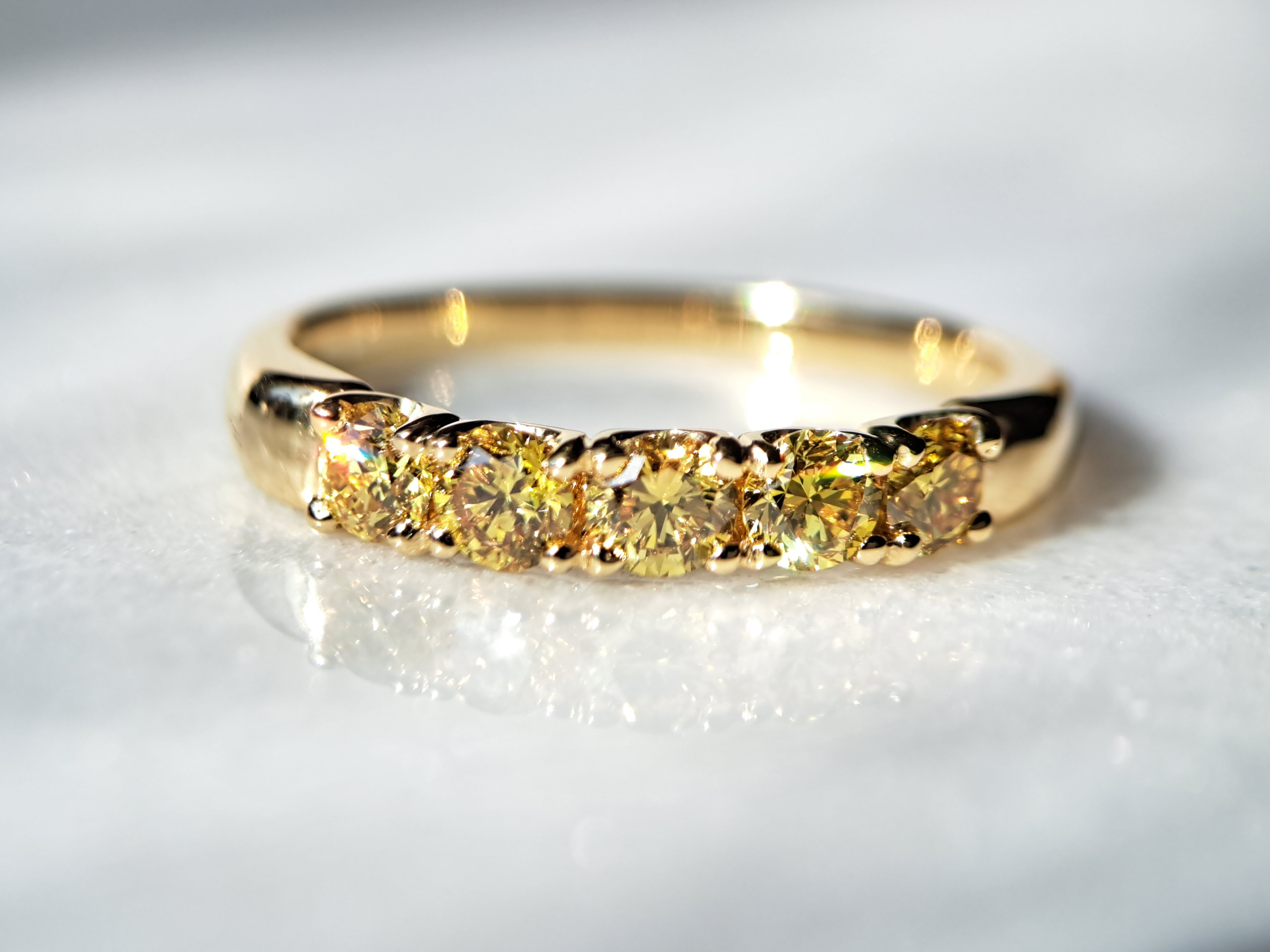 まったりとしたK18YGのベースに鎮座する、目にも鮮やかなfancy vivid yellow5石のダイヤモンドたち。