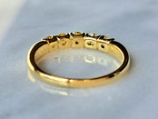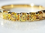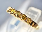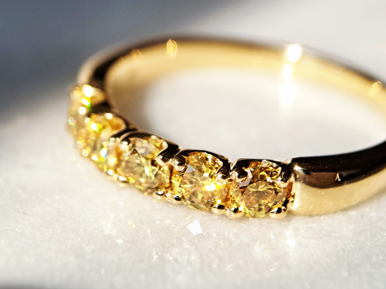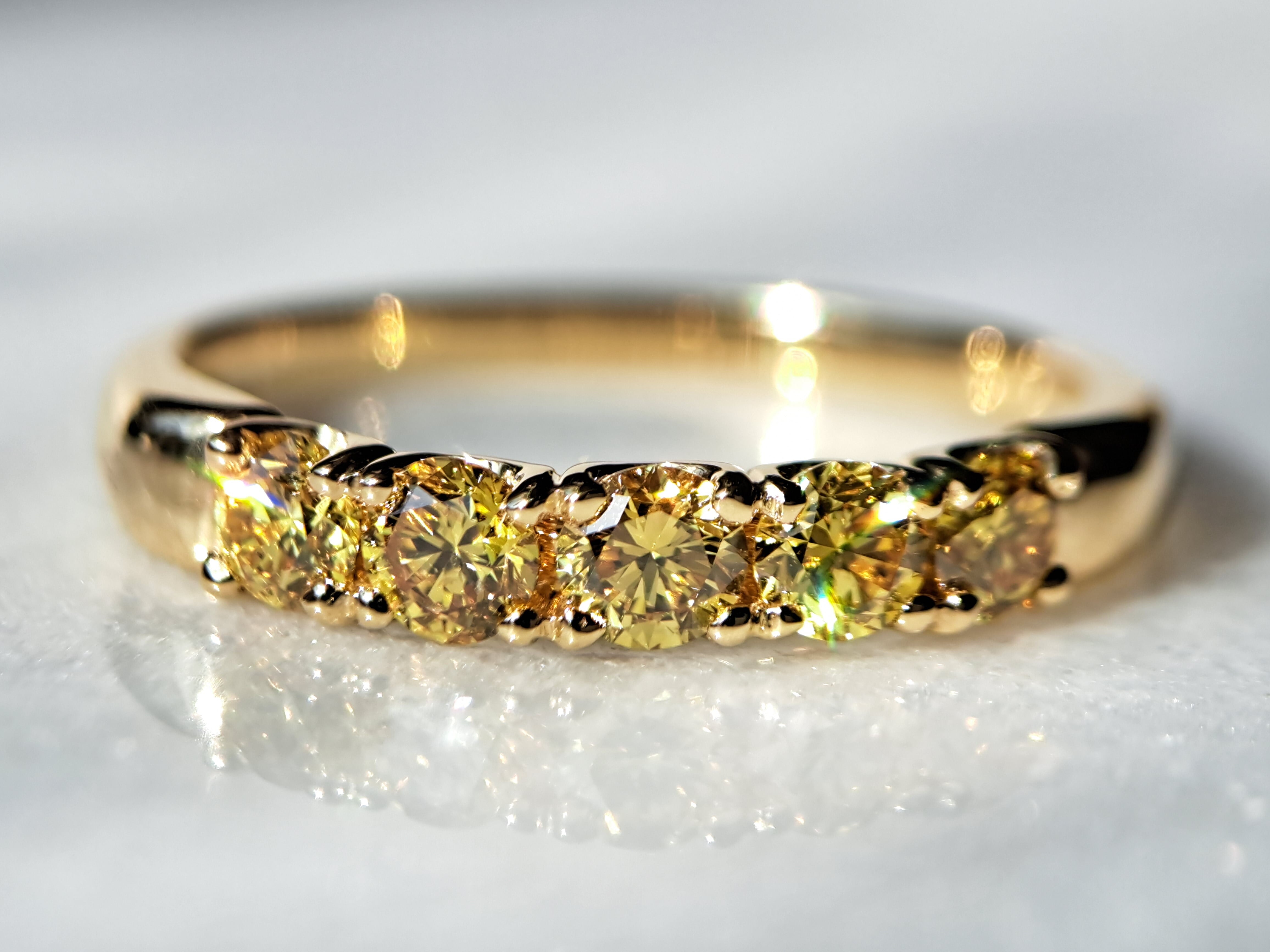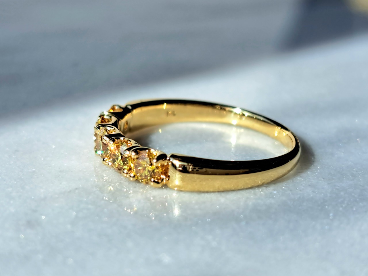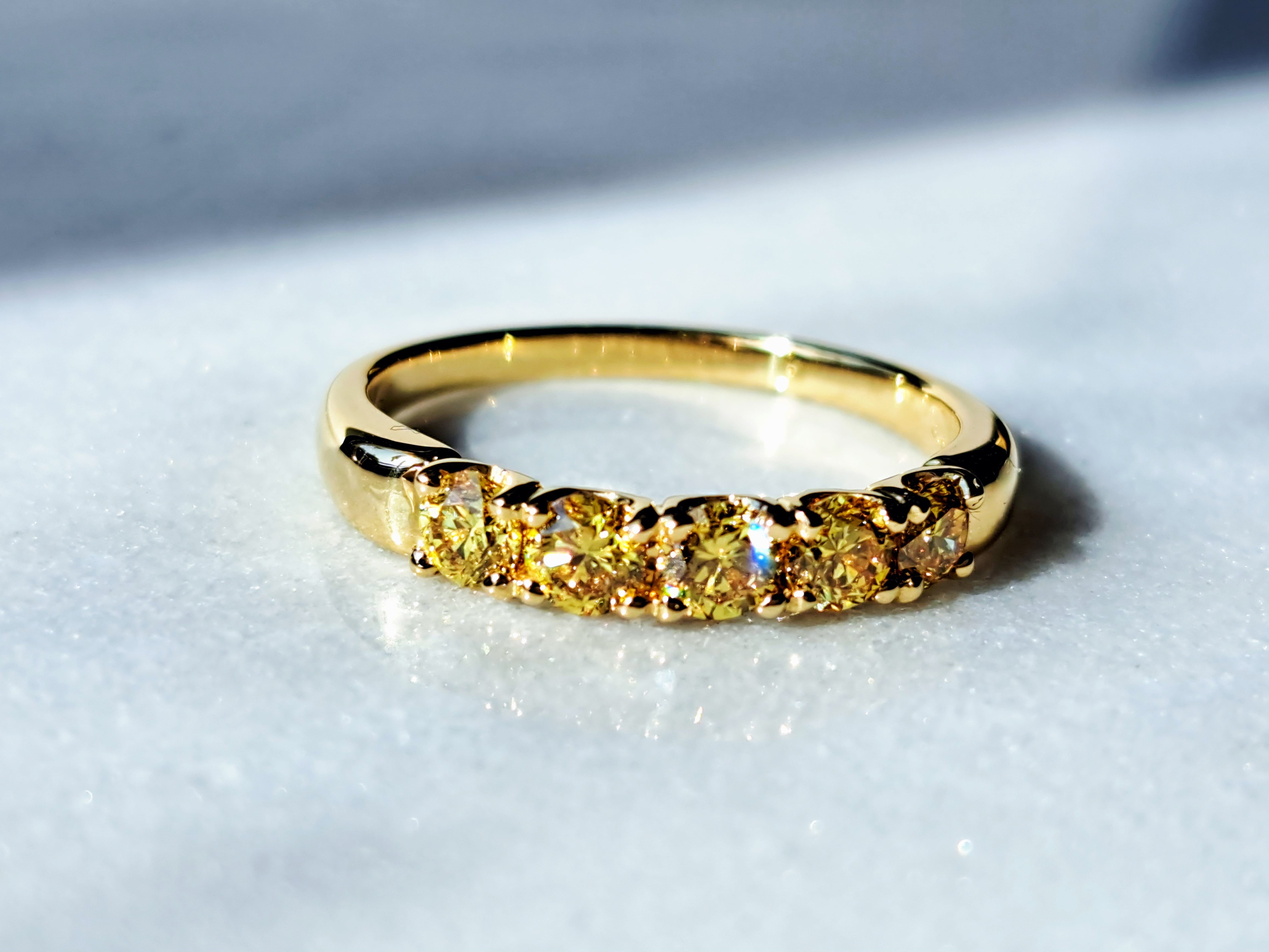 まったりとしたK18YGのベースに鎮座する、目にも鮮やかなfancy vivid yellow5石のダイヤモンドたち。