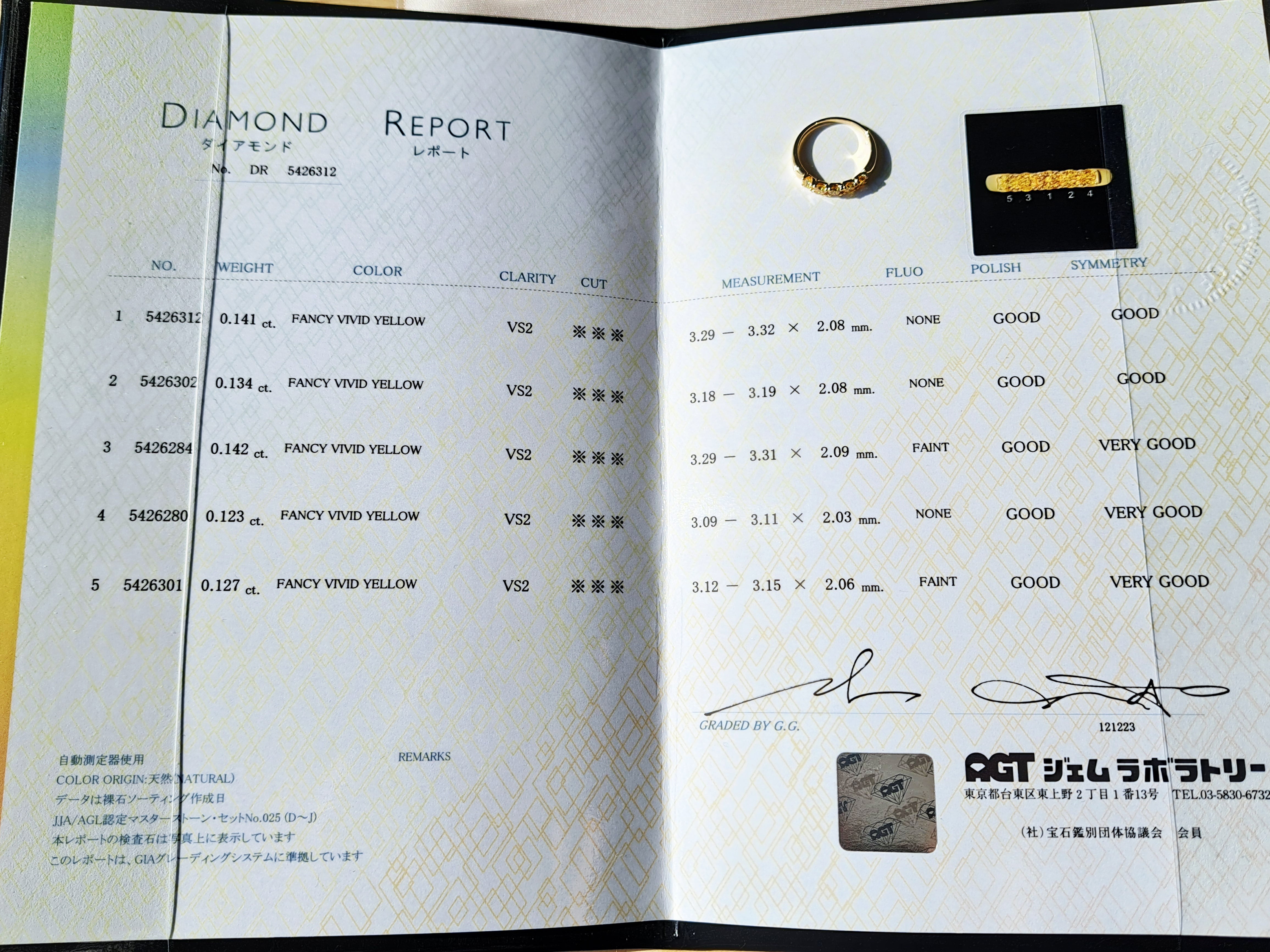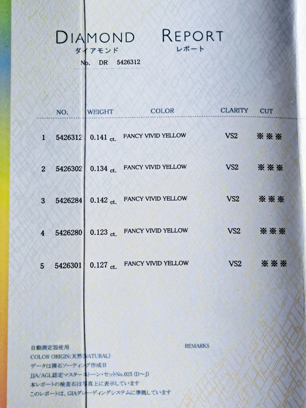 5石ともカラーは最高峰vivid、クラリティも傷がほぼ見当たらぬVS2、オマケにカットバランス(シンメトリー)very good or goodと超ハイスペックな厳選された優秀なイエローダイヤモンドたちです。