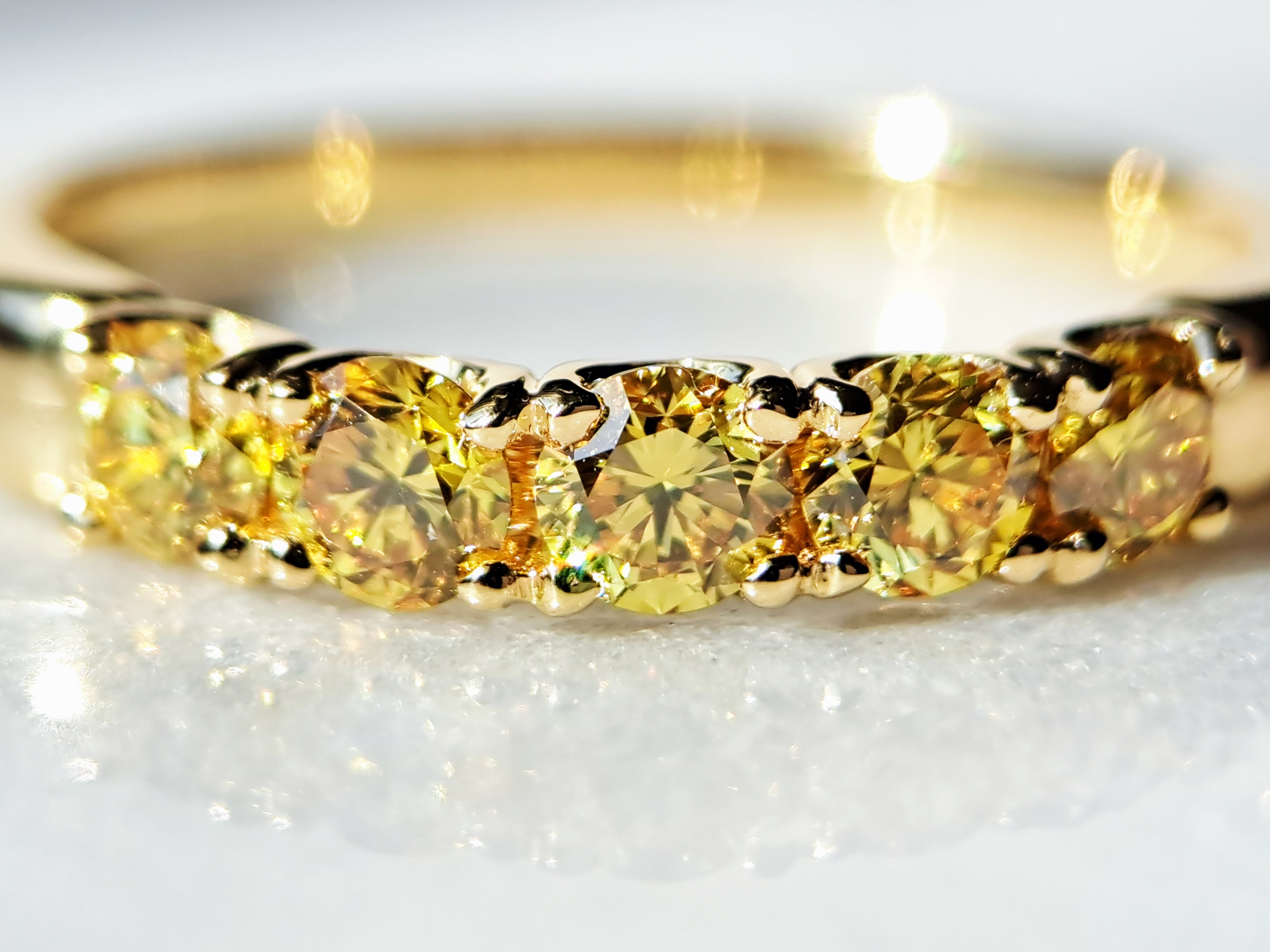 そうした選抜き5石計0.667ctのイエローダイヤモンドは当然色調もバッチリ統一され、横並び一文字から放たれる鮮やかなイエローの華やかオーラが、何とも美しい。
