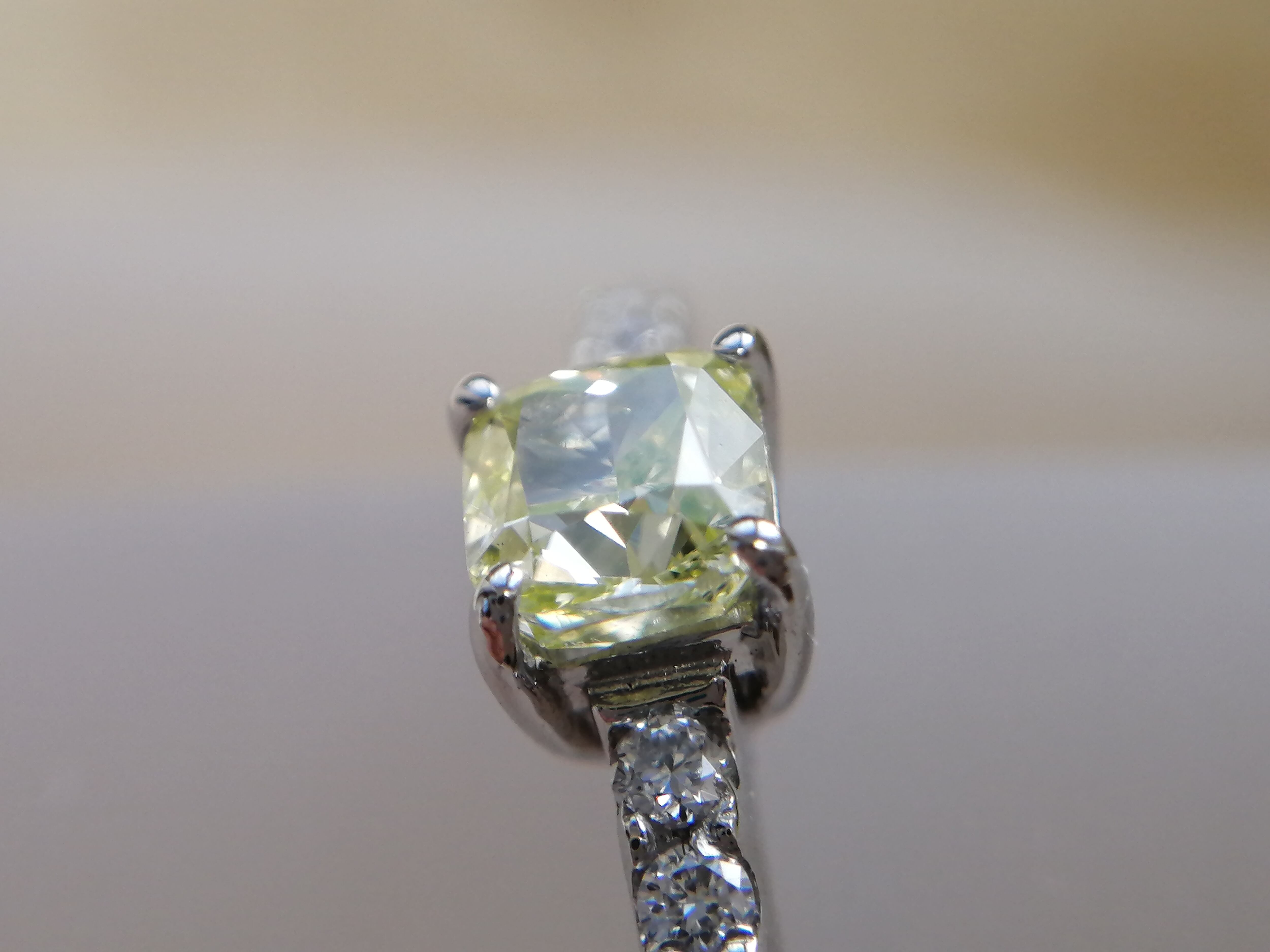 クッションカットのfancy yellow green、まずこのかたちが魅力的。0.235ct、四角いシェイプは厚みのあるものが多く、それゆえ色が溜まりグリーンがとても色濃く目に映ります。