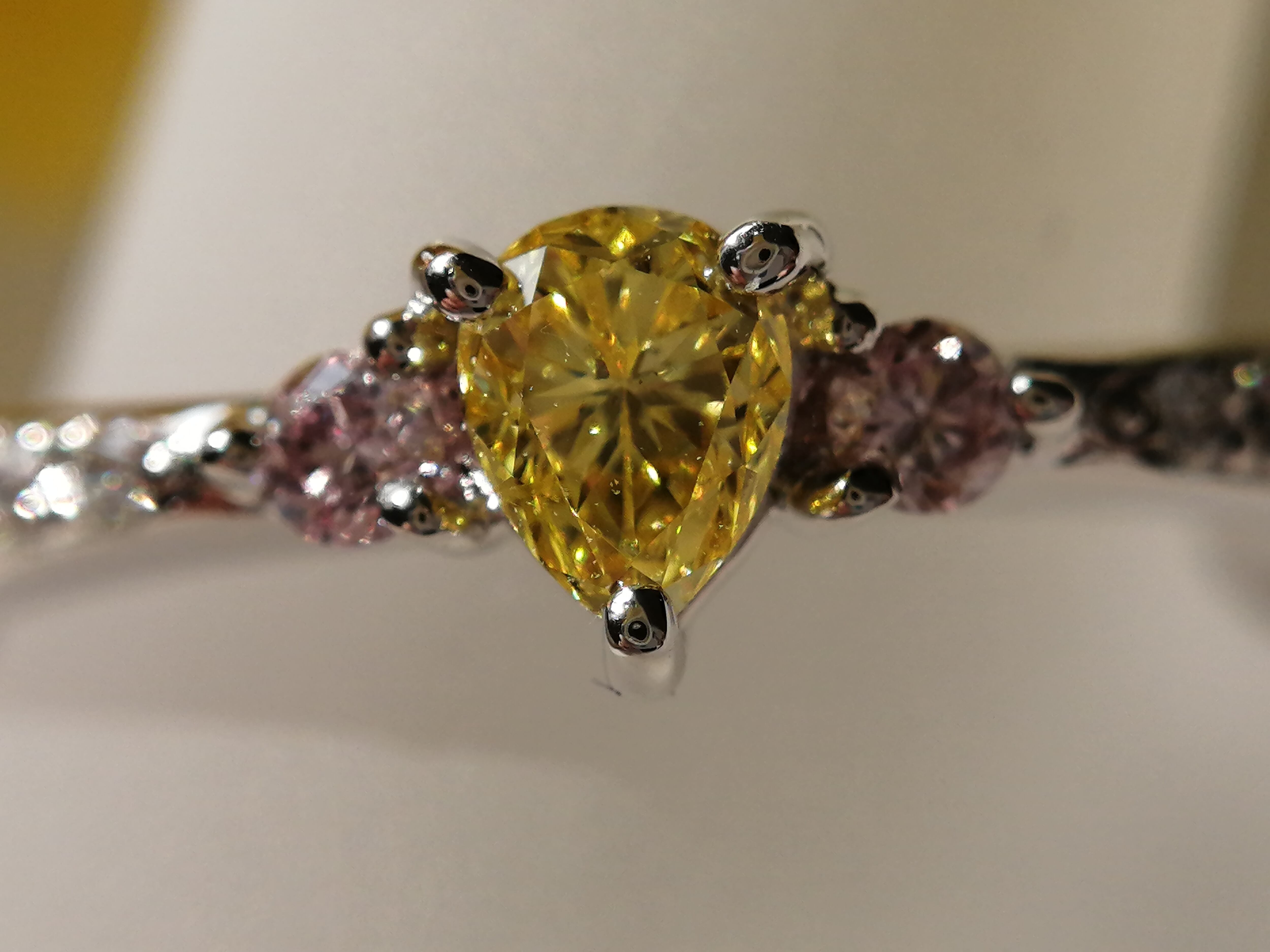 カラーダイヤモンドの楽しみ方として、カラーとカラーを並べ、ぶつける組合わせを私は皆さんにご提案したいです。このイエロー&ピンクは、まさにそのような楽しみ方ができオススメです。