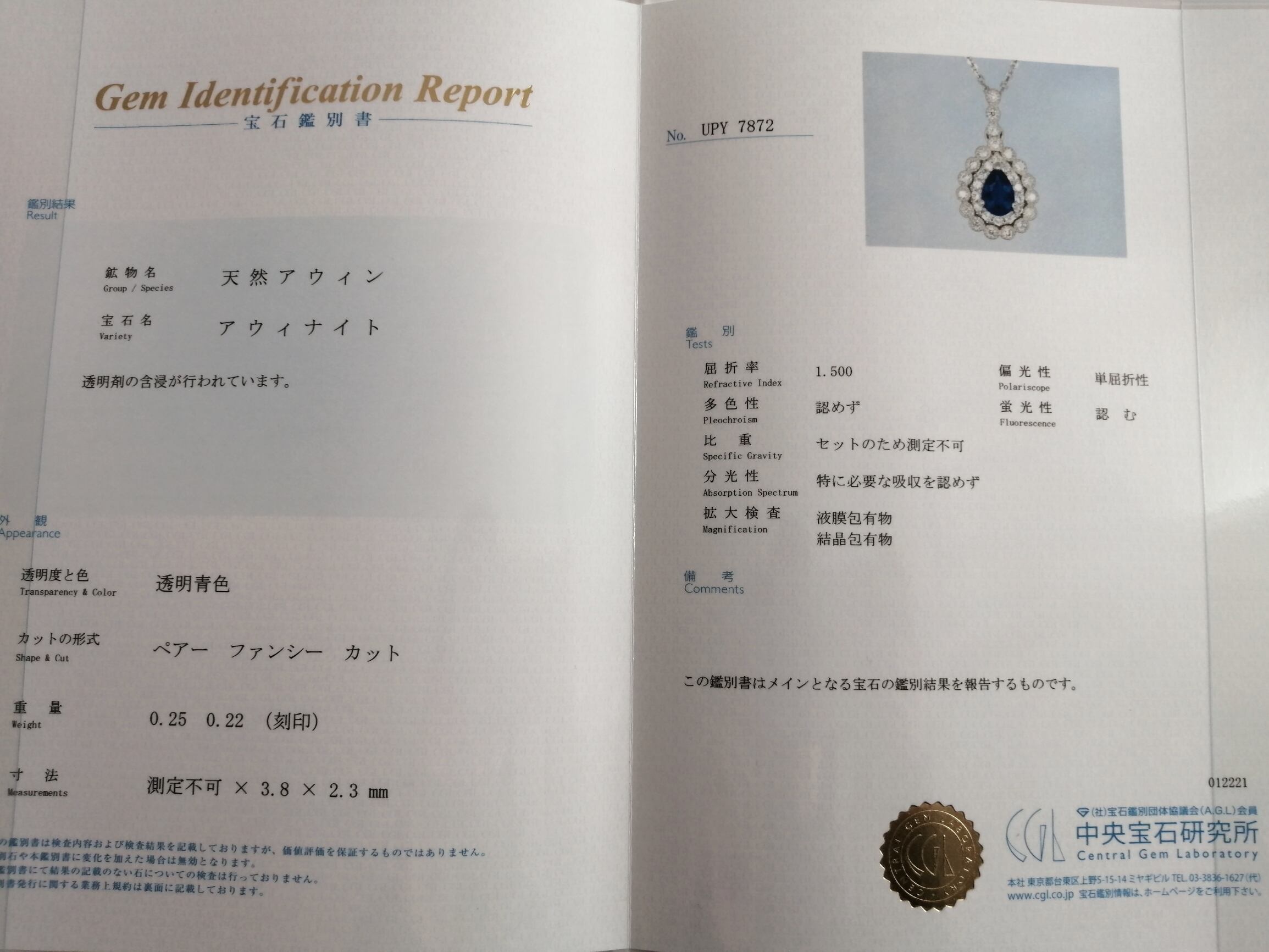 【付属品】中央宝石研究所 鑑別書