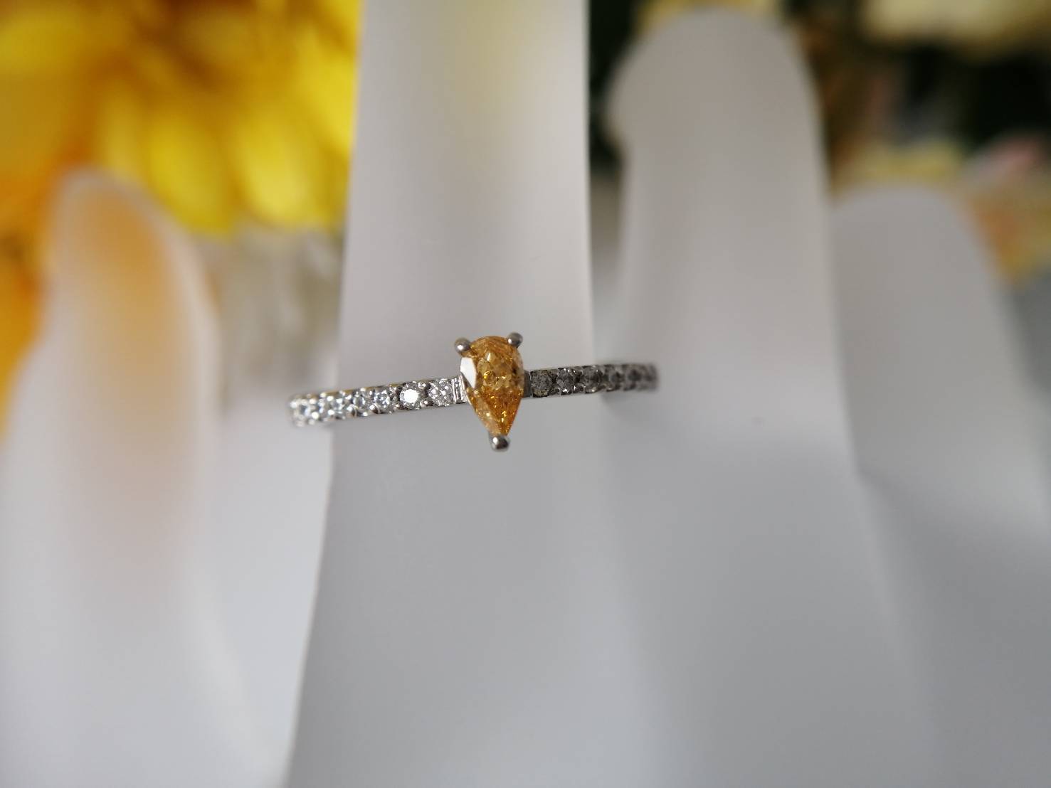 クラリティVS2、蛍光性strong yellowも相まって、日差しのもとで鮮やかなオレンジの強いイエローにキラキラと輝きます。