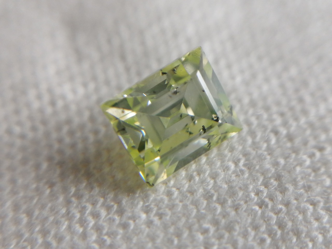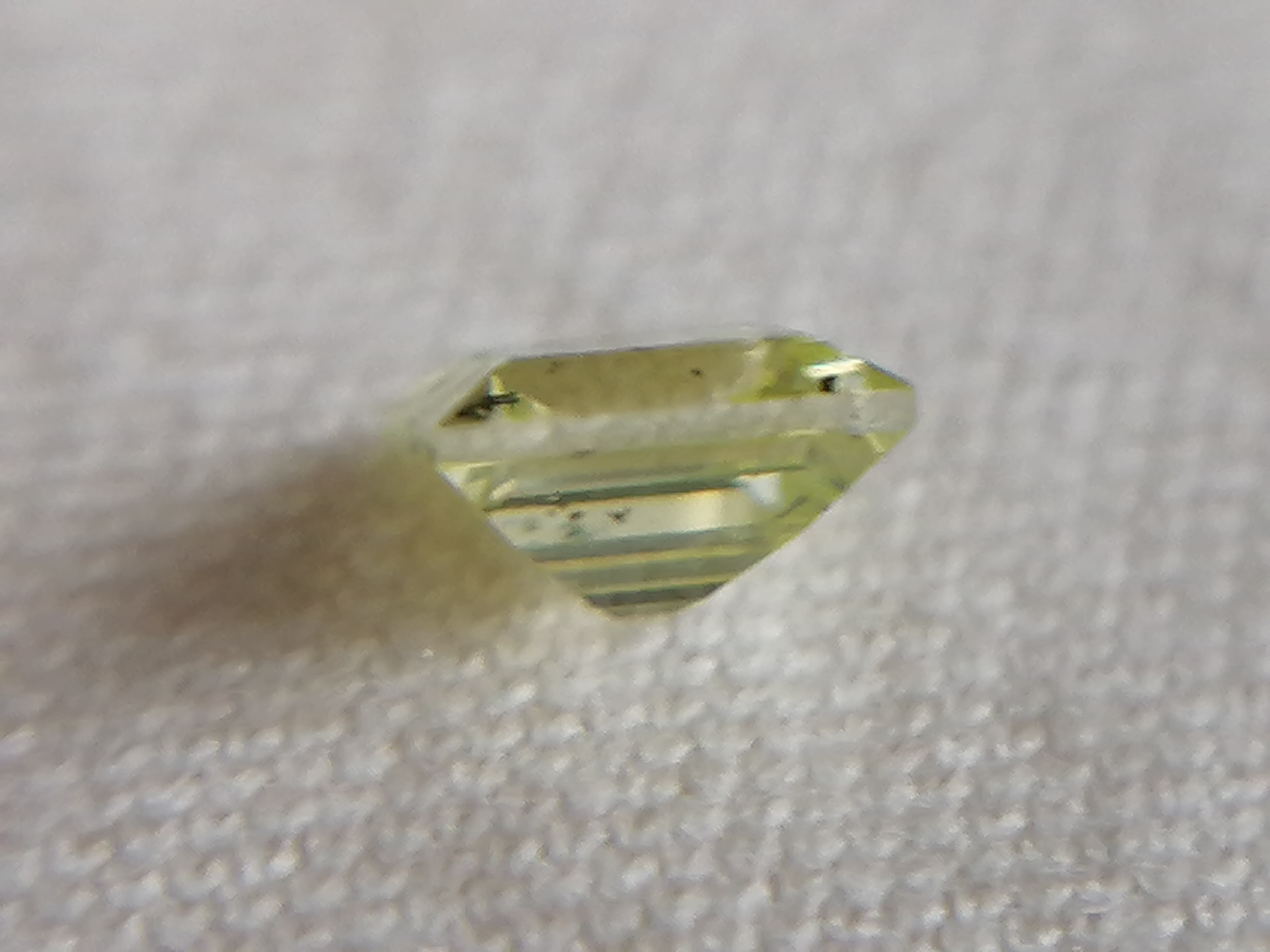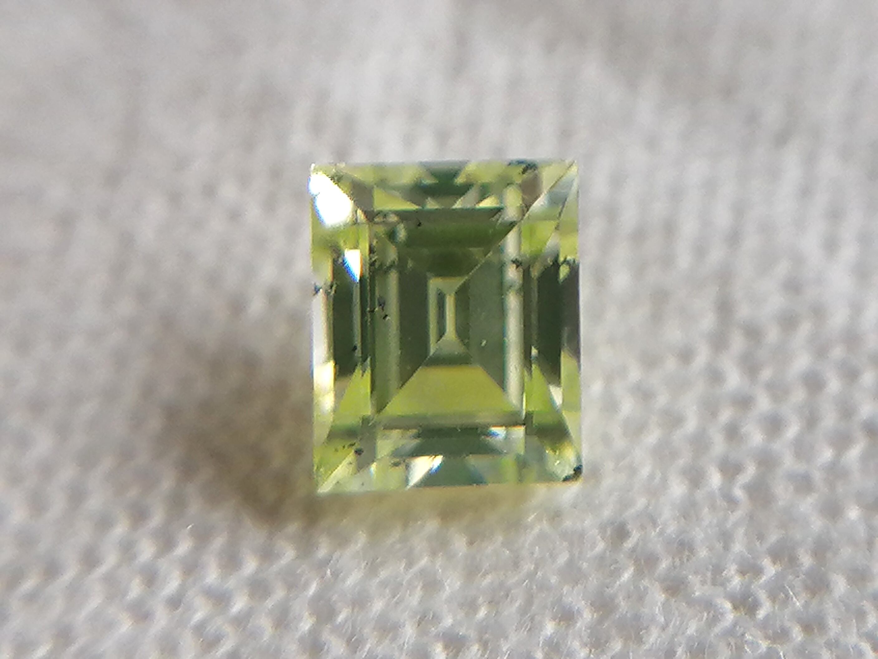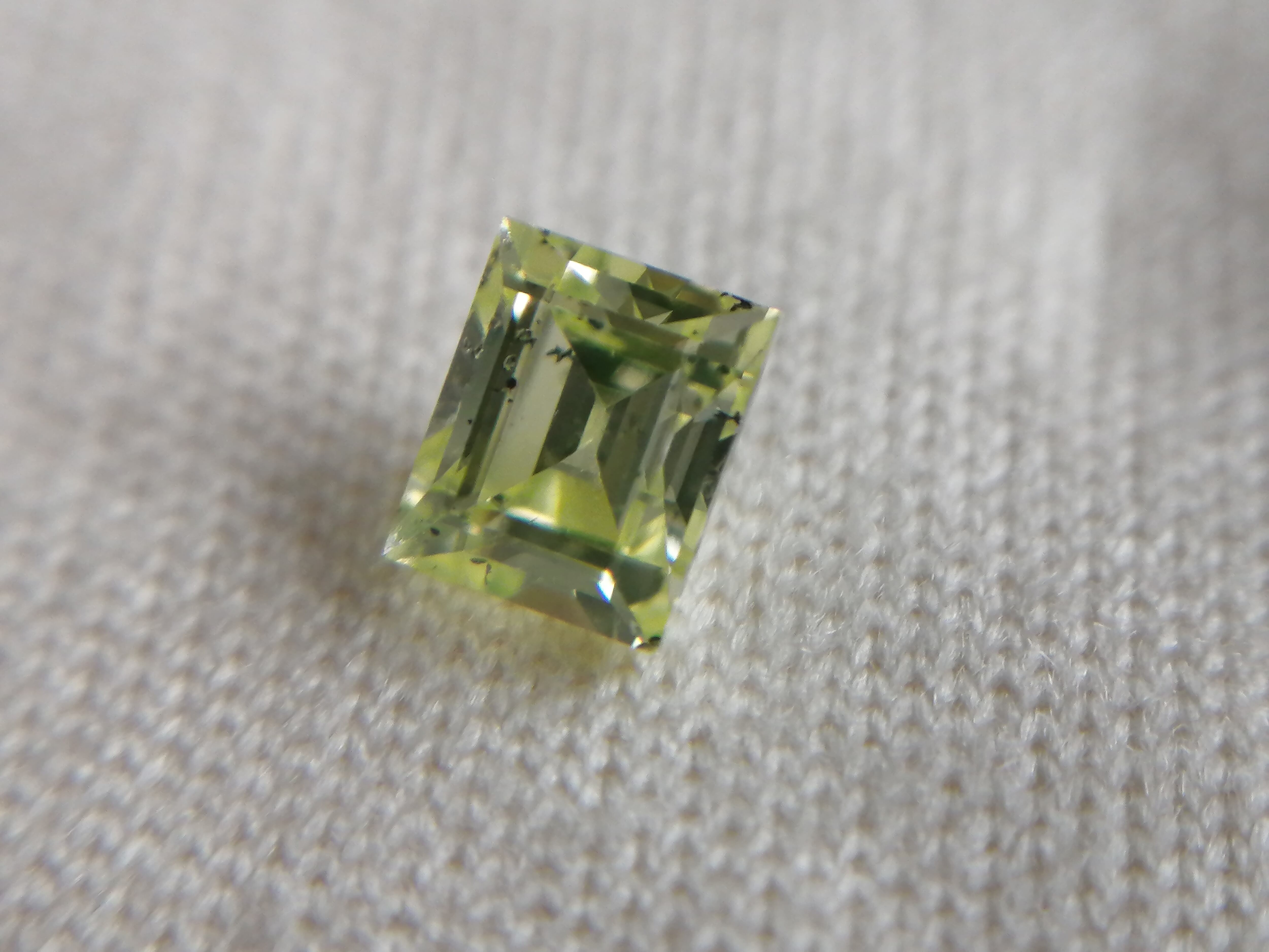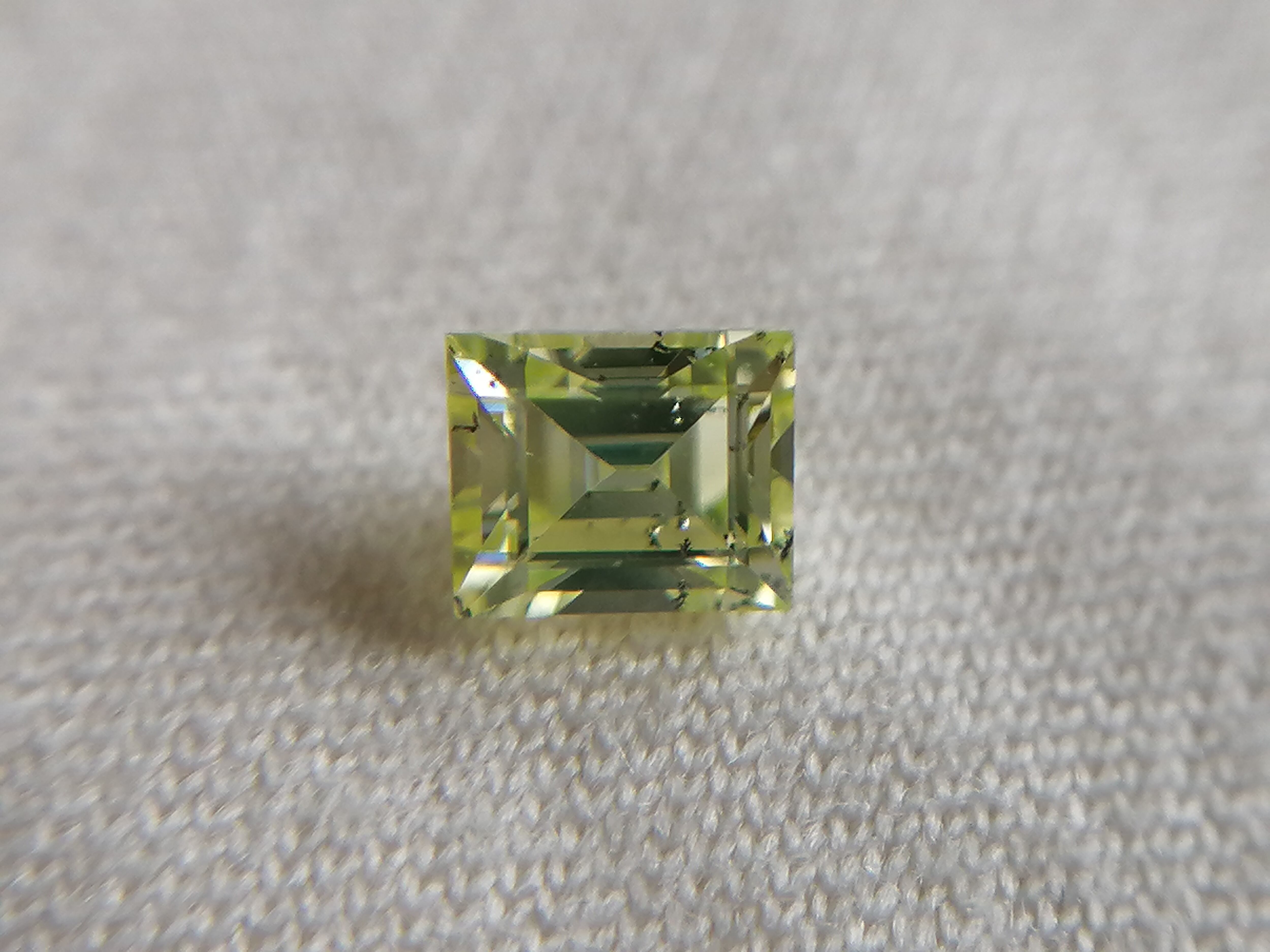 0.216ctは、カットも角を落とし色味もやや黄色味を帯びた優しいふんわりした黄緑色に対し、こちらは直線的でシャープなカット形状がスタイリッシュかつ、緑がやや強めな印象です。