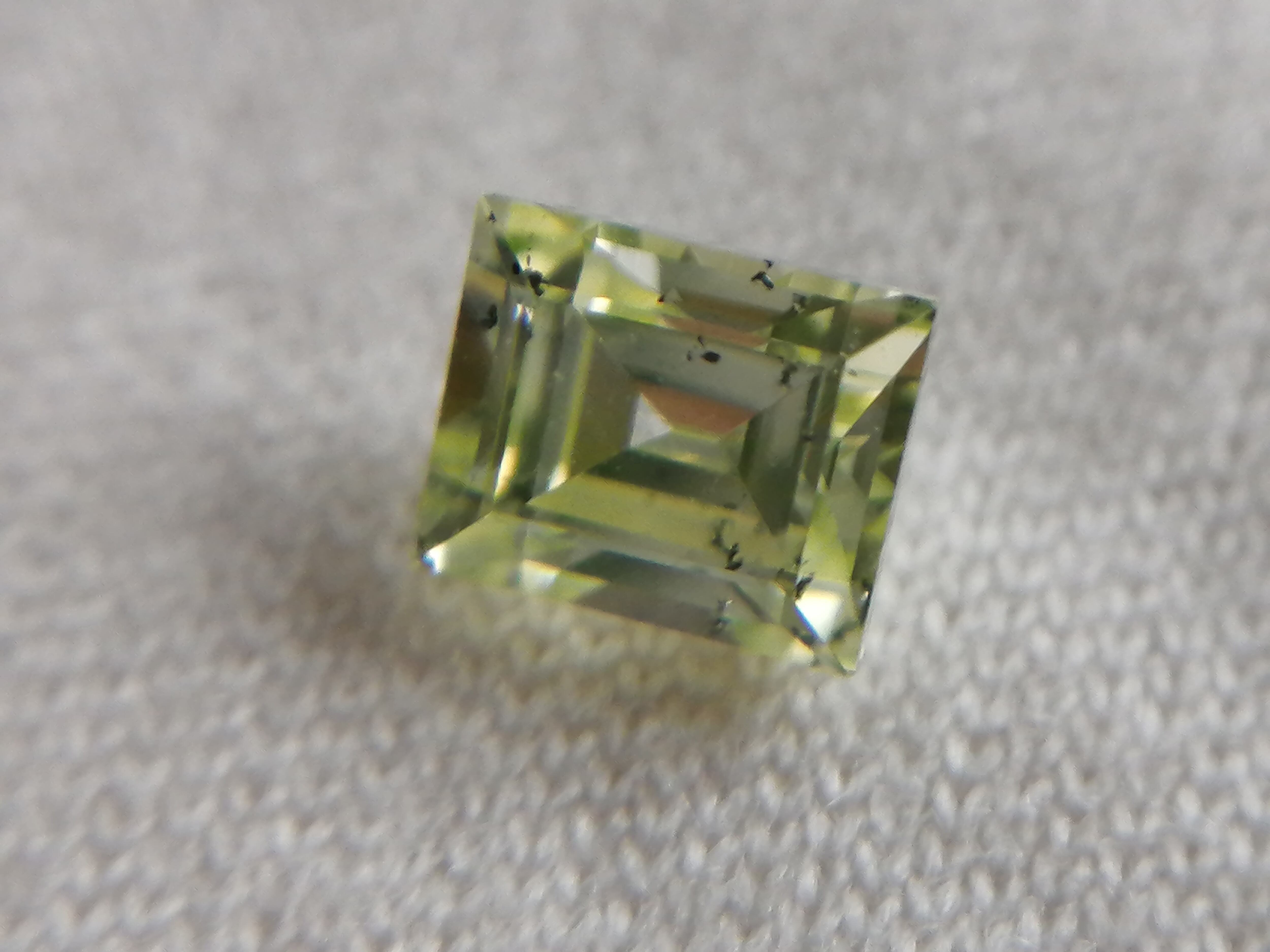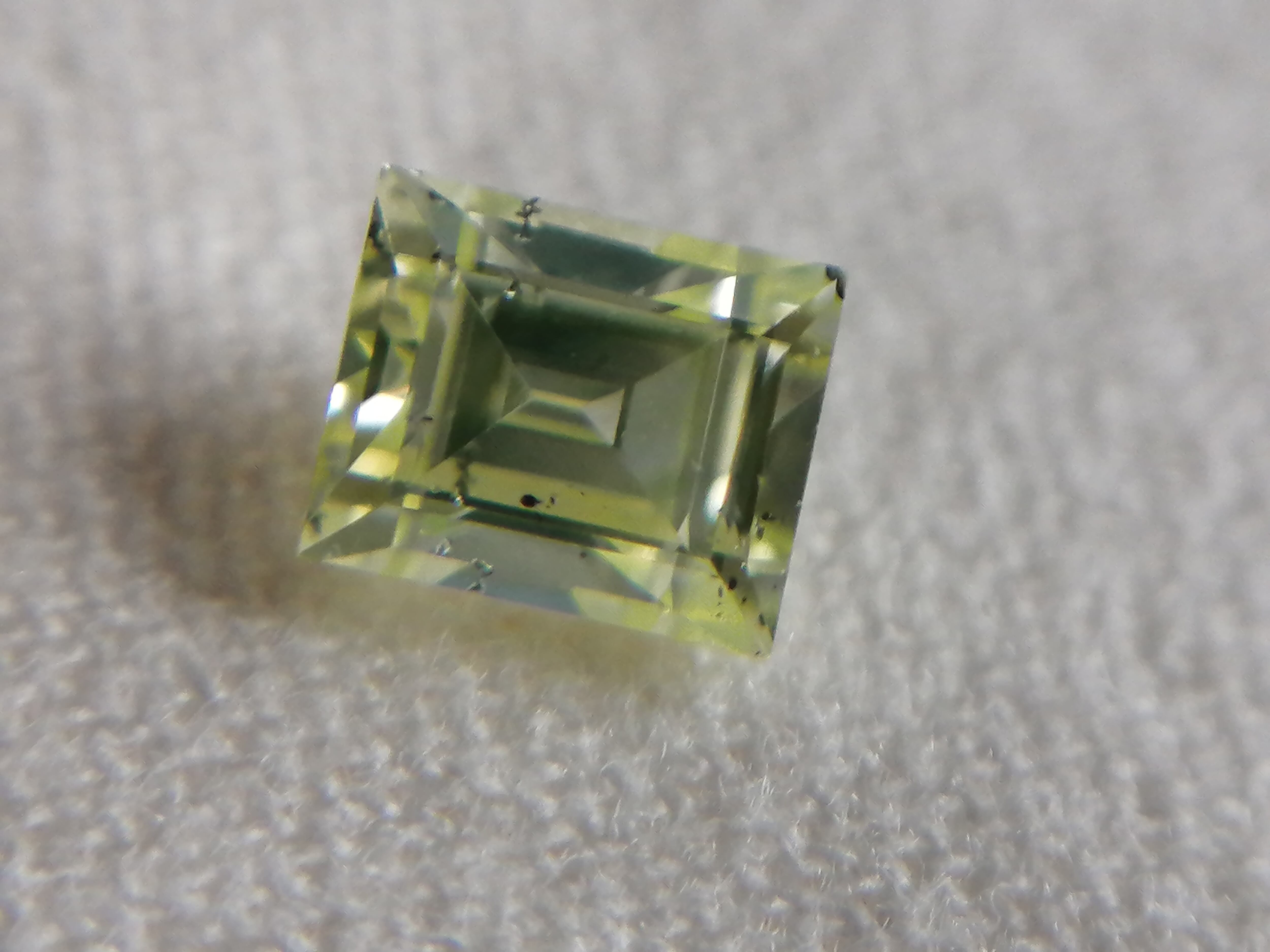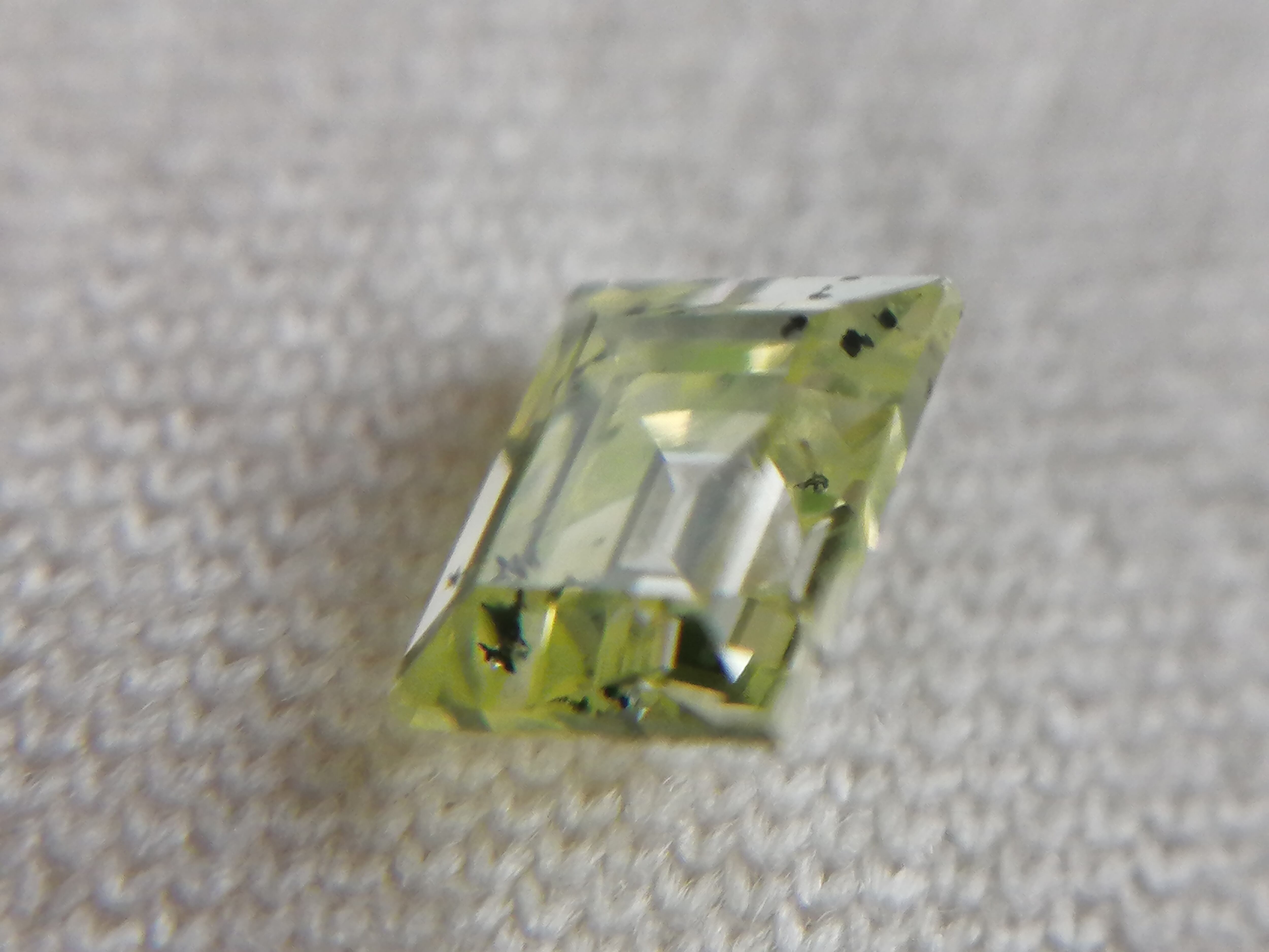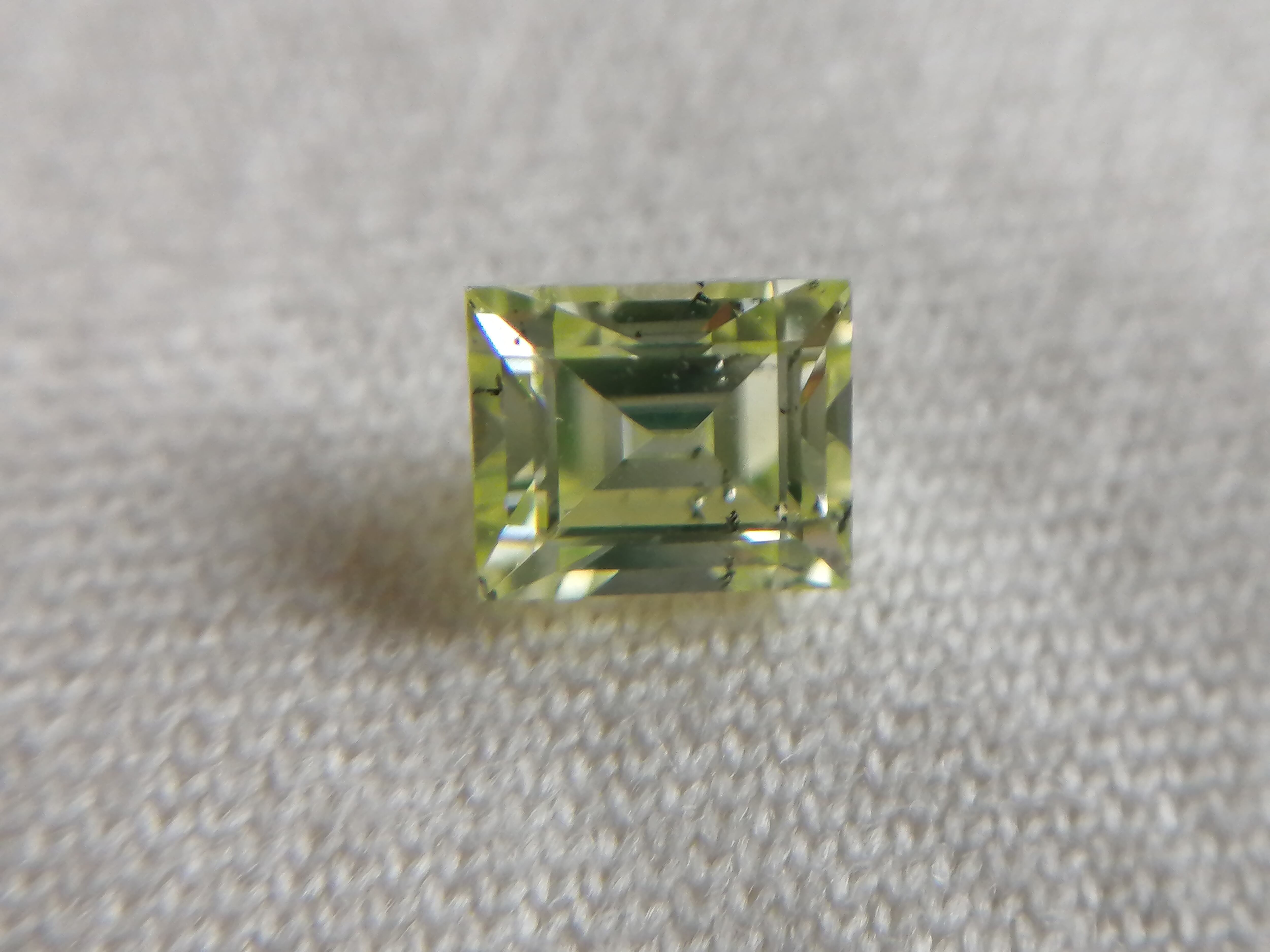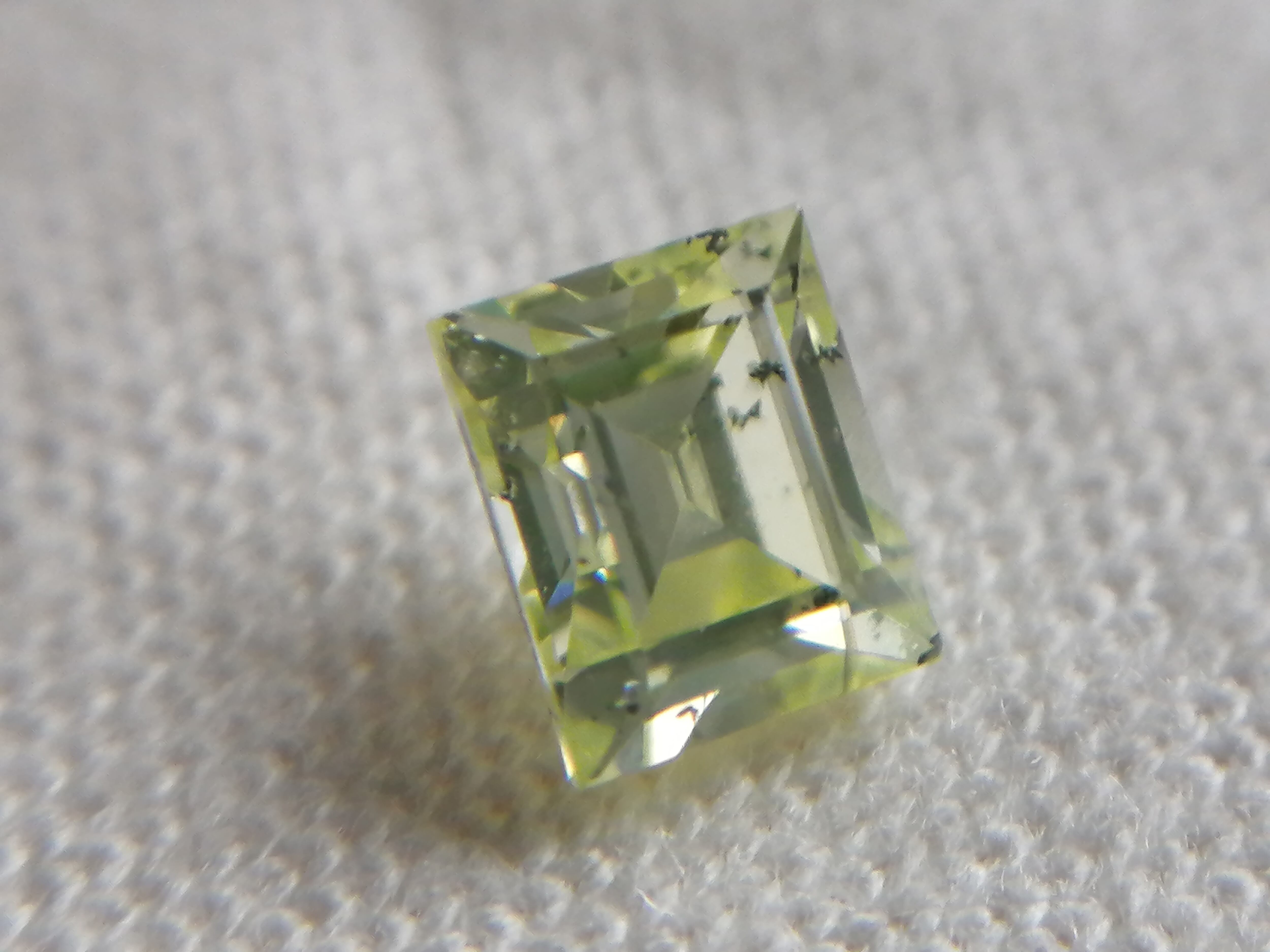 0.216ctは、カットも角を落とし色味もやや黄色味を帯びた優しいふんわりした黄緑色に対し、こちらは直線的でシャープなカット形状がスタイリッシュかつ、緑がやや強めな印象です。