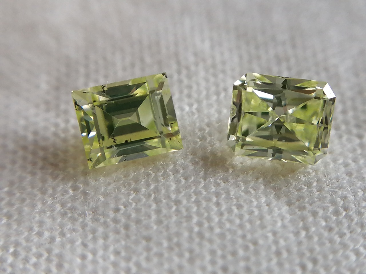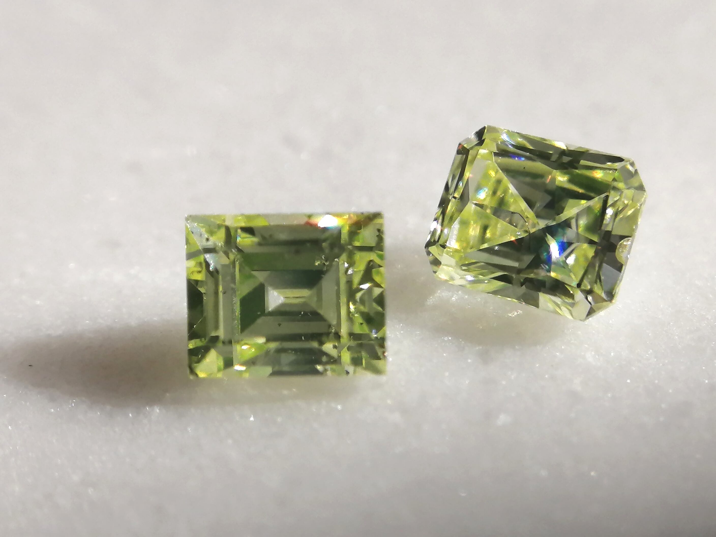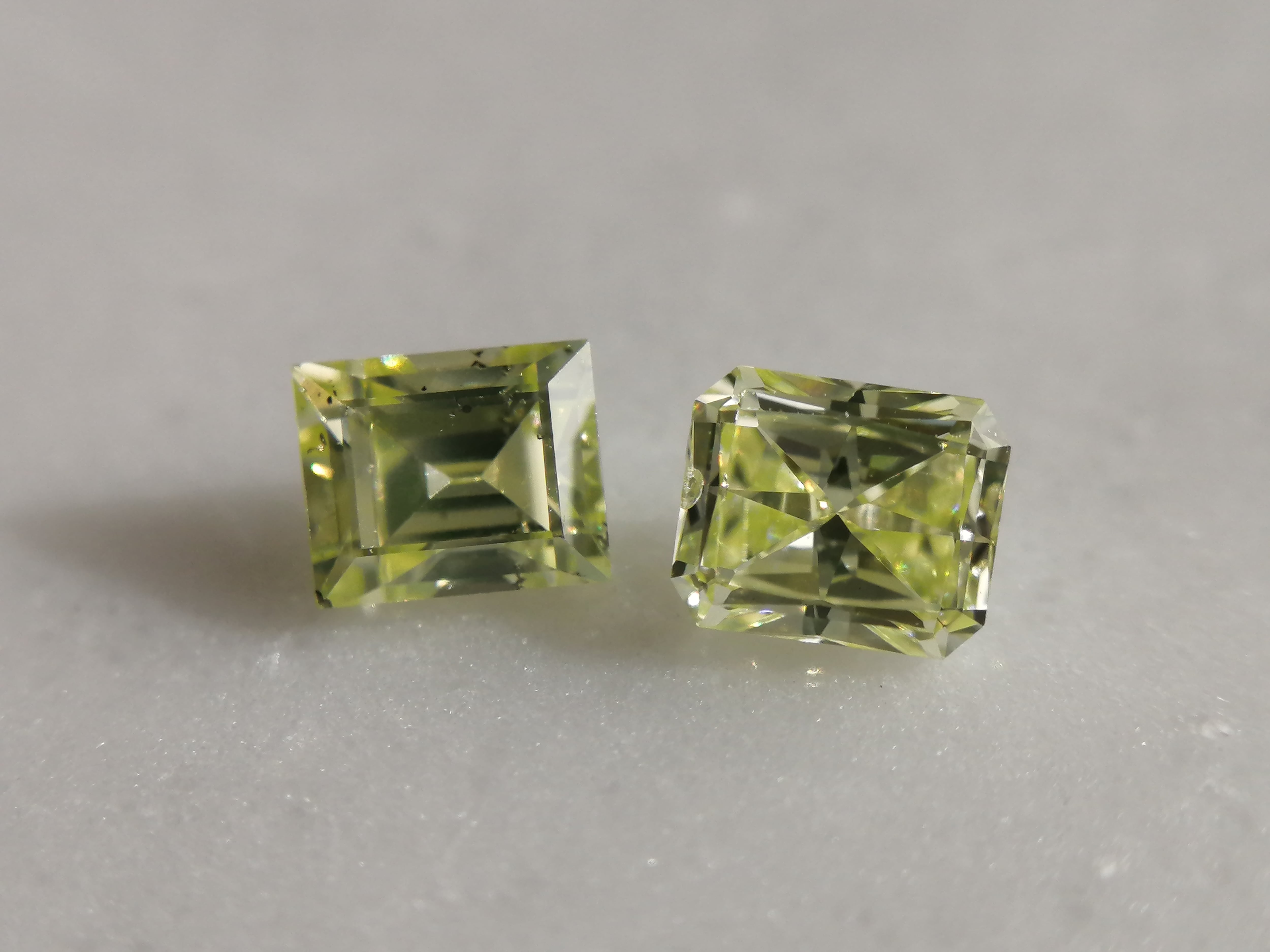 ラウンド一石と、同じレクタンギュラーがこちらと併せ現在二石、ラウンド0.305ct レクタンギュラー0.216ctとの比較。どちらも稀少な大粒、美しいyellow greenです。