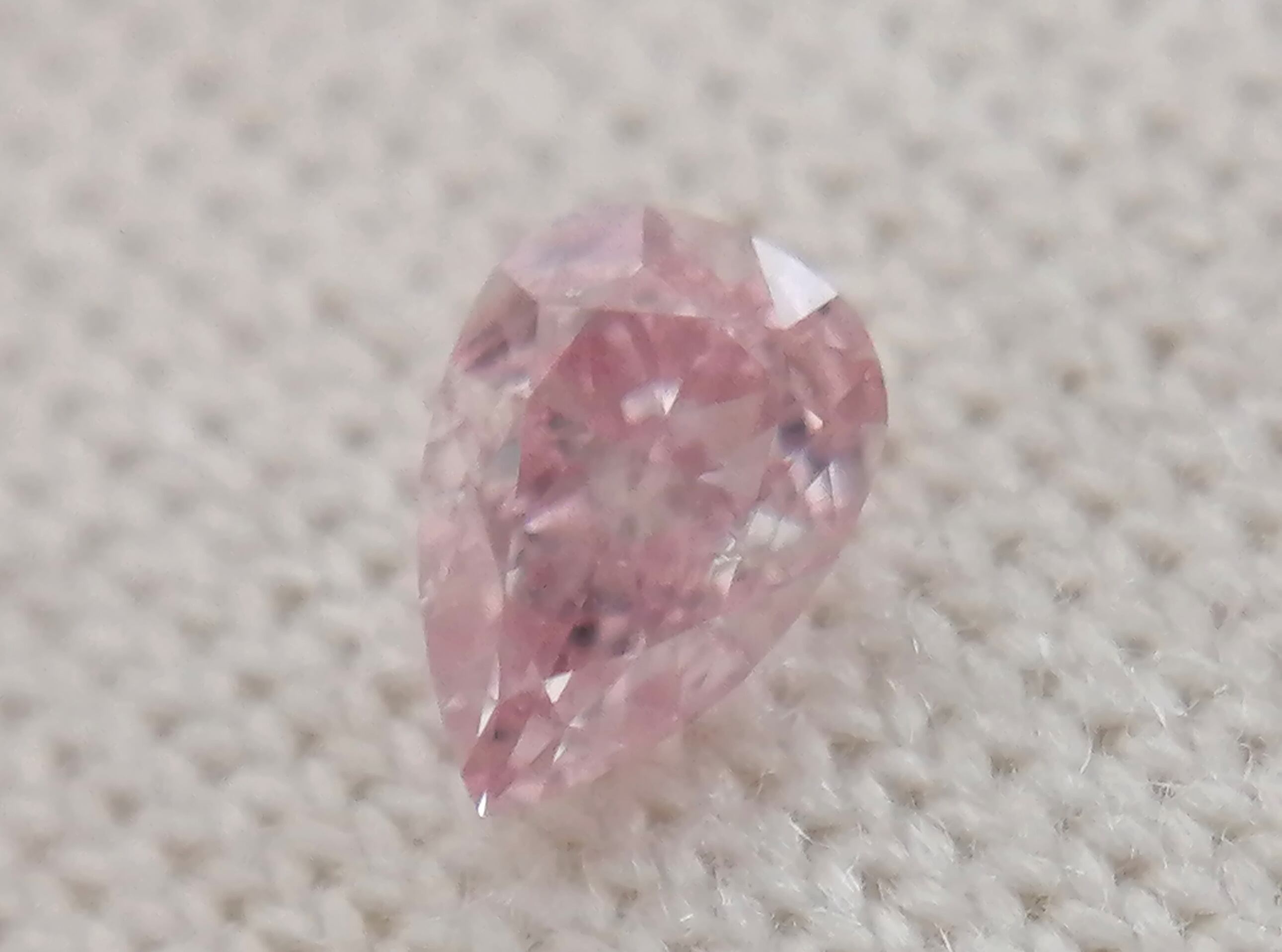 まさにfancy purplish pinkのお手本のような色合い。鮮やかな紫み帯びた華やかなピンクの色合いが、ひじょうに美しい石です。VS2のクラリティもとても魅力的。今回、こちらの8番、9番が見た目のサイズ感似た印象のペアシェイプですが、こちらの8番は9番(バブルガムピンク系統、トップランクの色質)に比べ、だいぶお値打ちです。しかし、purplish pinkとして劣るわけでなく、美しく花丸な色質です。コストパフォーマンス良く、美しいpurplish pinkをお探しの方へ、こちらたいへんオススメです。