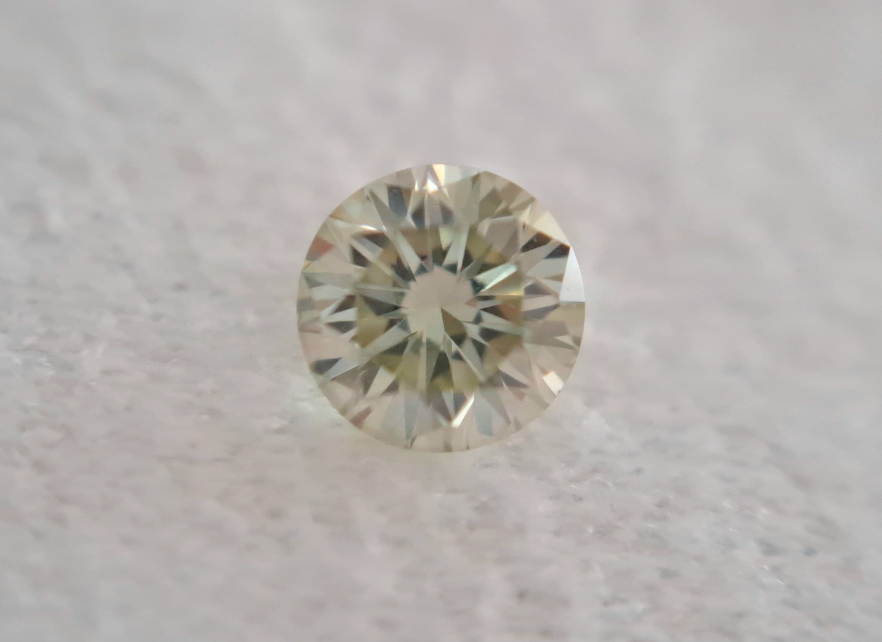 クラリティSI2ですが、ルーペで見ても気になる傷、カーボンは全くなく、何故これがSIなのか不思議なレベルで、正直VSで良いのでないかと思わされるクリアな透明感。石目0.156ct、直径約3.5mmサイズもラウンドのカラーダイヤモンドとしては、かなり大粒の類でカットも良好です。カラー(色ノリ)、クラリティ(傷けの無さ、透明感)カットバランスと、トータルでひじょうにバランスの優れた美しいダイヤモンドです。
