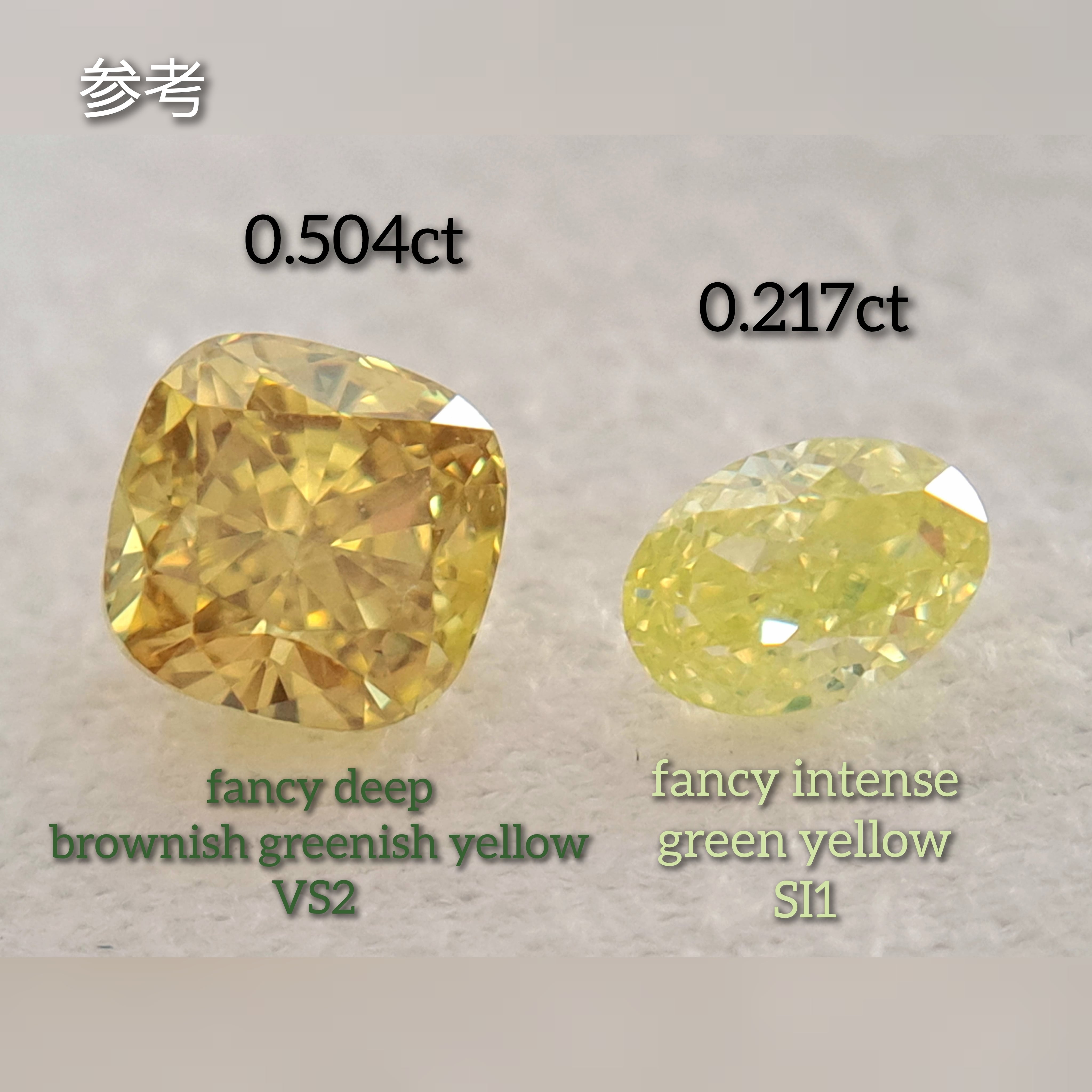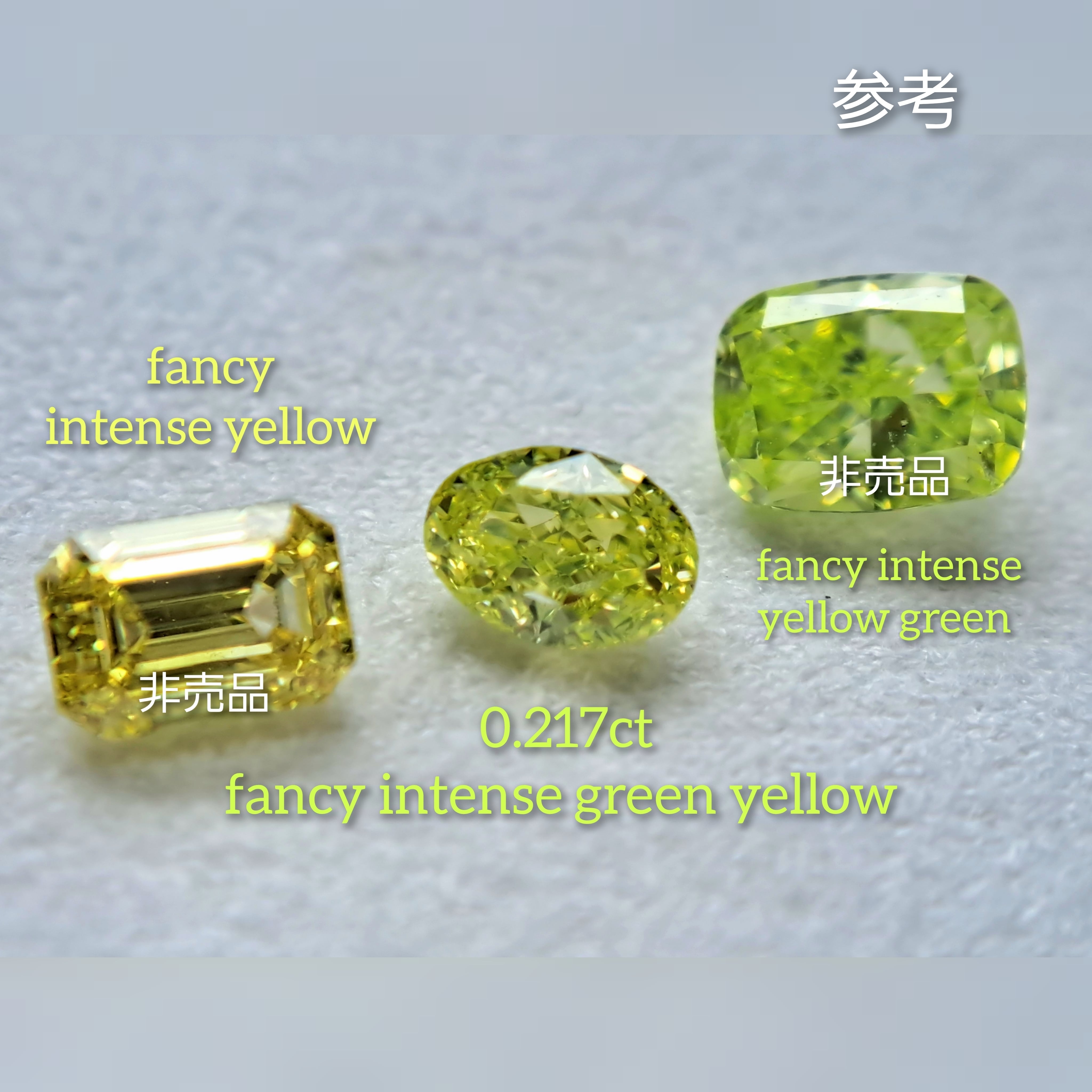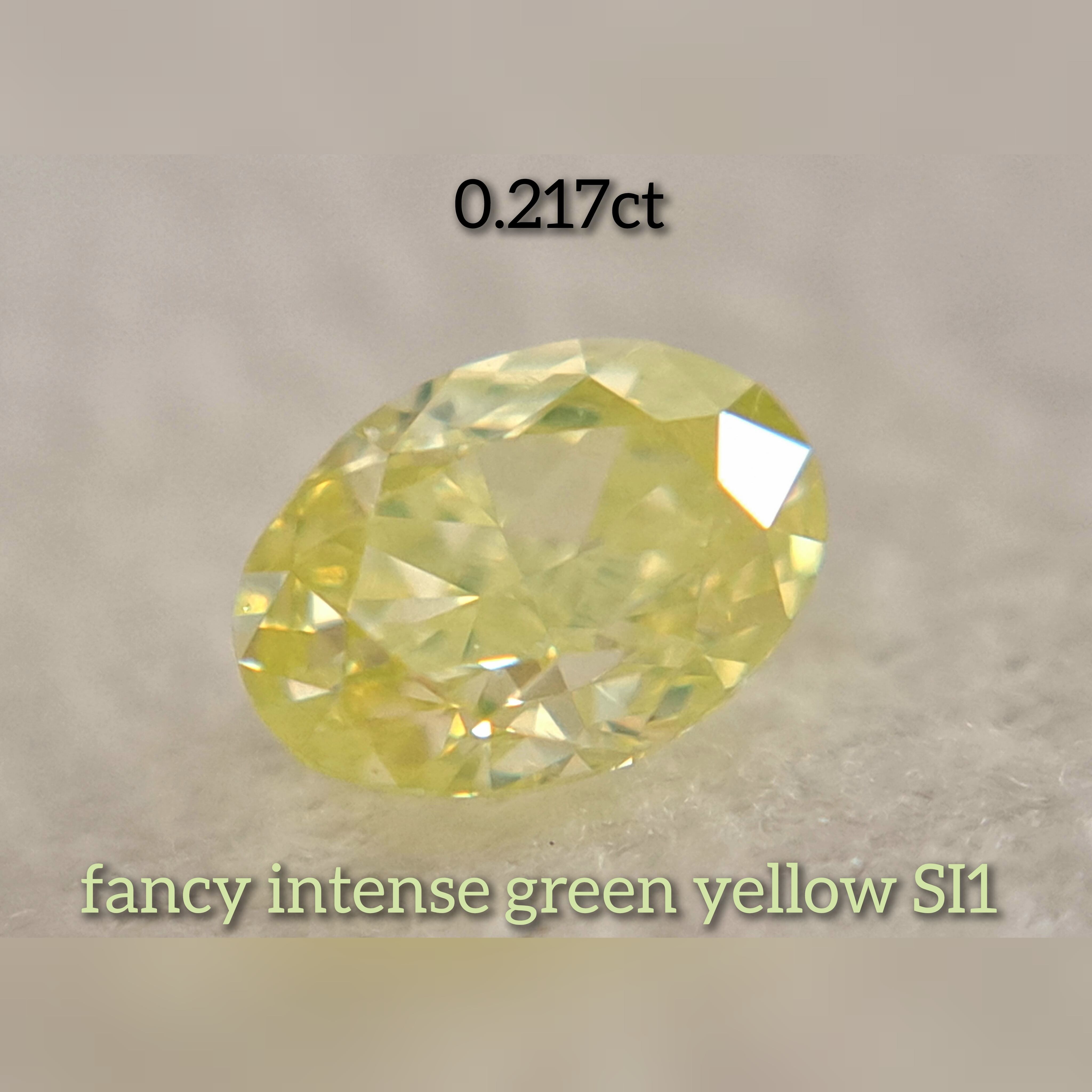 0.2ct超えのサイズ感も優秀です!末尾グリーンの0.2ctは、仮にあったとしてこの価格では買えないと思います。紙のグレード表記に強い拘りのある方にはオススメできませんが、そうしたことより実際の「色の美しさ」を重視する方には、「緑の強い」黄緑色のシャルトリューズグリーン系のfancy intense green yellow 0.217ct SI1 とても綺麗な色合いでオススメです!!