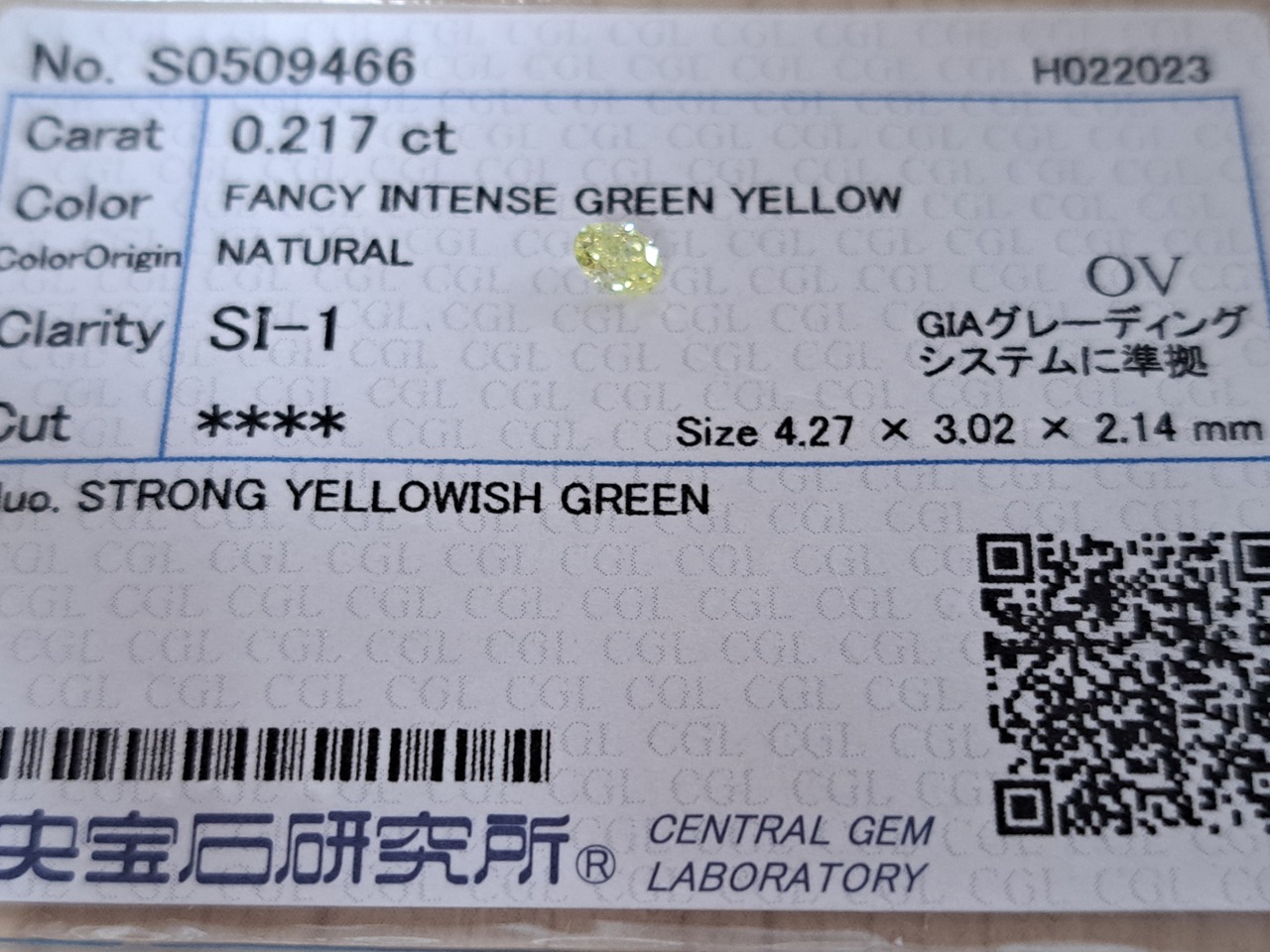 【商品名】グリーンイエローダイヤモンドルース 0.217ct fancy intense green yellow SI1(CGL)