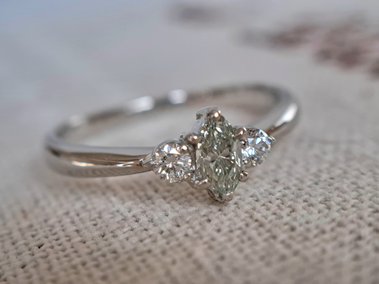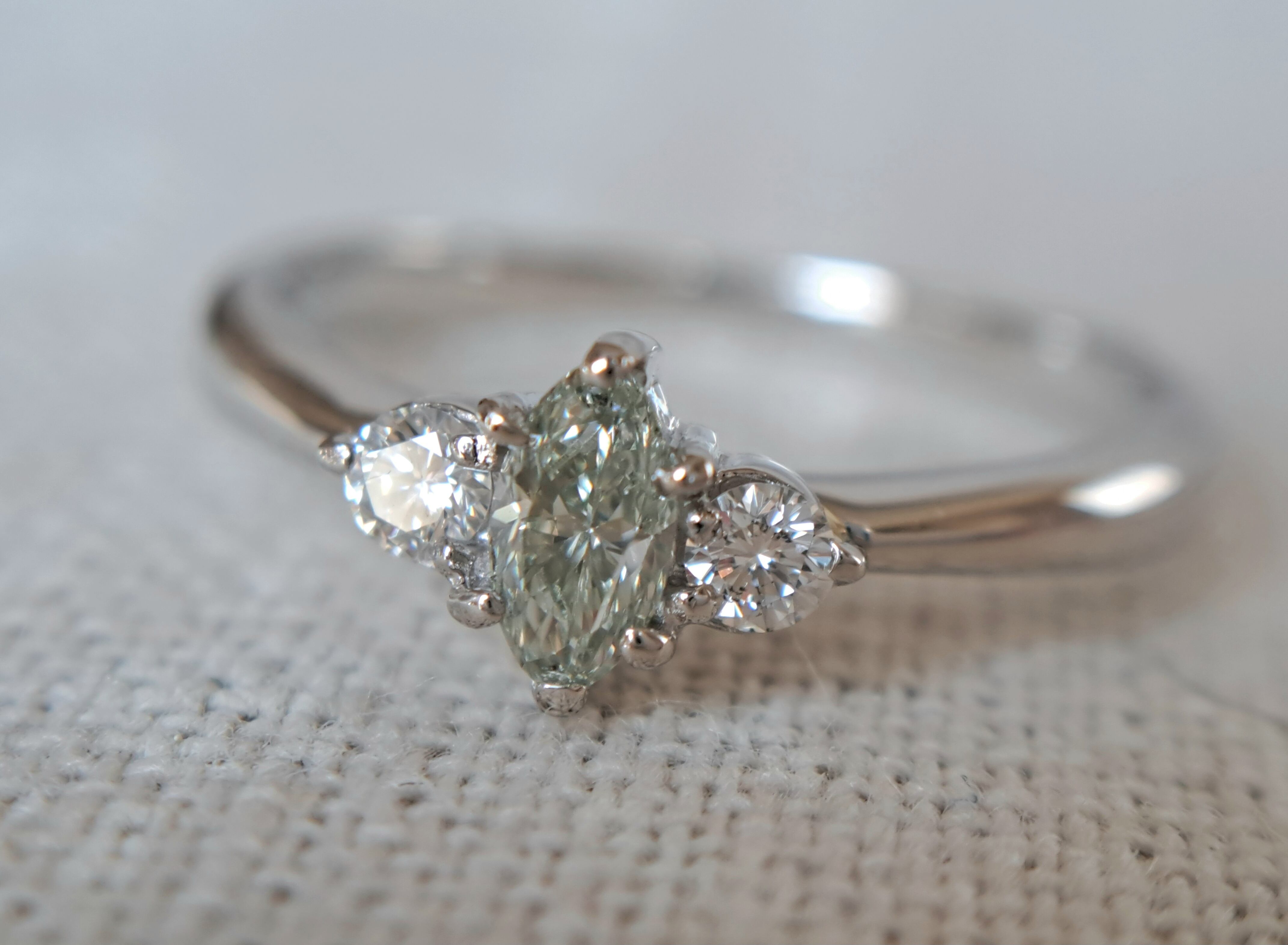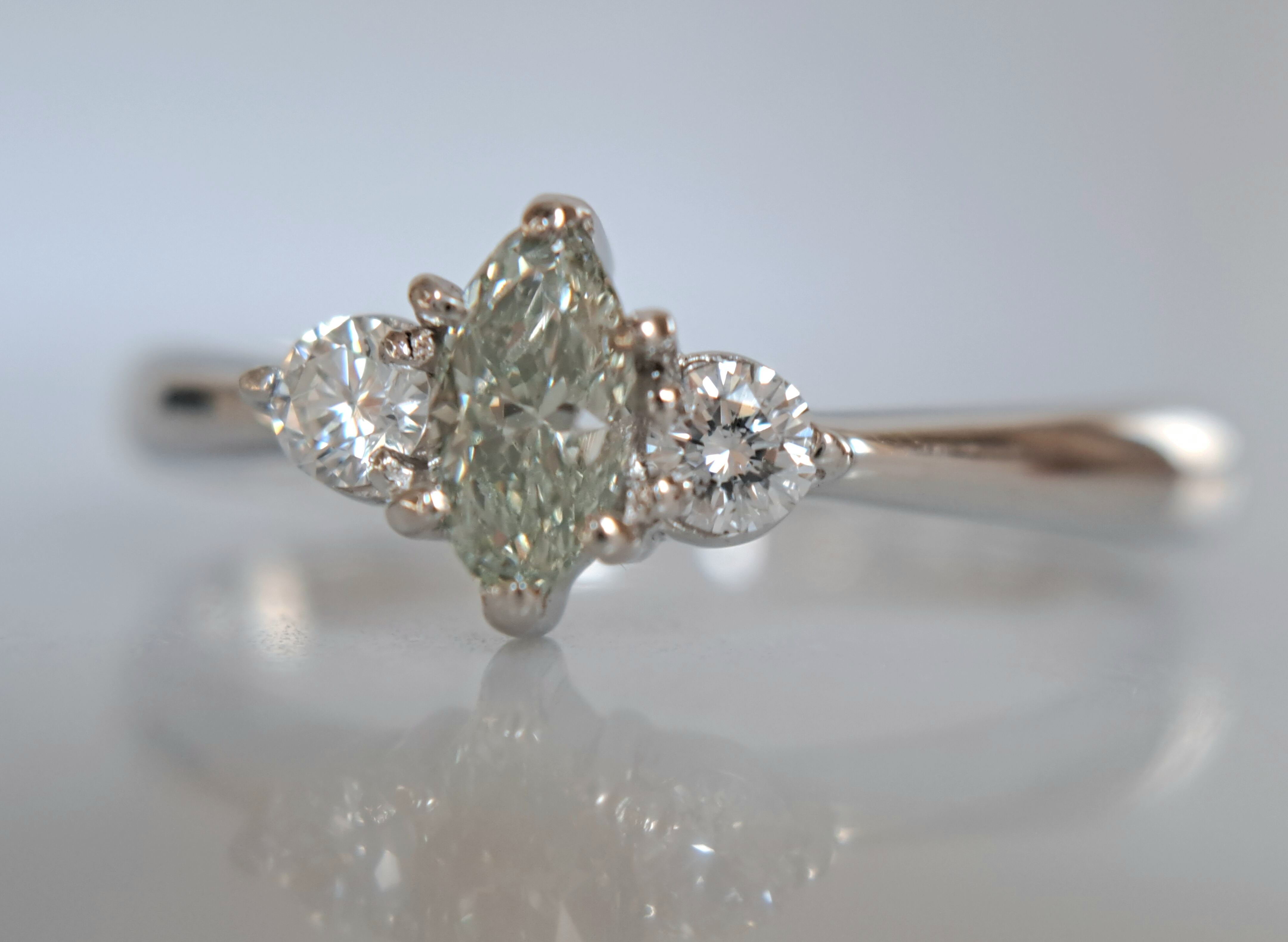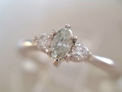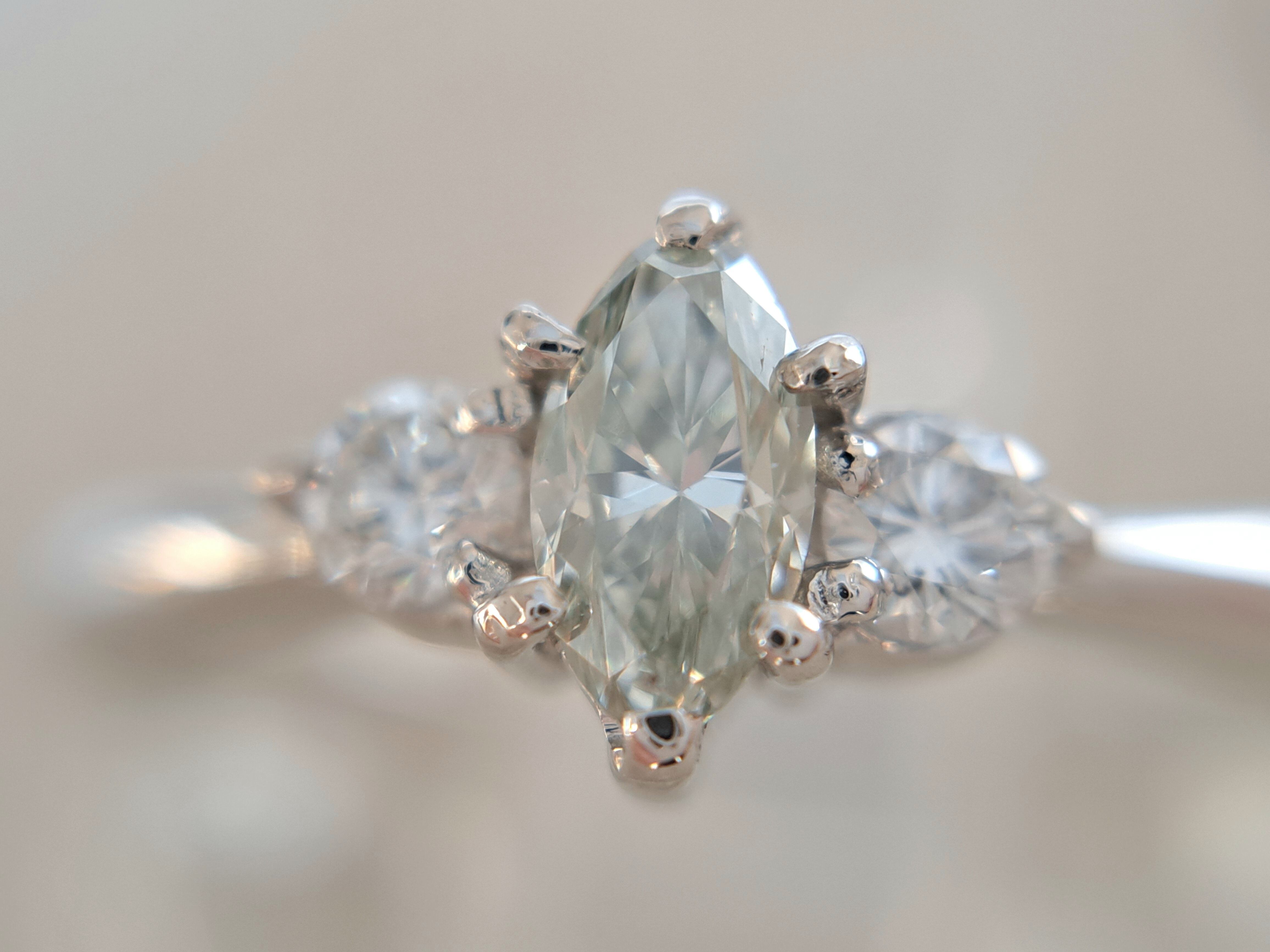 0.226ctとカラーダイヤの中ではかなり大粒な石になります。マーキースのため、縦径約5.7mmと、見た目のボリュームもじゅうぶん。クラリティSI1ですが、拡大で気になる傷はほぼ見当たりません。透明感に満ち溢れ、すっきりした印象の優秀な生地感。