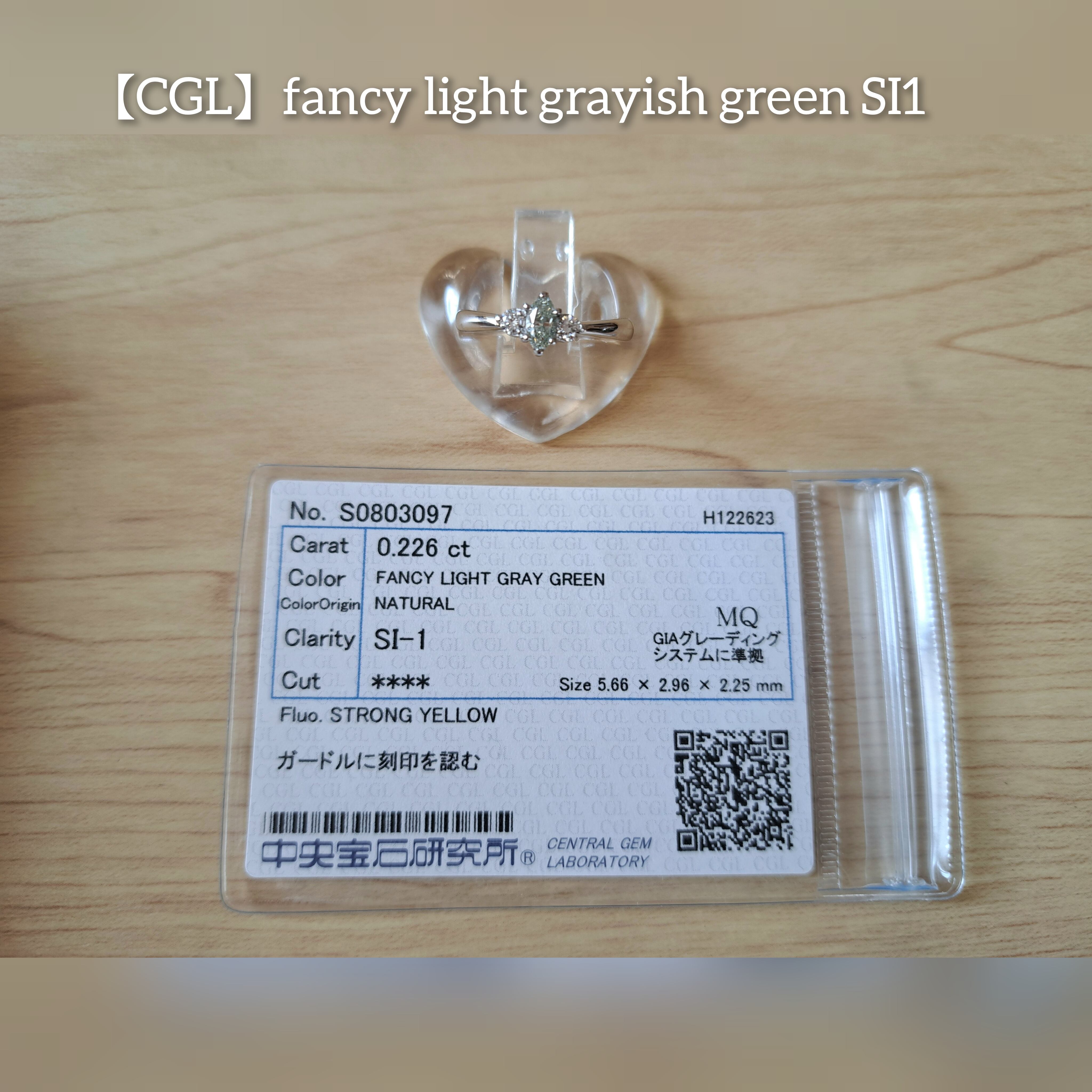 GIAはgrayish green、CGLはgray greenとどちらもグレーを噛む評定ですが、個人的にはグレーが強すぎる感じもなく、明らかに緑が勝っておりますので、gray greenよりも、「grayish green」が妥当でないかと考えます。