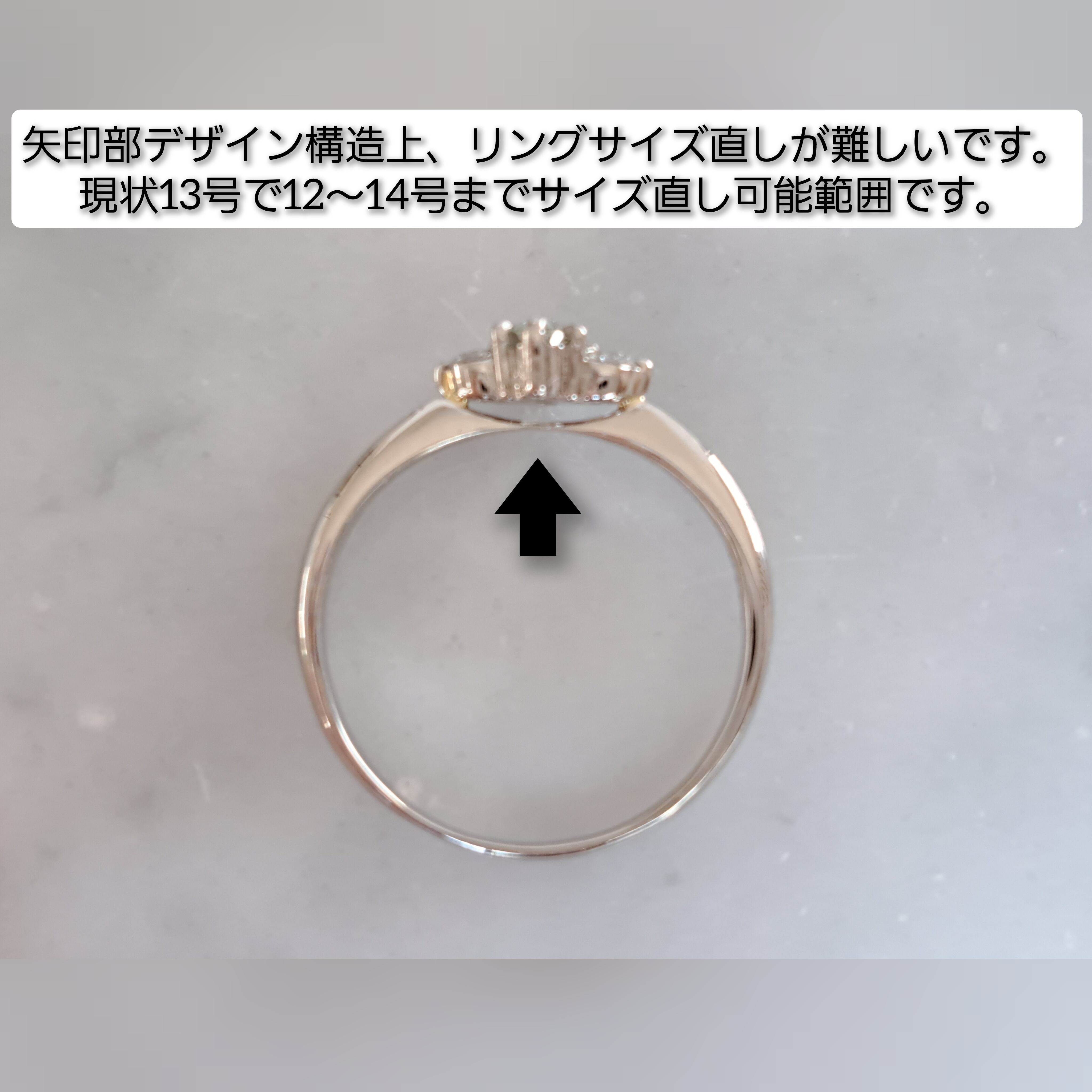 尚、こちらは現状13号ですが、画像に載せたよう、サイズ直しが難しい構造となっております。よって、推奨お直し可能範囲は「+-1号限定」、12~14号のみ(ハーフサイズ可)となります。