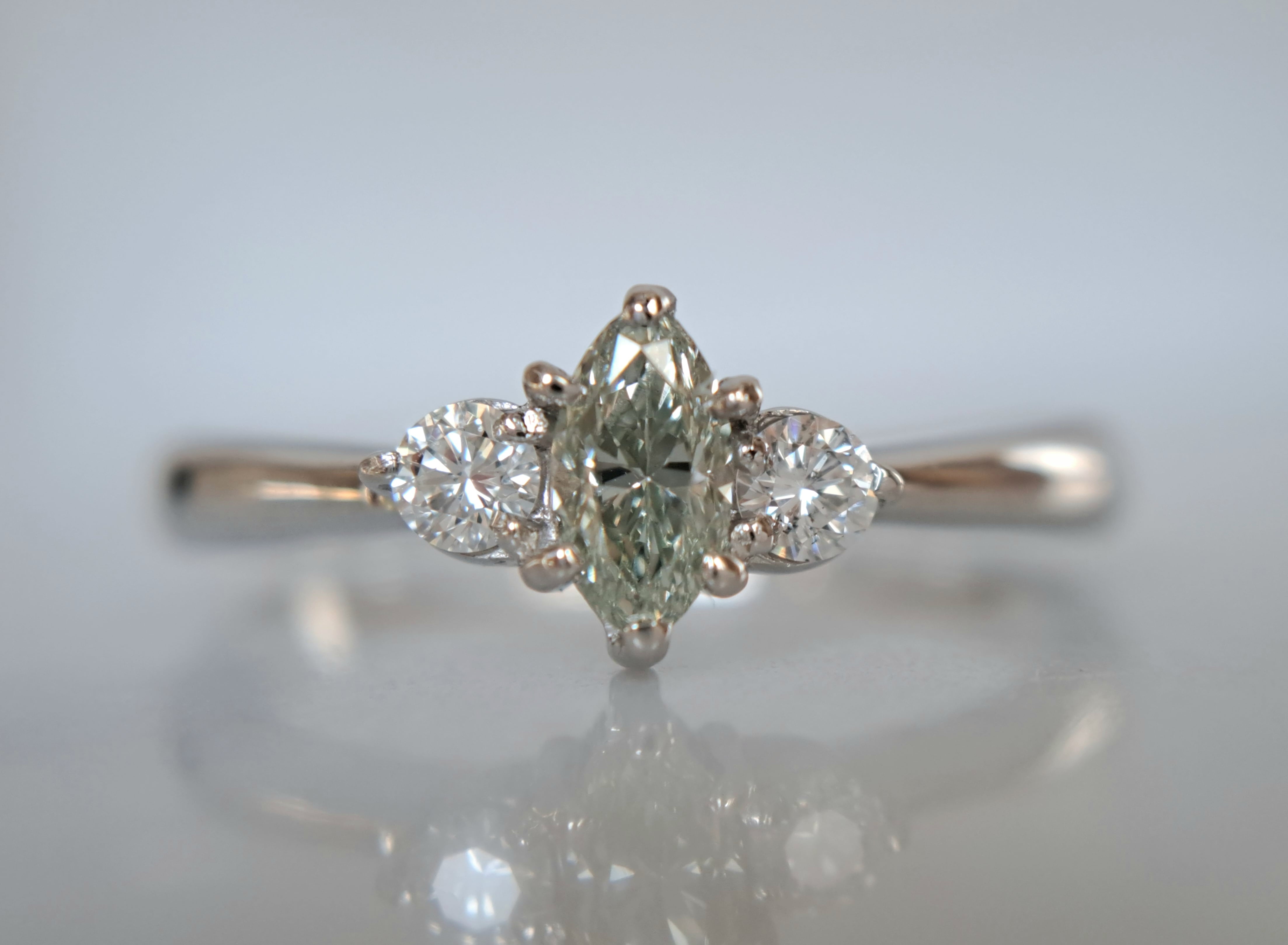 柔らかみのあるグリーンですが、不思議と時折青みも感じさせるとても魅力的なダイヤです。