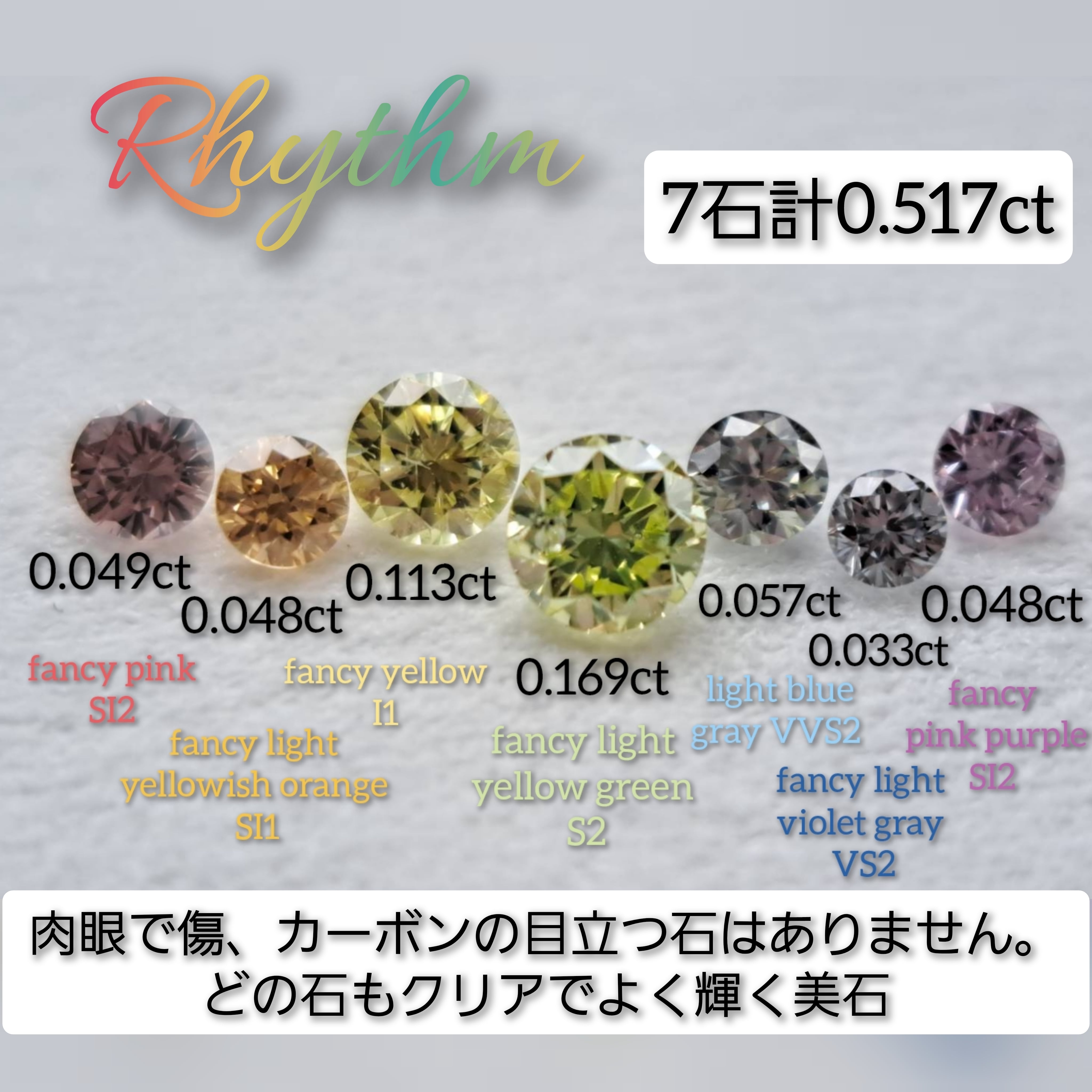 サイズ揃いに拘らずも、現状カラーダイヤでますます減少しつつある稀少かつ人気の高いラウンドで、とことん美しい「虹色」に拘った企画がこちらの「rhythm」です。