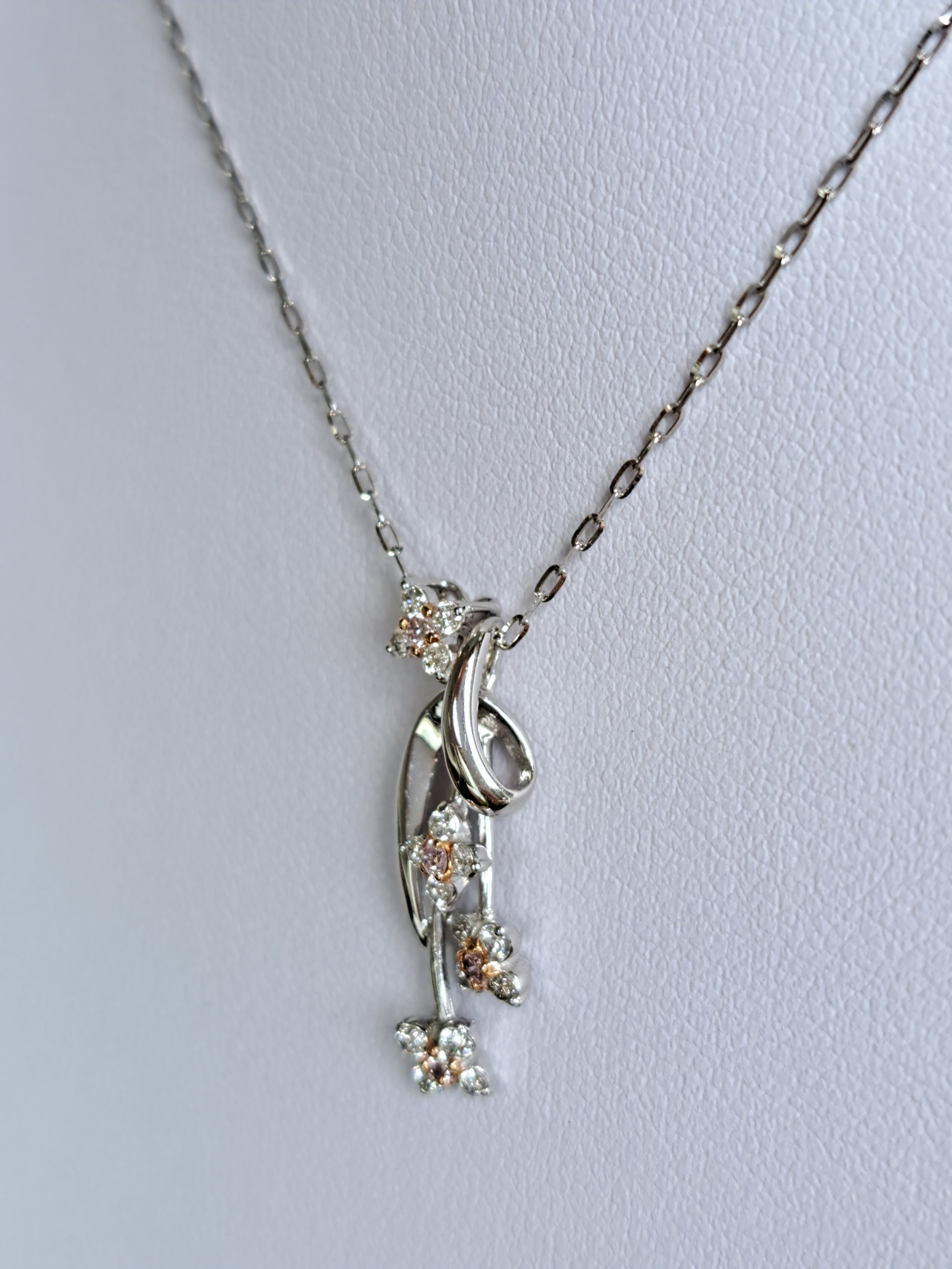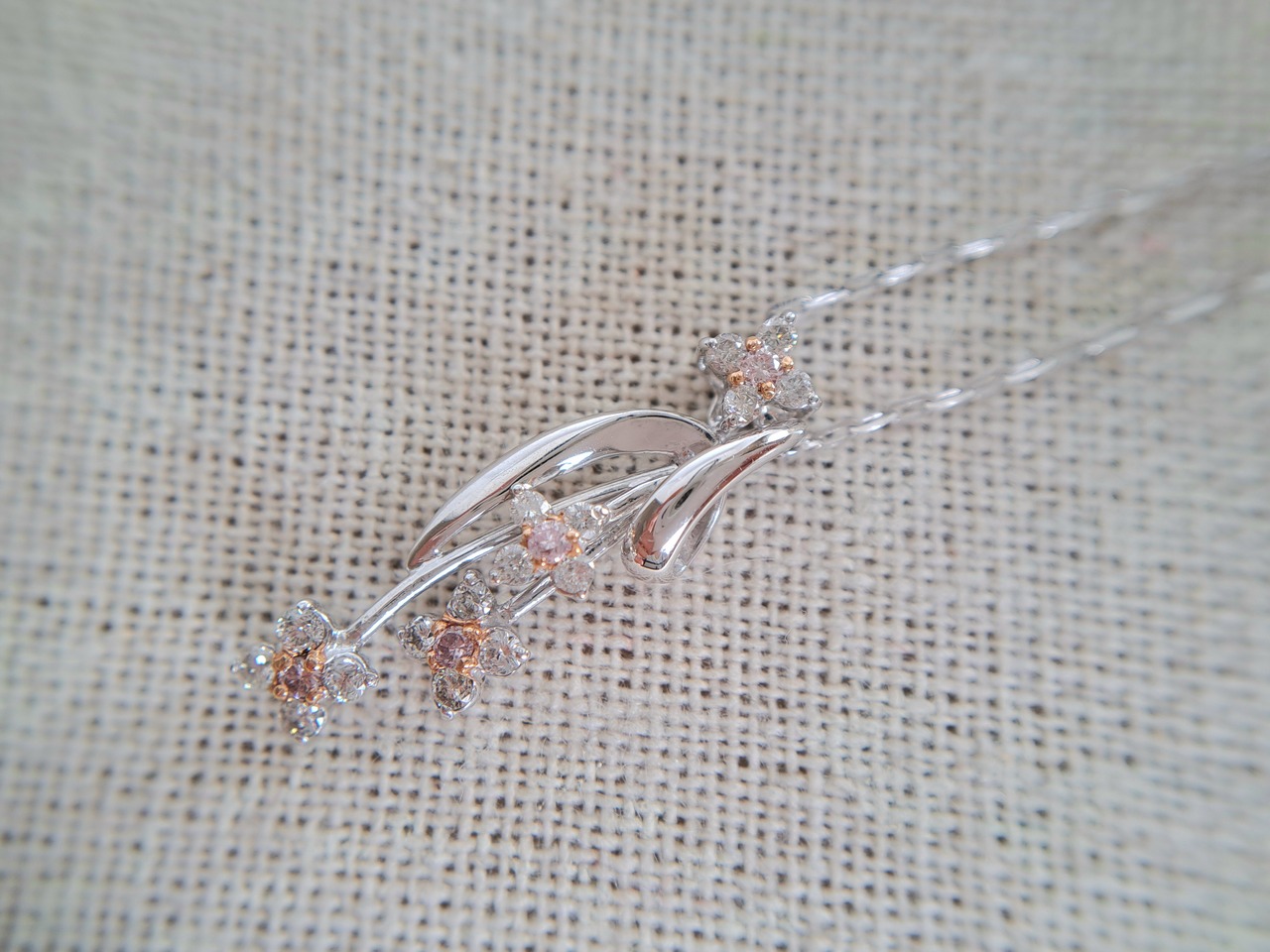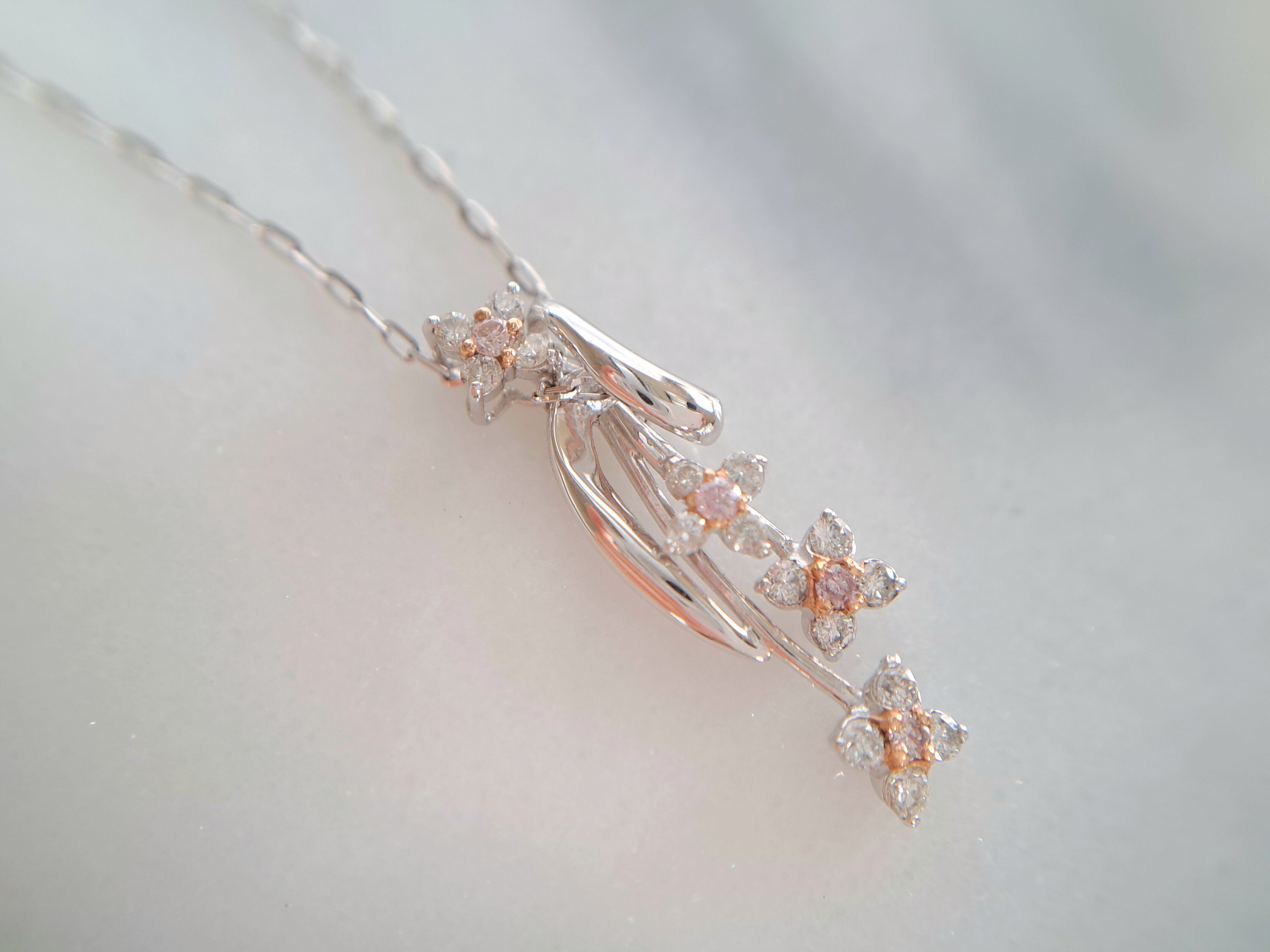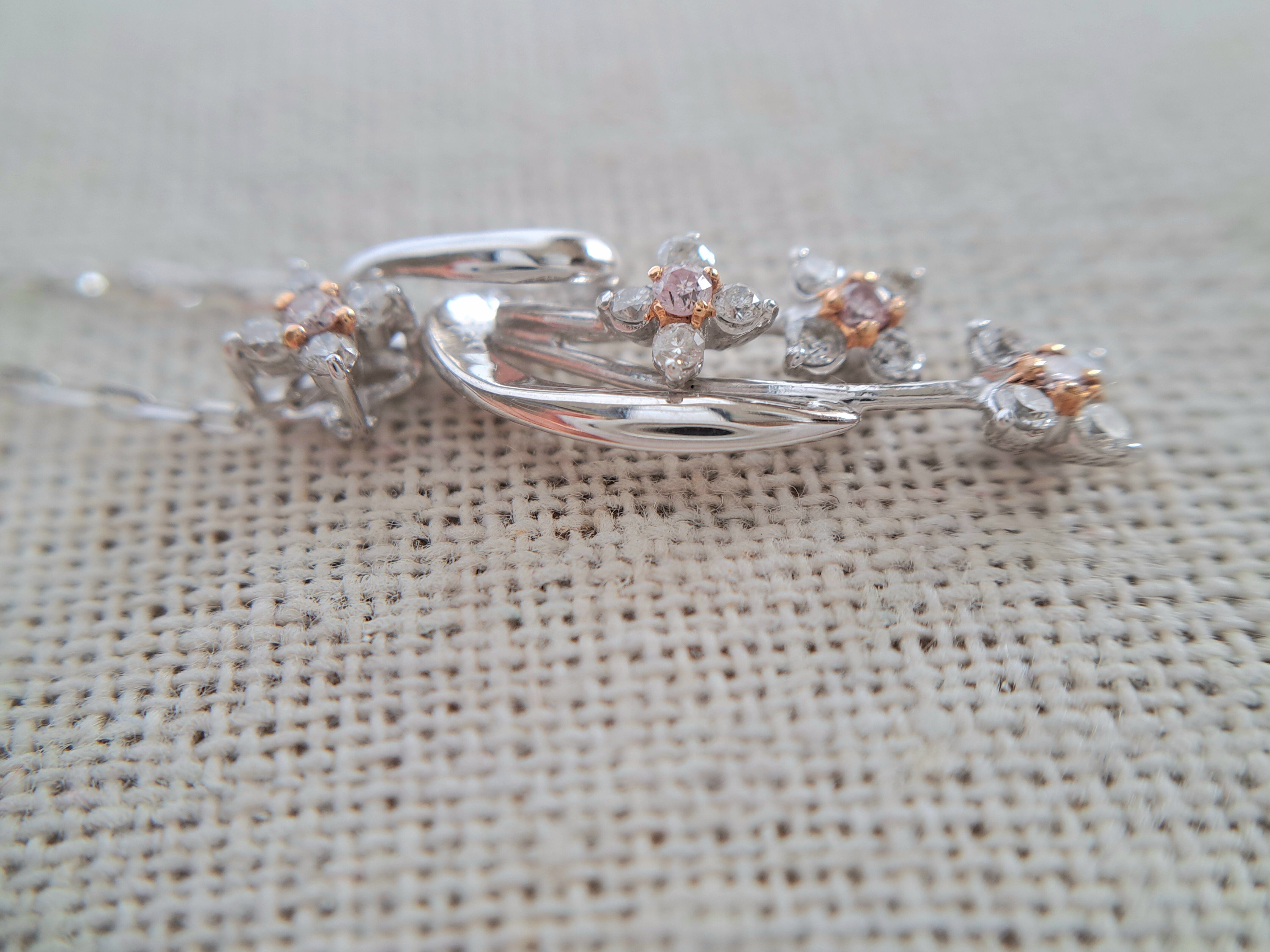 流れるようなフラワーたちのフラワーにピンクダイヤ。(ピンクダイヤを留める爪にはPGメッキをあしらい、ピンクダイヤの色合いをより引き立てます)