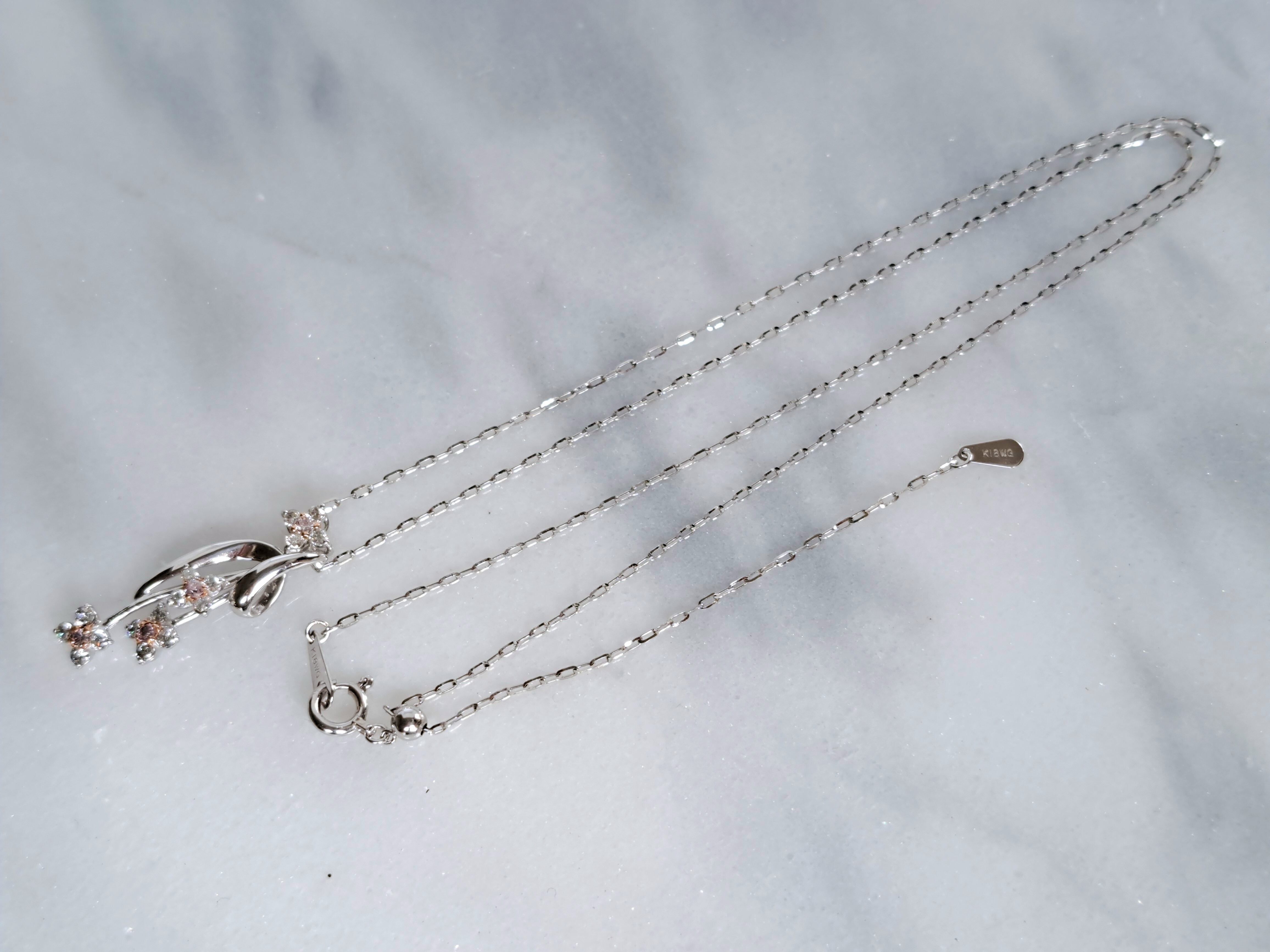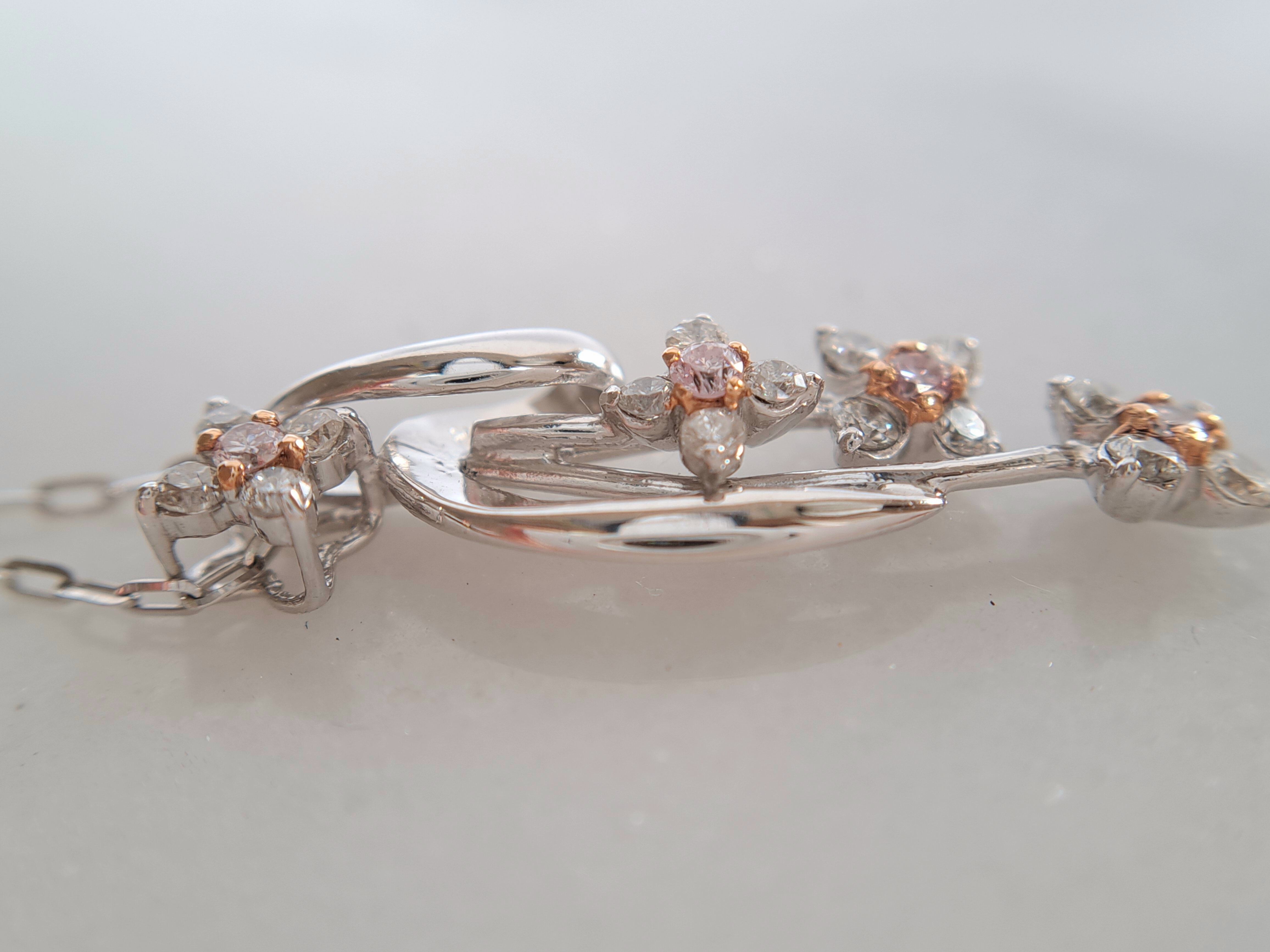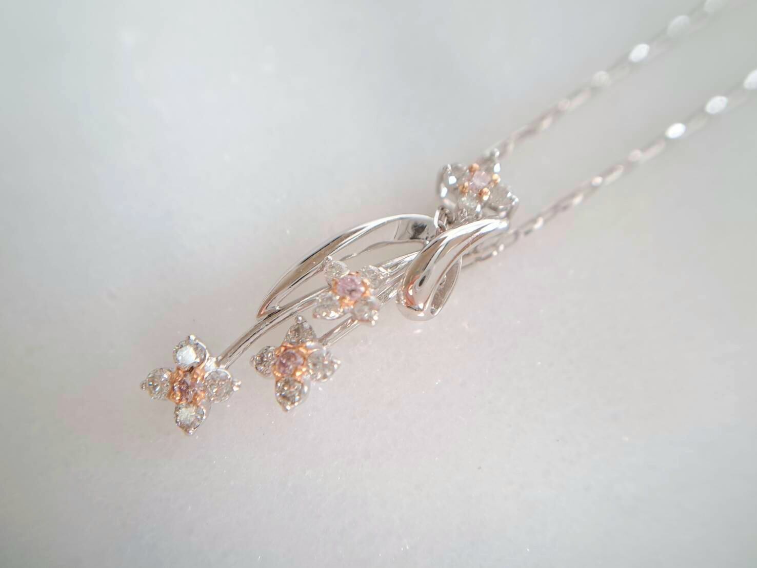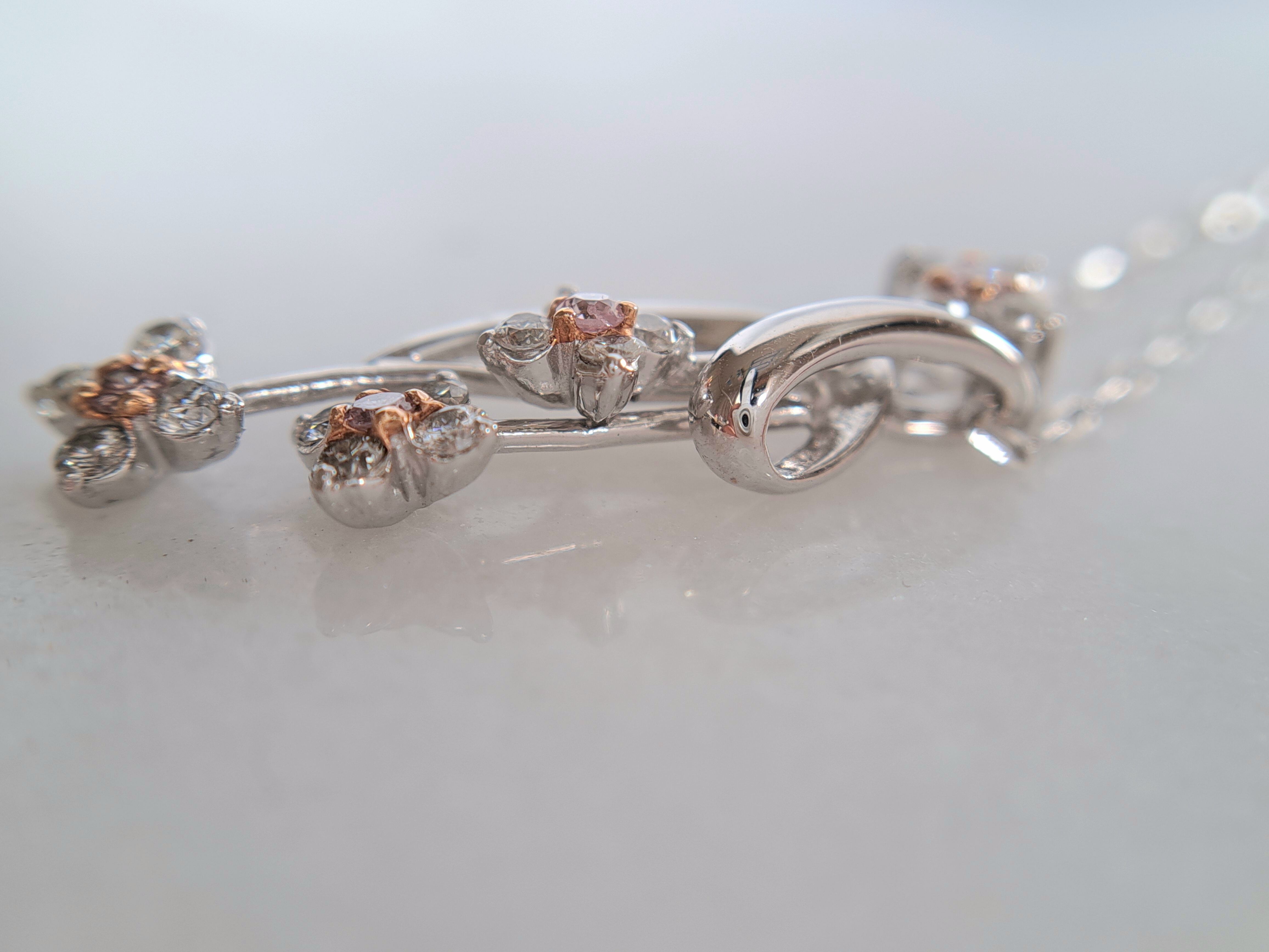 流れるようなフラワーたちのフラワーにピンクダイヤ。(ピンクダイヤを留める爪にはPGメッキをあしらい、ピンクダイヤの色合いをより引き立てます)
