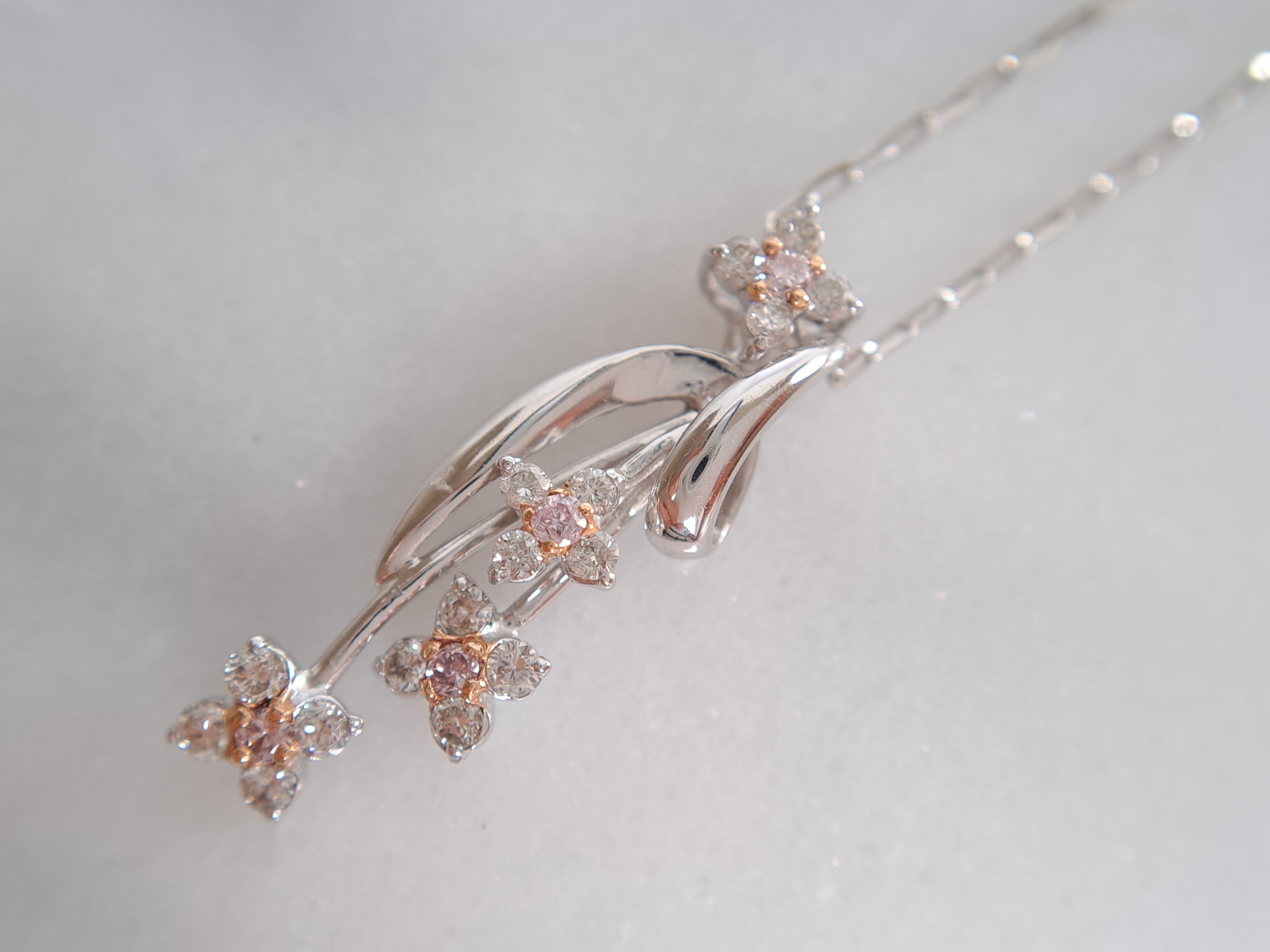 しっかりとした重量感とサイズ感、存在感抜群のペンダントネックレス。とても小さなピンクダイヤがフラワーのセンターに4石あしらわれていますが、一見して「ピンク」であると誰もがわかる色合い